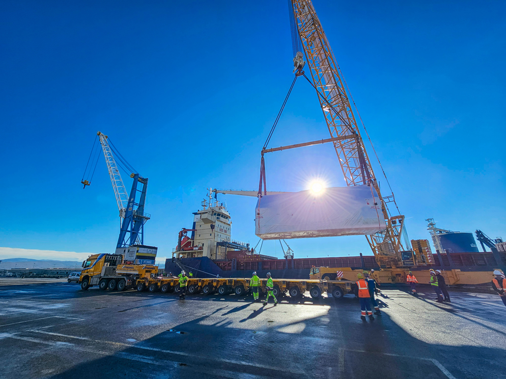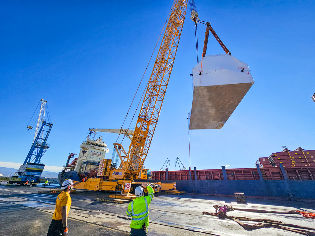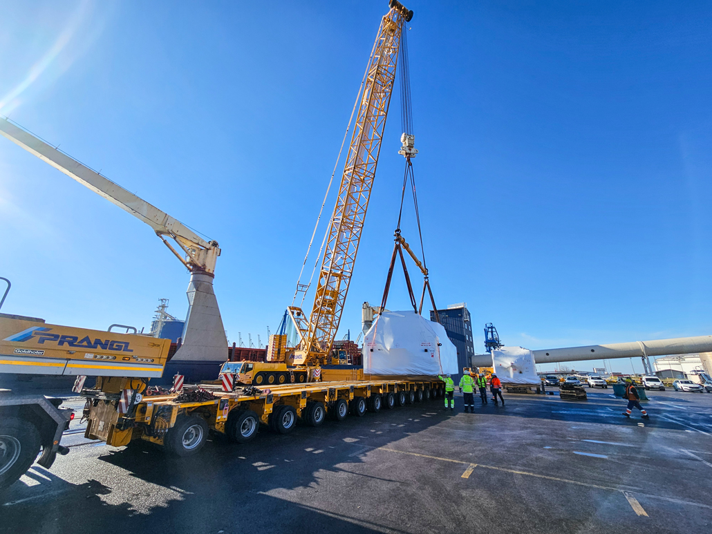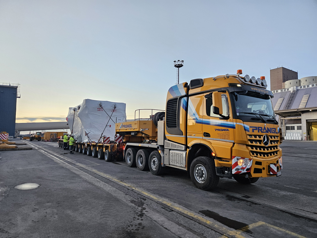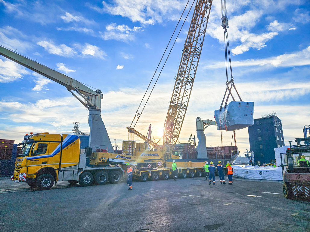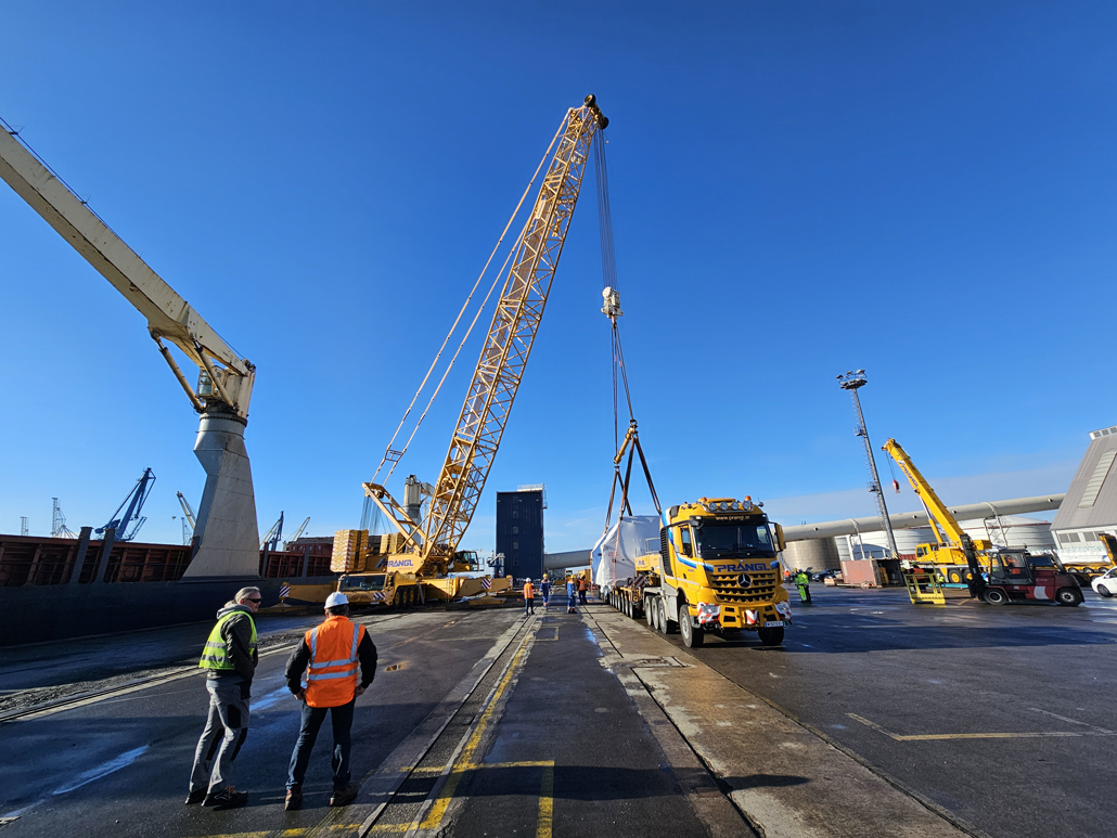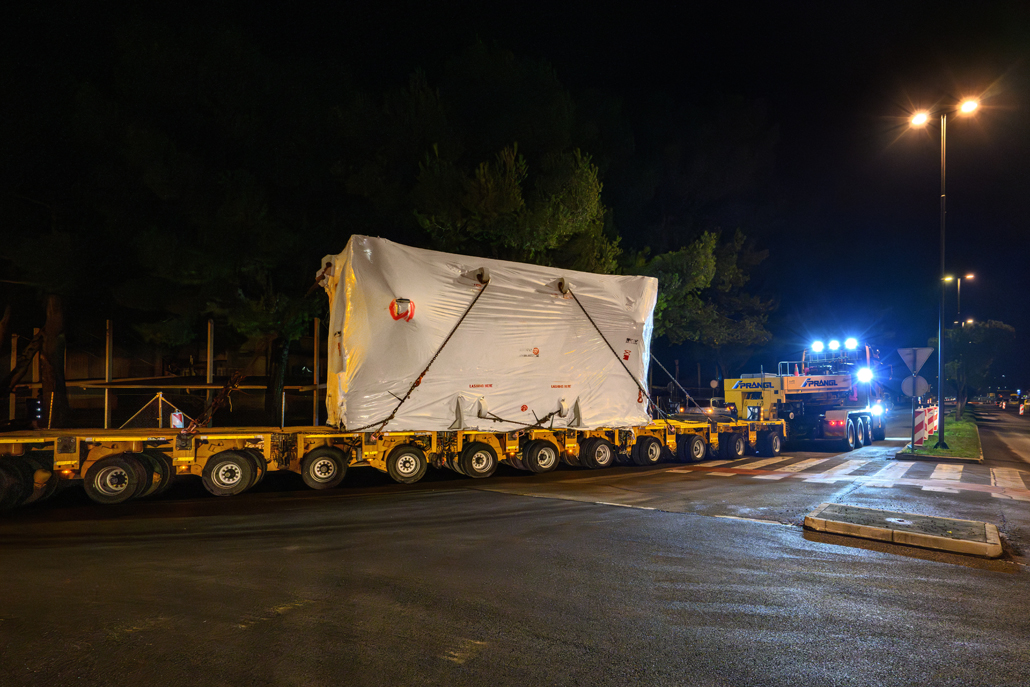 A 600 tonnás rácsos gémes darut a bécsi Prangl központból szálították Koper kikötőjébe. A présgép összesen kilenc alkatrészét kellett kirakodni a hajóból. Az egyes alkatrészek tömege 50 és 155 tonna között volt. A legnagyobb alkatrész 9,90 x 4,97 x 3,75 méteres, a legkisebb 5,20 x 2,00 x 3,50 méteres volt. A Prangl csapat és a rácsosgémű daru tökéletes munkát végzett. Az alkatrészeket fokozatosan a várakozó teherautókra rakodták, a legnehezebb, 155, 151 és 138 tonnás alkatrészeket a 4 tengelyes vontató által húzott 14 tengelyes nagy teherbírású kombinációkra.