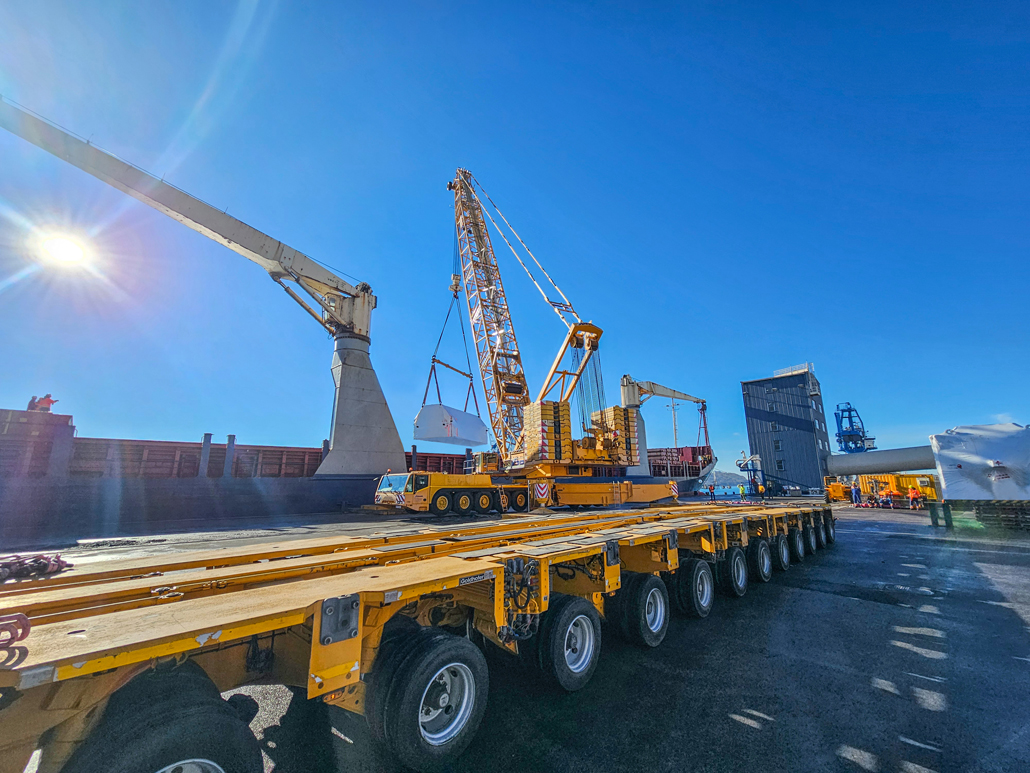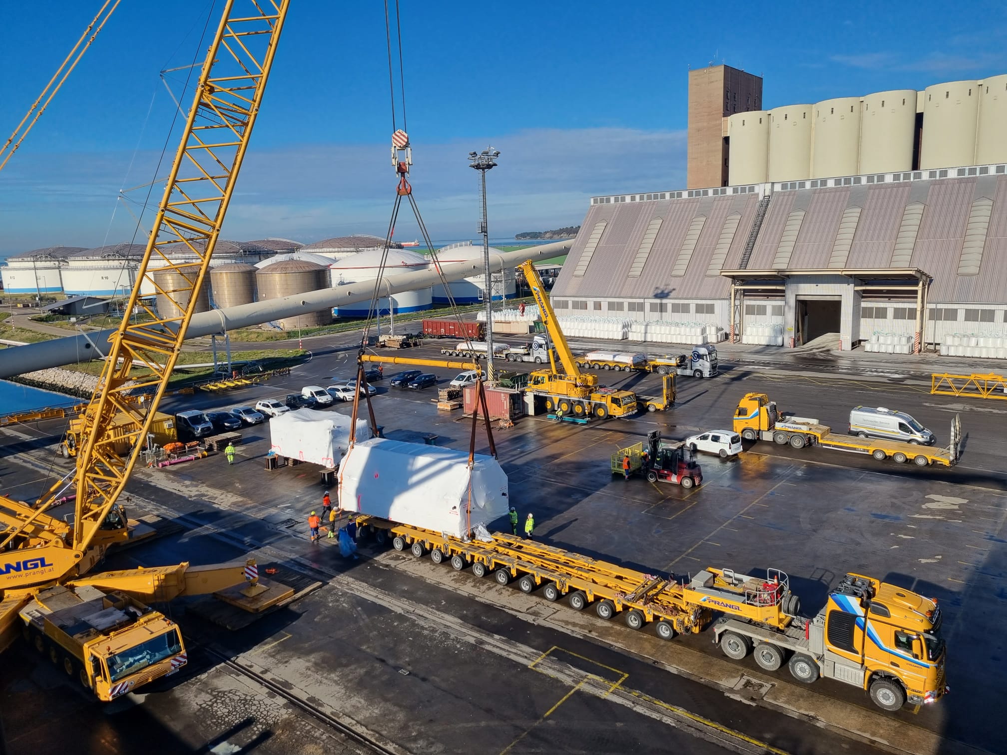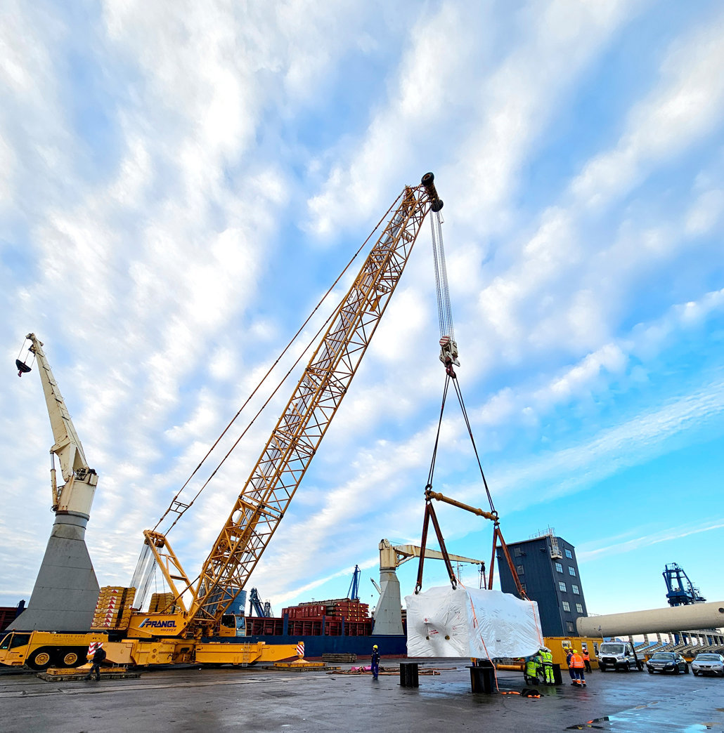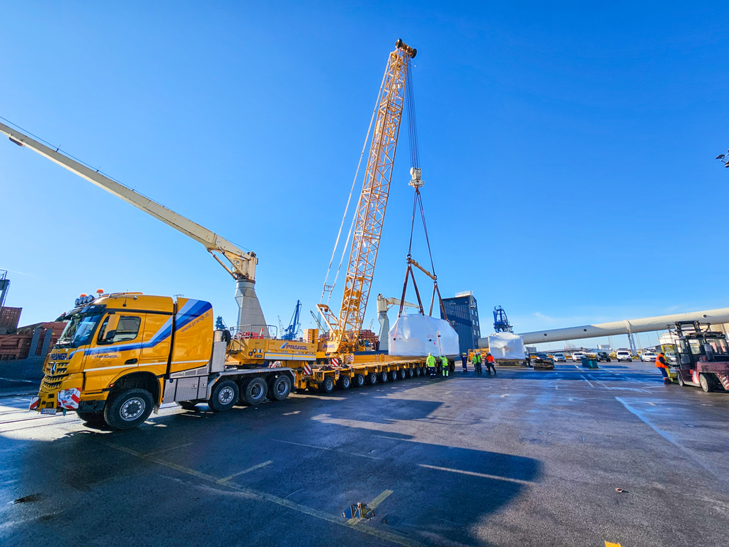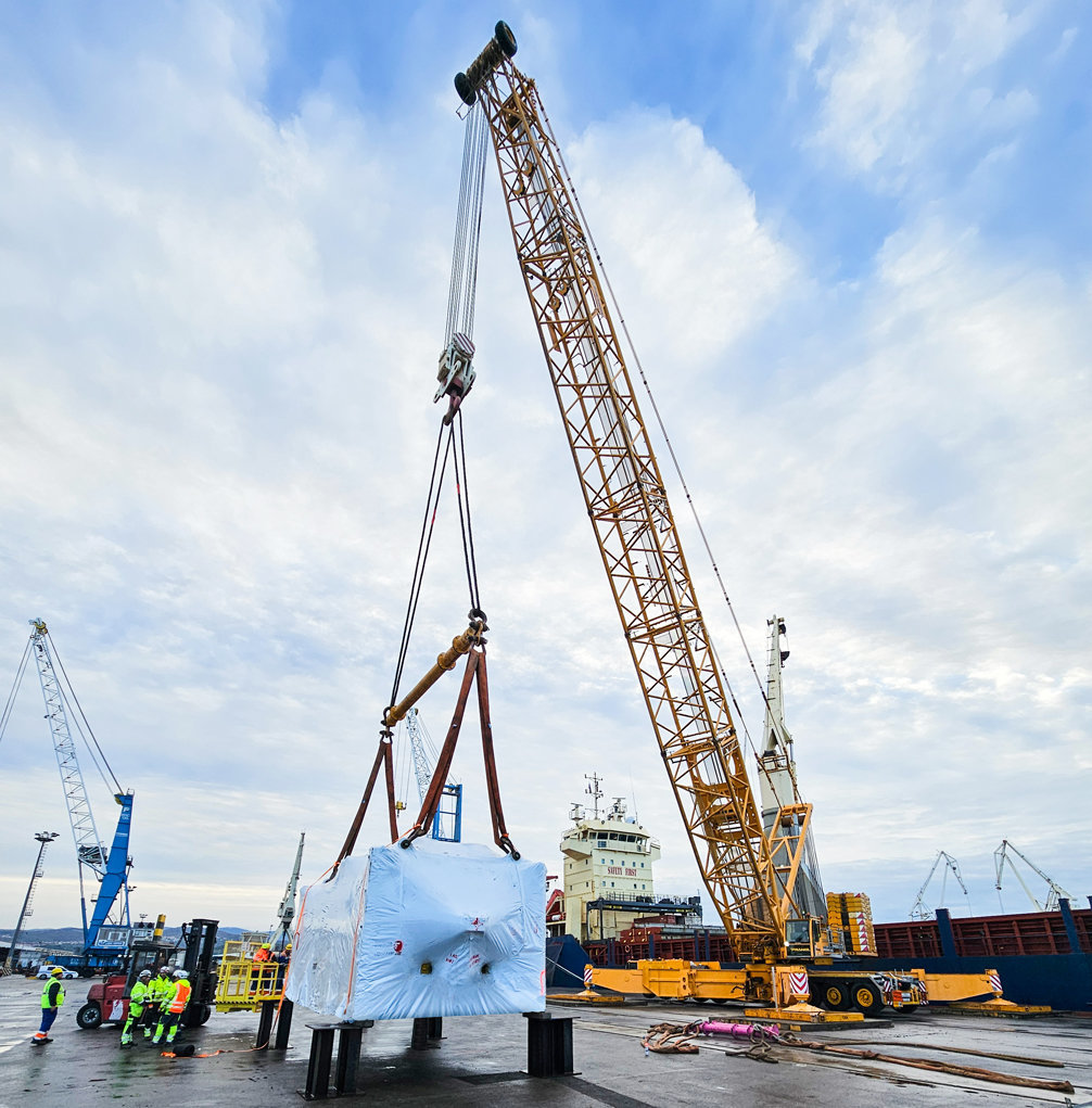 A 600 tonnás rácsos gémes darut a bécsi Prangl központból szálították Koper kikötőjébe. A présgép összesen kilenc alkatrészét kellett kirakodni a hajóból. Az egyes alkatrészek tömege 50 és 155 tonna között volt. A legnagyobb alkatrész 9,90 x 4,97 x 3,75 méteres, a legkisebb 5,20 x 2,00 x 3,50 méteres volt. A Prangl csapat és a rácsosgémű daru tökéletes munkát végzett. Az alkatrészeket fokozatosan a várakozó teherautókra rakodták, a legnehezebb, 155, 151 és 138 tonnás alkatrészeket a 4 tengelyes vontató által húzott 14 tengelyes nagy teherbírású kombinációkra.