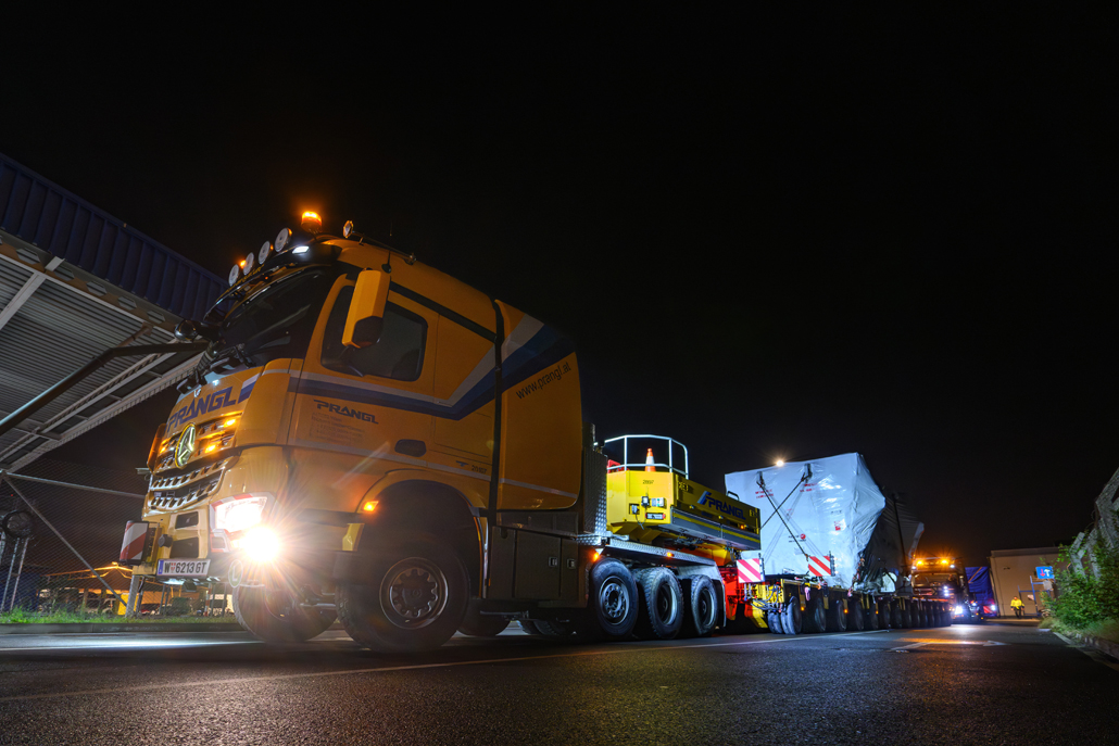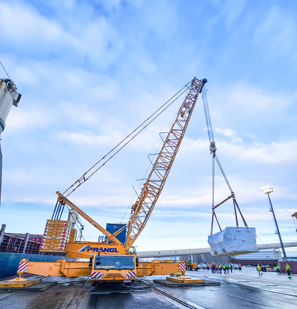 A Prangl csapat feladata a következő volt: a présgép kirakodása a tengerjáró hajóról Koper kikötőjében és az alkatrészek szállítása a kikötőből a mintegy 200 kilométerre lévő Brežice-i építkezésre. Az emelési paraméterek jelentettek a kihívást: a legnehezebb alkatrész 155 tonna az autódaru kinyúlása pedig 21 méter volt.