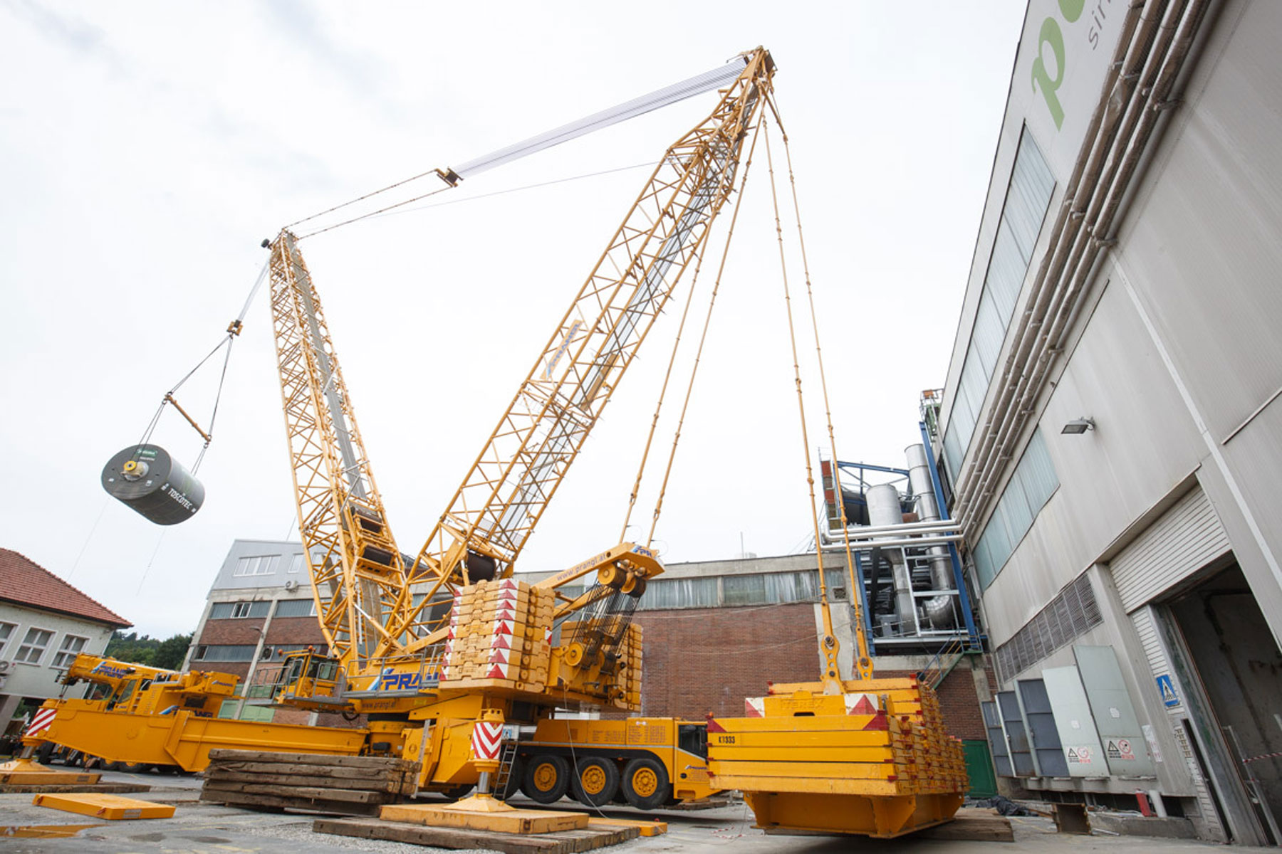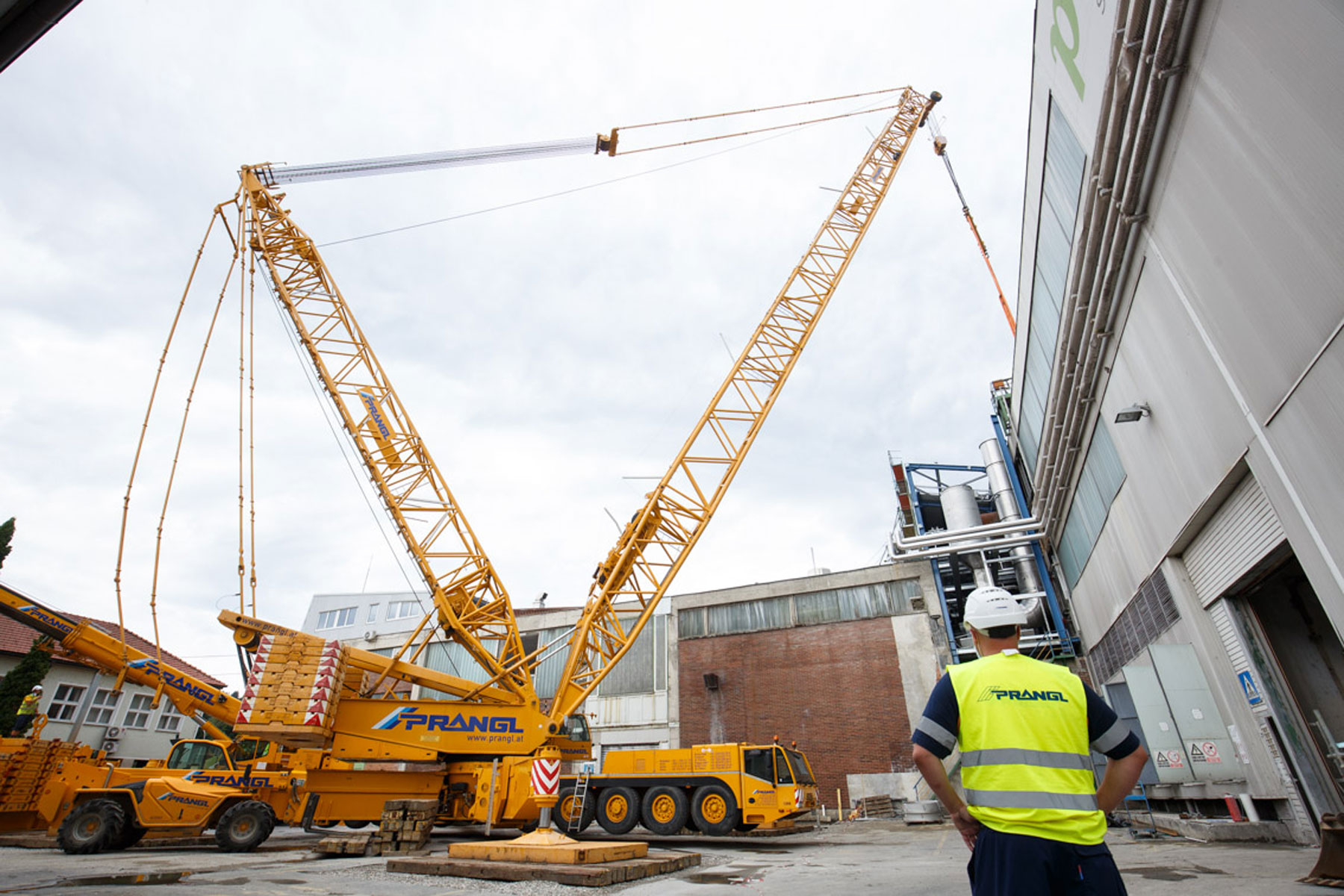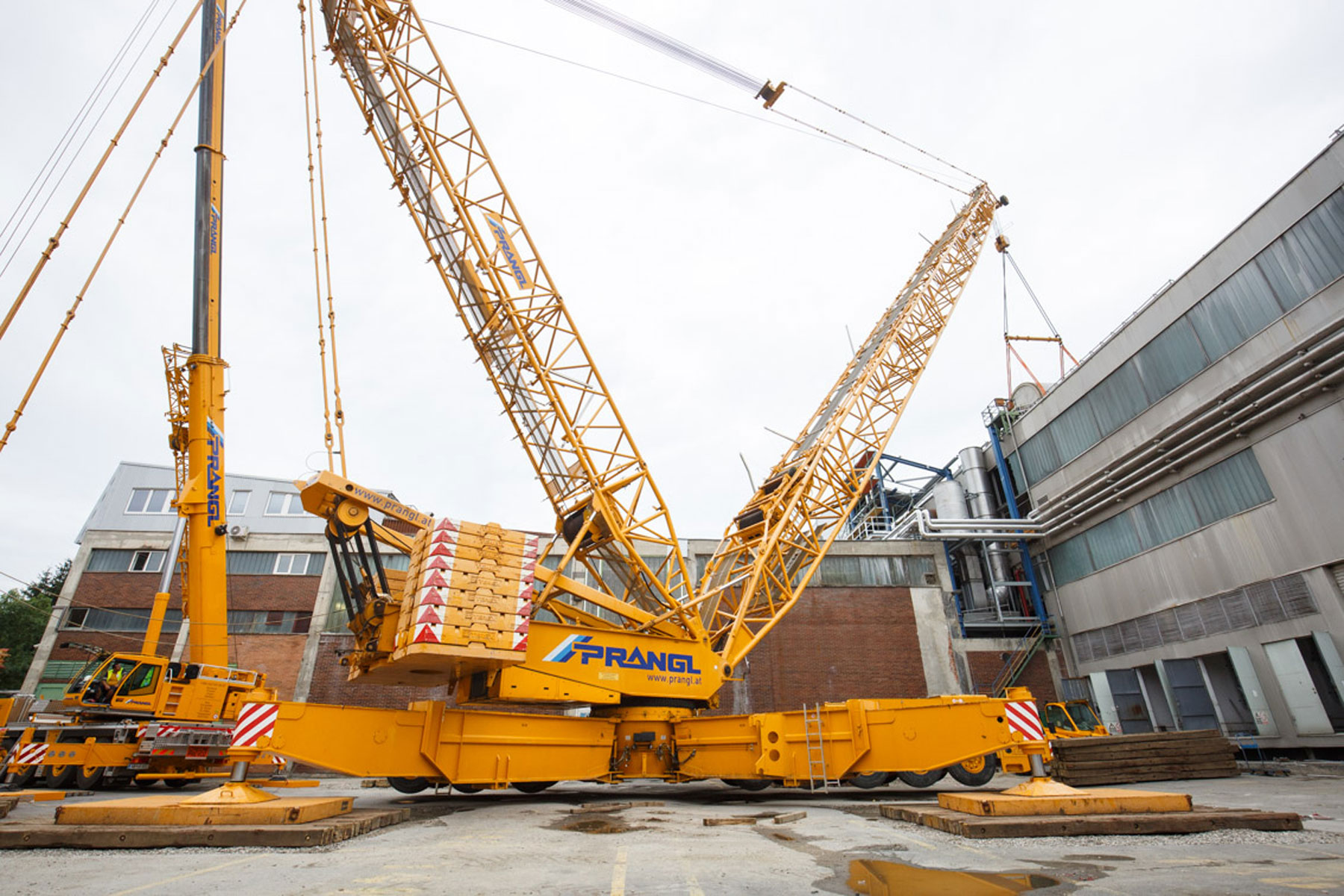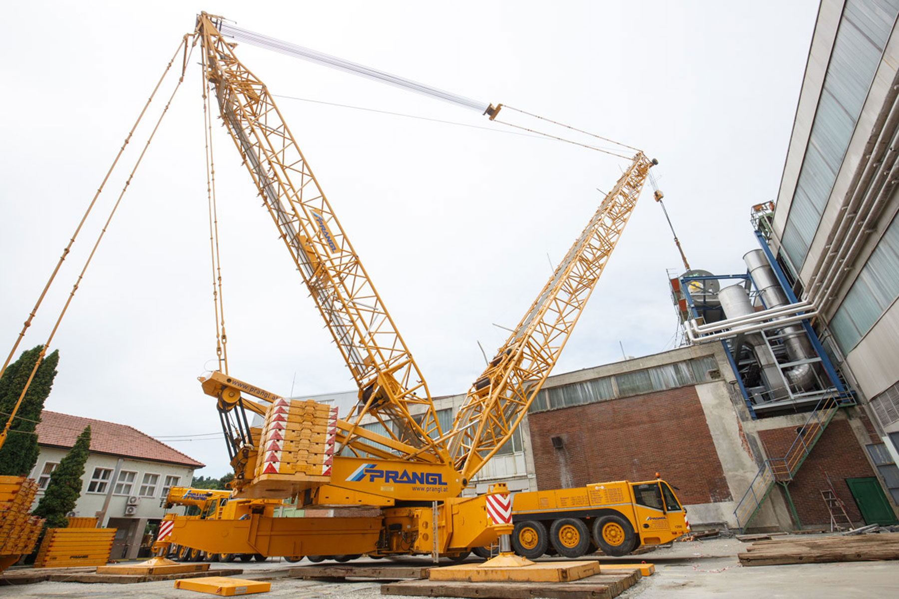 A csaknem 150 éves gyártási telephelyen különösen szűkösek voltak a helyviszonyok, ezért speciális mérnöki munkára volt szükség: A Prangl csapat a 600 tonnás árbócos kialakítású, rácsos gémszerkezetű daruval, amely hatalmas, 43 méteres oldalra kinyúló gémmel rendelkezik, a legjobb technikai megoldást tudta kínálni. Az 1044 tonnás összsúlyú darut egy szűk belső udvaron állították fel. A sárga óriás felépítéséhez még egy új 110 tonnás teleszkópos darura is szükség volt. A szlovén és az osztrák Prangl csapatok jó együttműködésének köszönhetően a felállítást probléma nélkül megoldották.