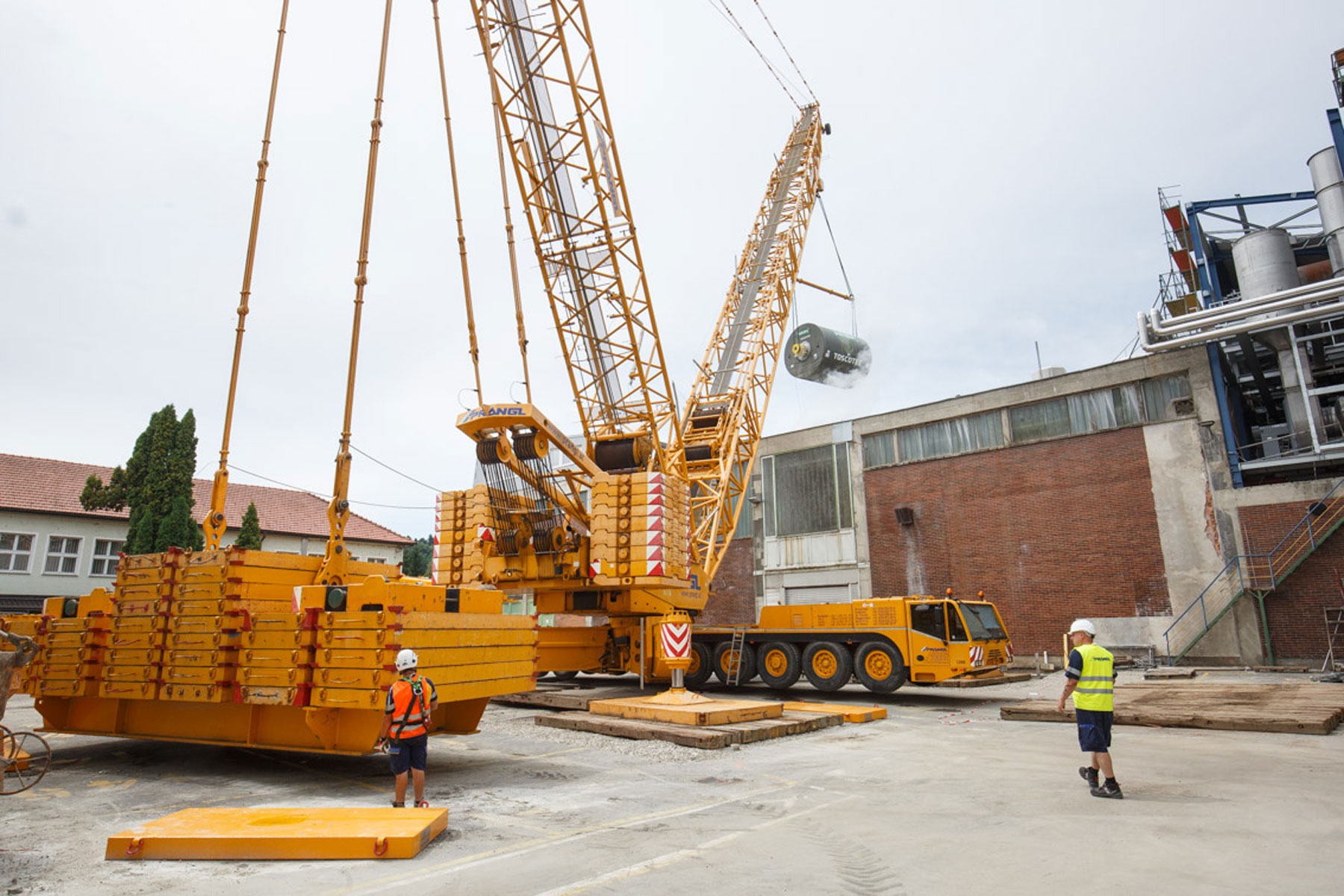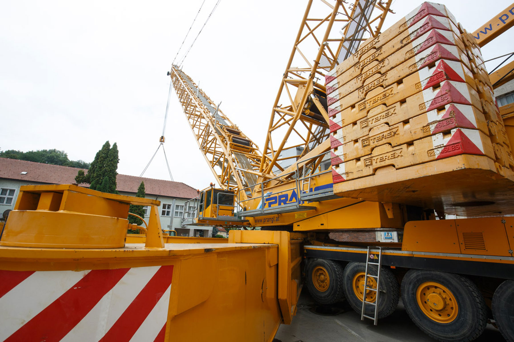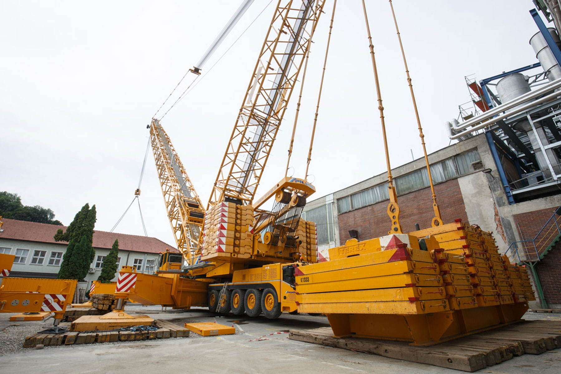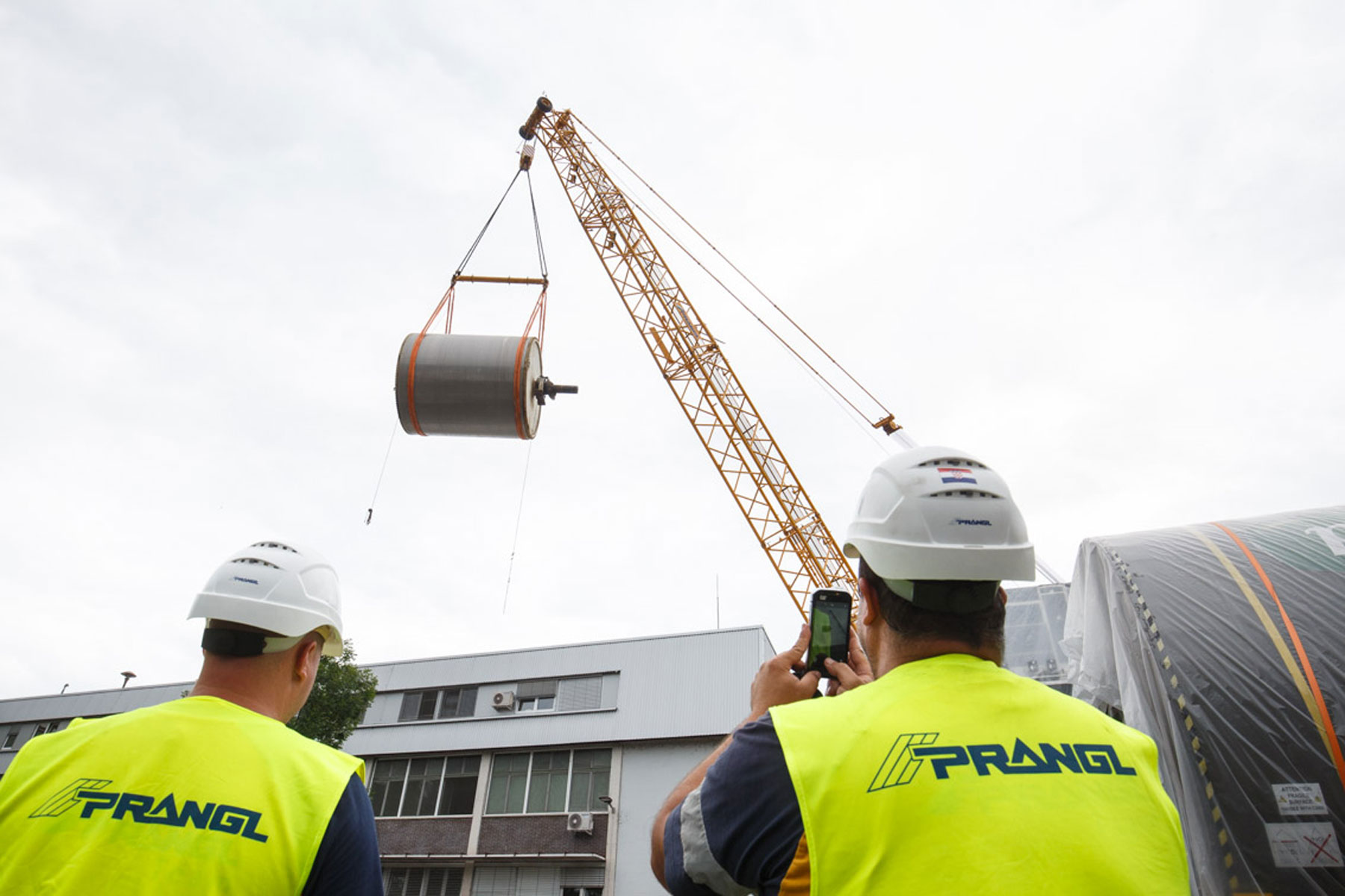 A csaknem 150 éves gyártási telephelyen különösen szűkösek voltak a helyviszonyok, ezért speciális mérnöki munkára volt szükség: A Prangl csapat a 600 tonnás árbócos kialakítású, rácsos gémszerkezetű daruval, amely hatalmas, 43 méteres oldalra kinyúló gémmel rendelkezik, a legjobb technikai megoldást tudta kínálni. Az 1044 tonnás összsúlyú darut egy szűk belső udvaron állították fel. A sárga óriás felépítéséhez még egy új 110 tonnás teleszkópos darura is szükség volt. A szlovén és az osztrák Prangl csapatok jó együttműködésének köszönhetően a felállítást probléma nélkül megoldották.