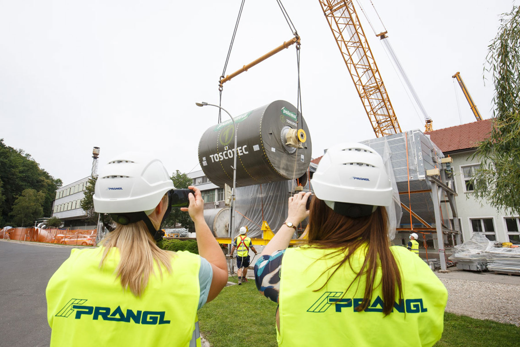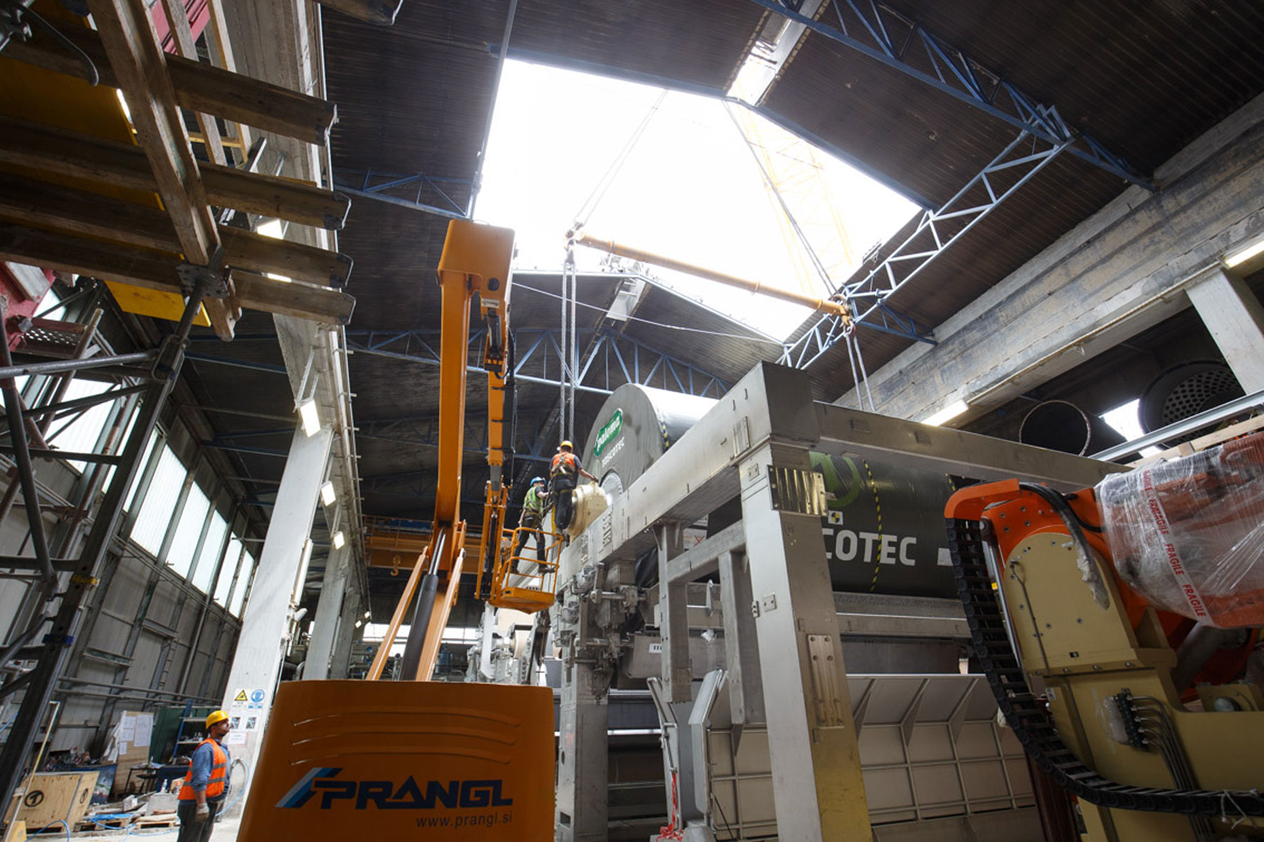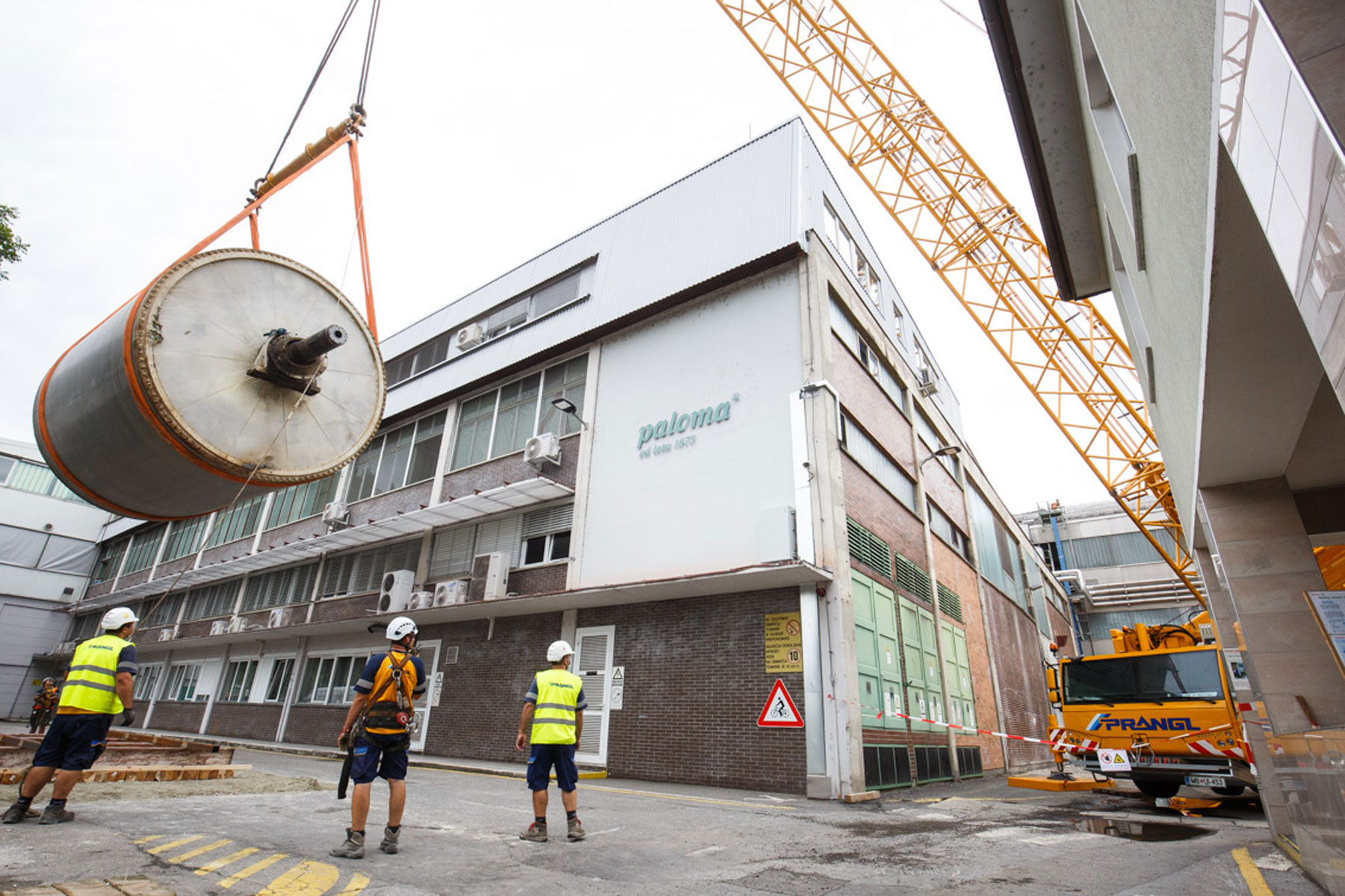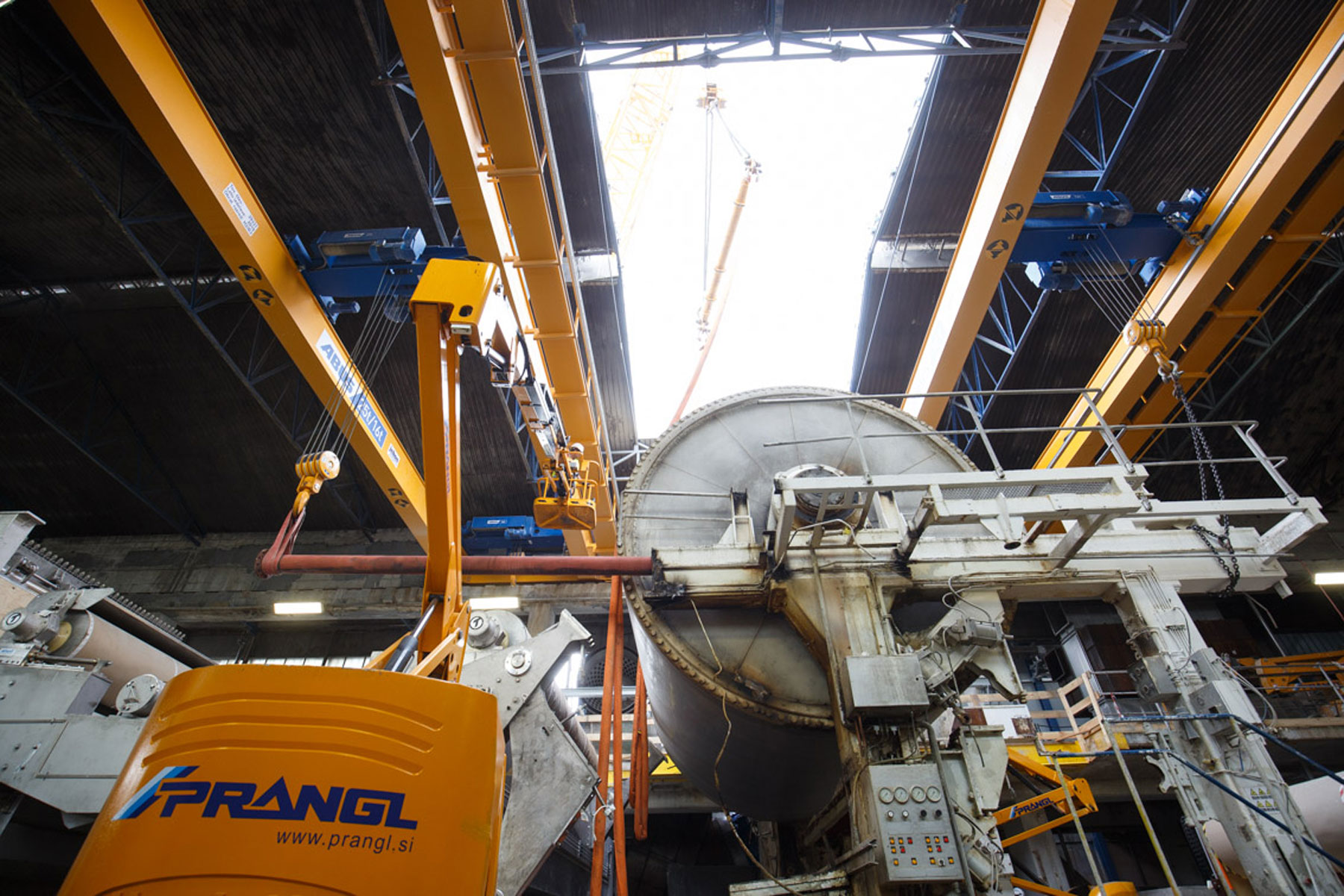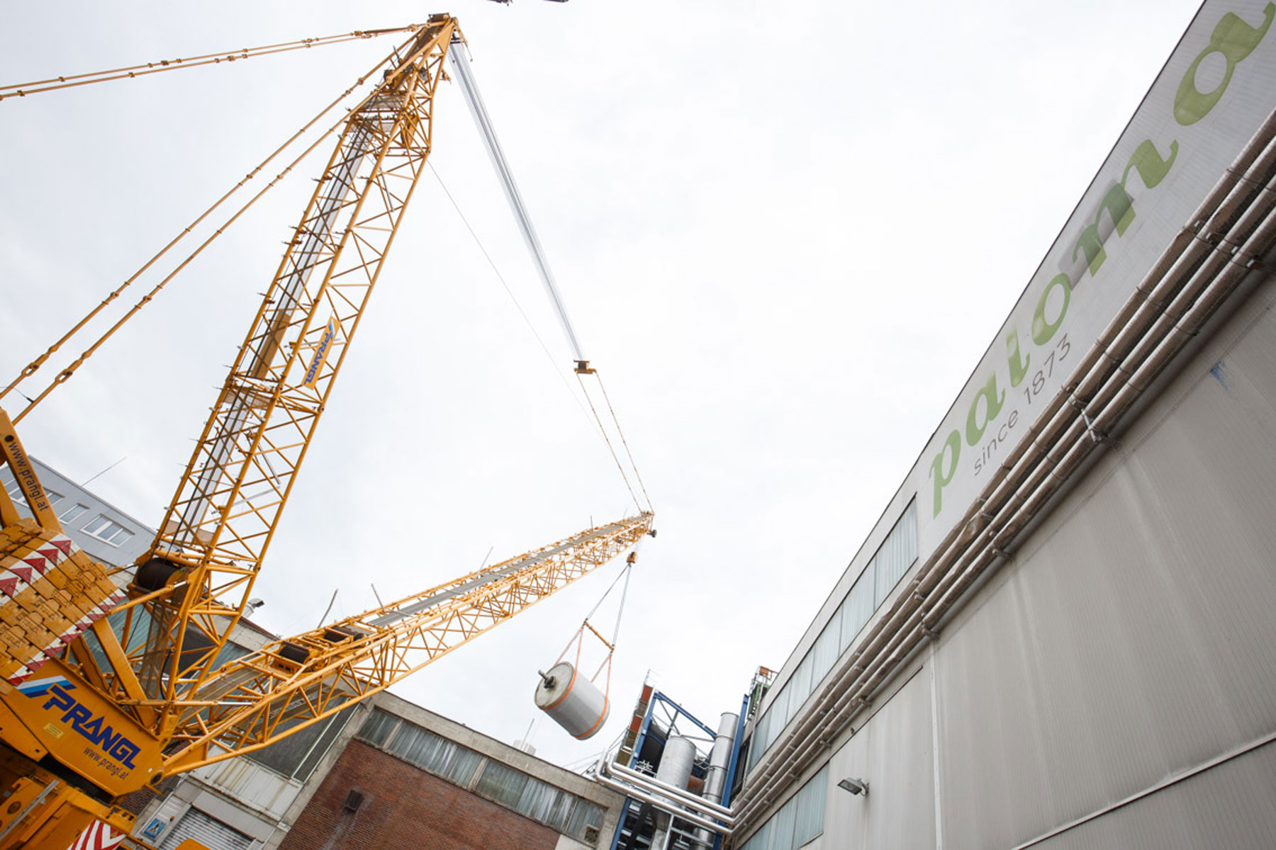 A csaknem 150 éves gyártási telephelyen különösen szűkösek voltak a helyviszonyok, ezért speciális mérnöki munkára volt szükség: A Prangl csapat a 600 tonnás árbócos kialakítású, rácsos gémszerkezetű daruval, amely hatalmas, 43 méteres oldalra kinyúló gémmel rendelkezik, a legjobb technikai megoldást tudta kínálni. Az 1044 tonnás összsúlyú darut egy szűk belső udvaron állították fel. A sárga óriás felépítéséhez még egy új 110 tonnás teleszkópos darura is szükség volt. A szlovén és az osztrák Prangl csapatok jó együttműködésének köszönhetően a felállítást probléma nélkül megoldották.