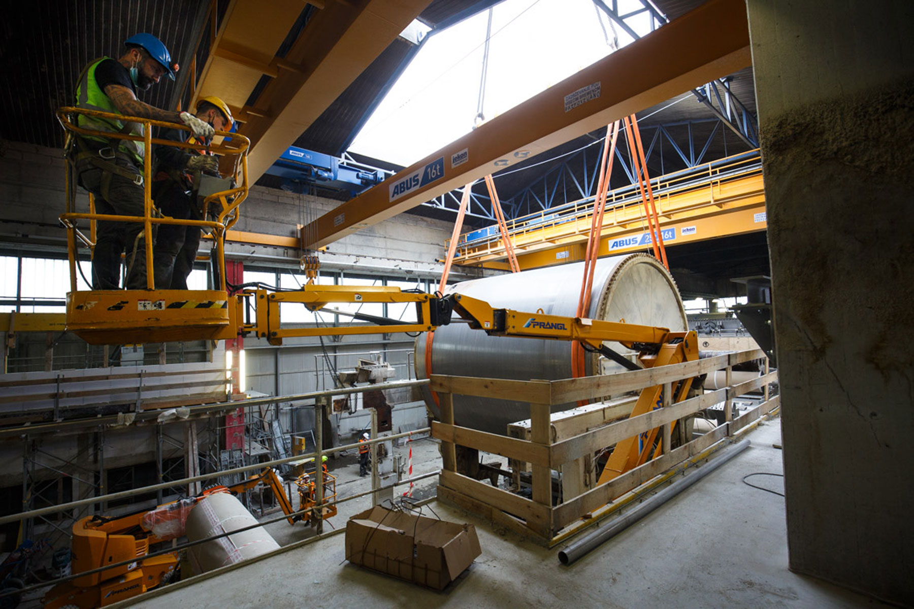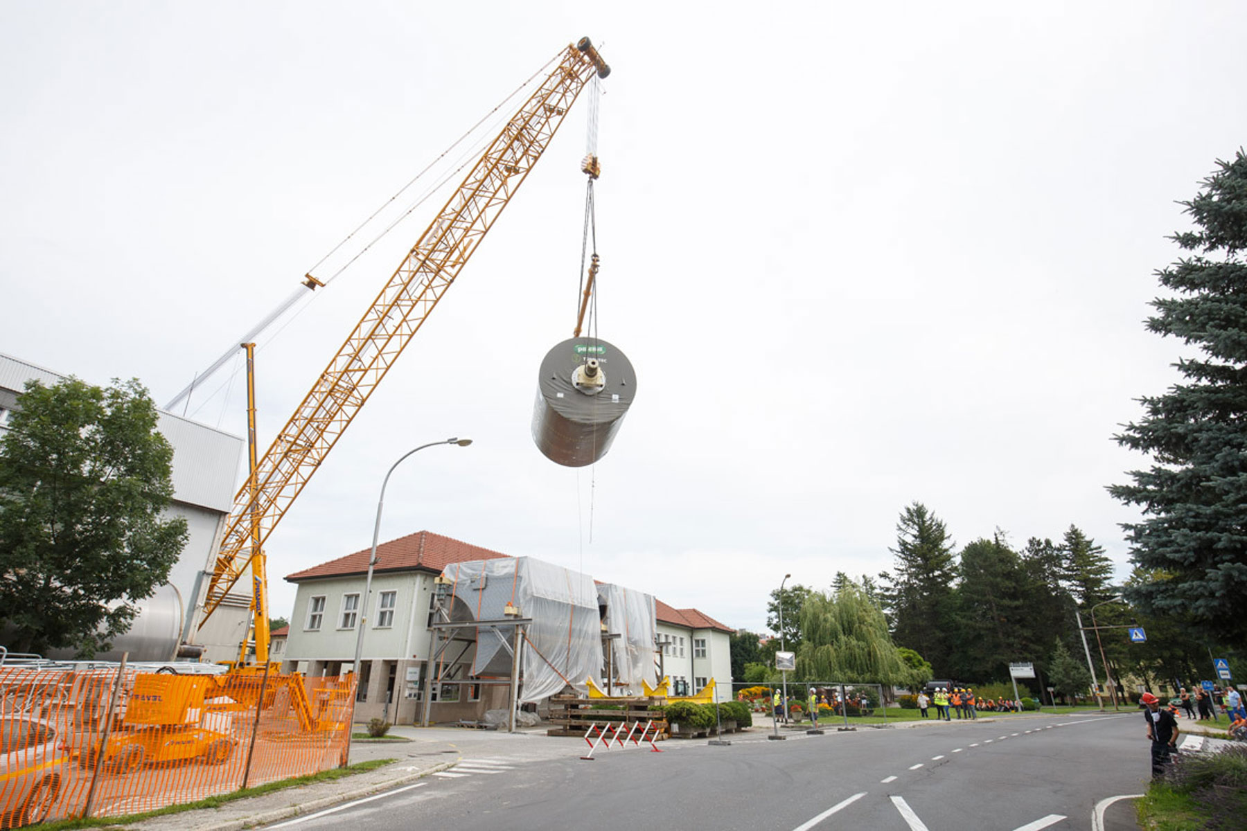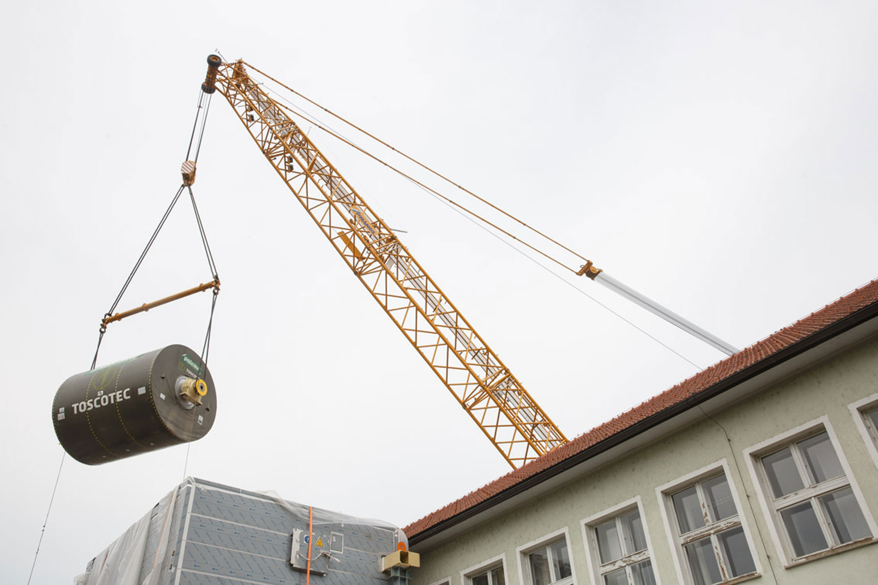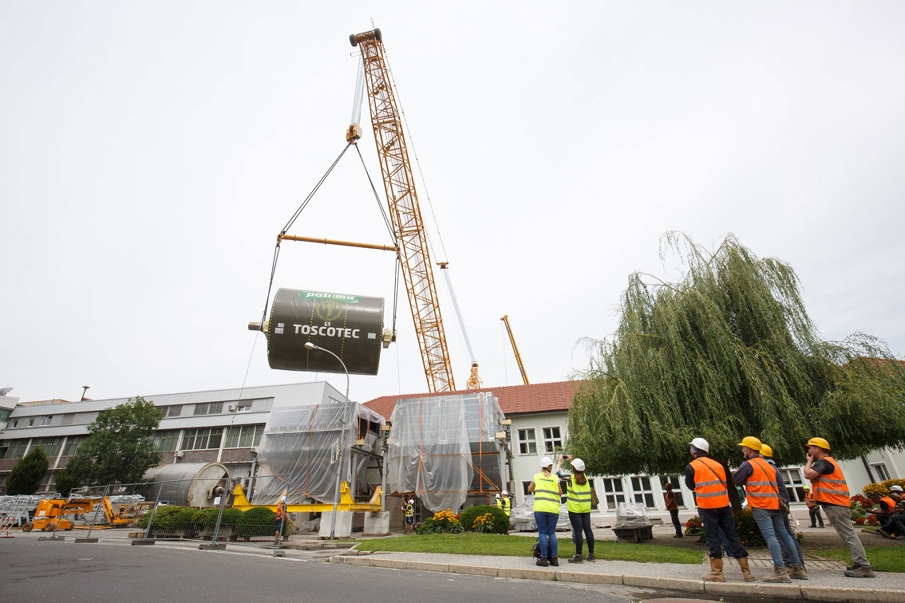 A csaknem 150 éves gyártási telephelyen különösen szűkösek voltak a helyviszonyok, ezért speciális mérnöki munkára volt szükség: A Prangl csapat a 600 tonnás árbócos kialakítású, rácsos gémszerkezetű daruval, amely hatalmas, 43 méteres oldalra kinyúló gémmel rendelkezik, a legjobb technikai megoldást tudta kínálni. Az 1044 tonnás összsúlyú darut egy szűk belső udvaron állították fel. A sárga óriás felépítéséhez még egy új 110 tonnás teleszkópos darura is szükség volt. A szlovén és az osztrák Prangl csapatok jó együttműködésének köszönhetően a felállítást probléma nélkül megoldották.