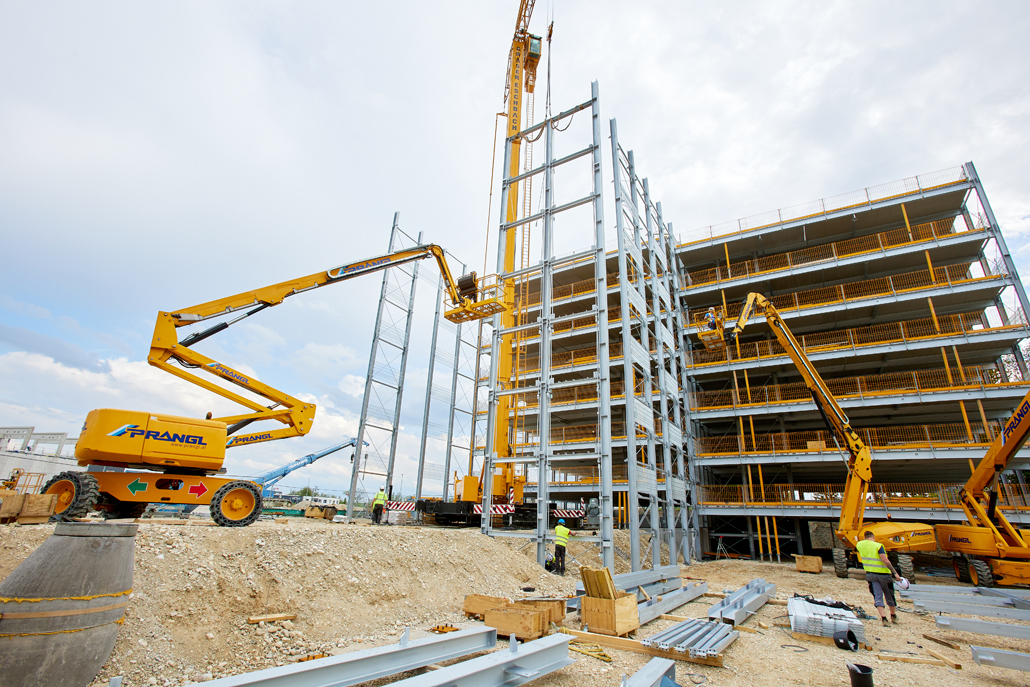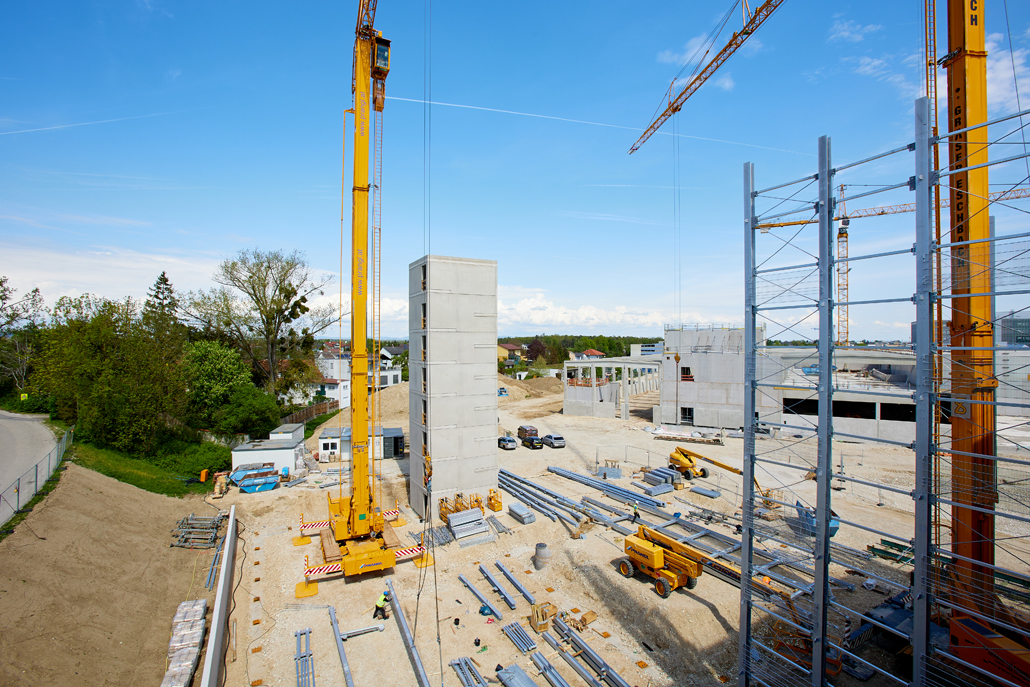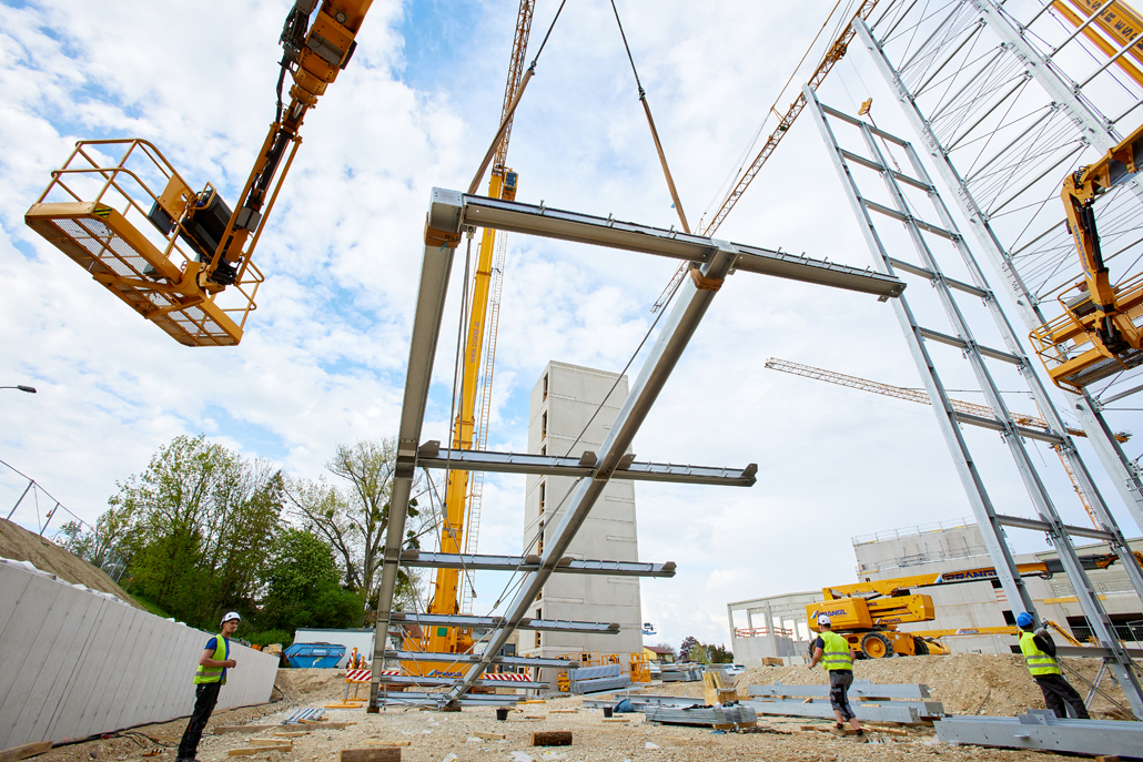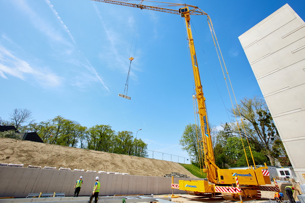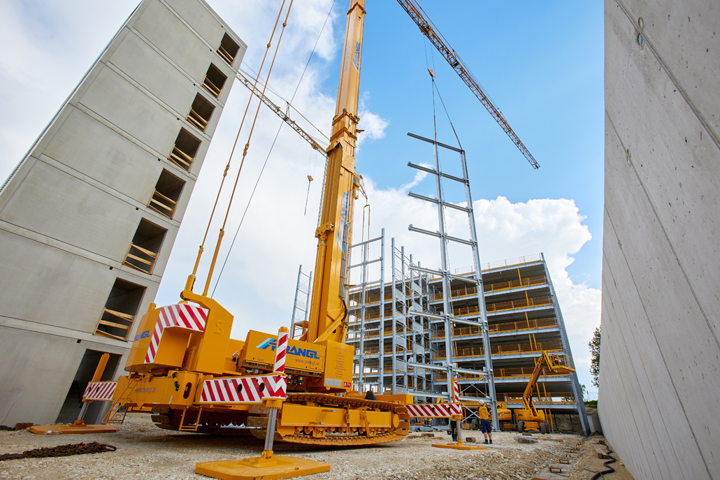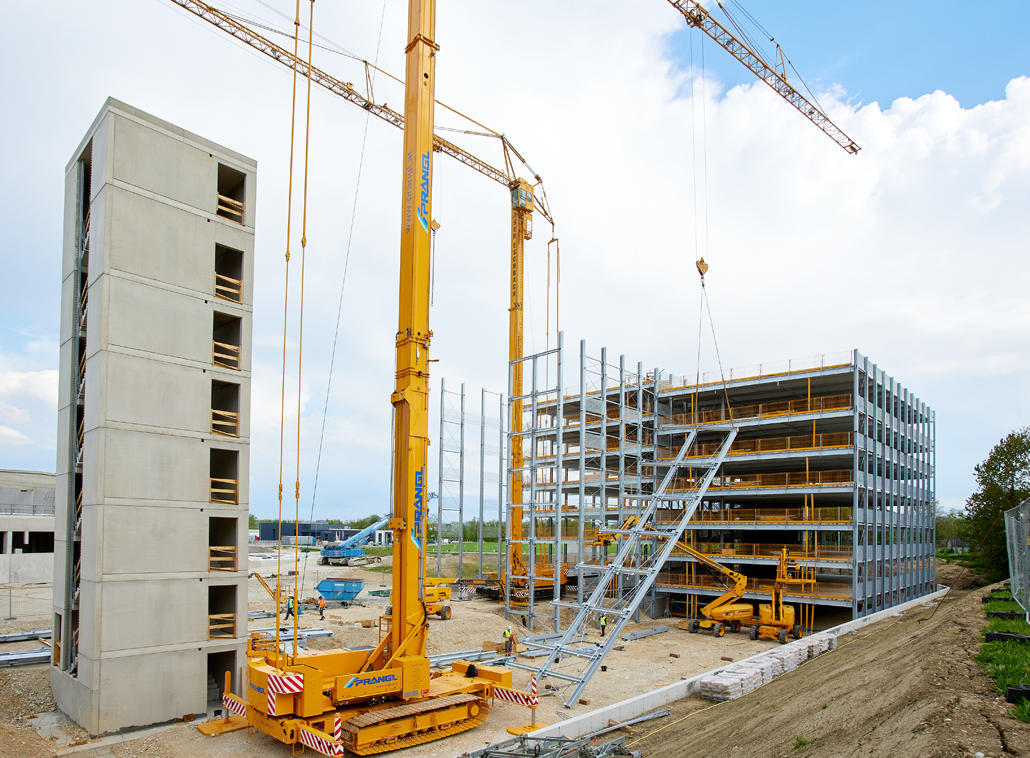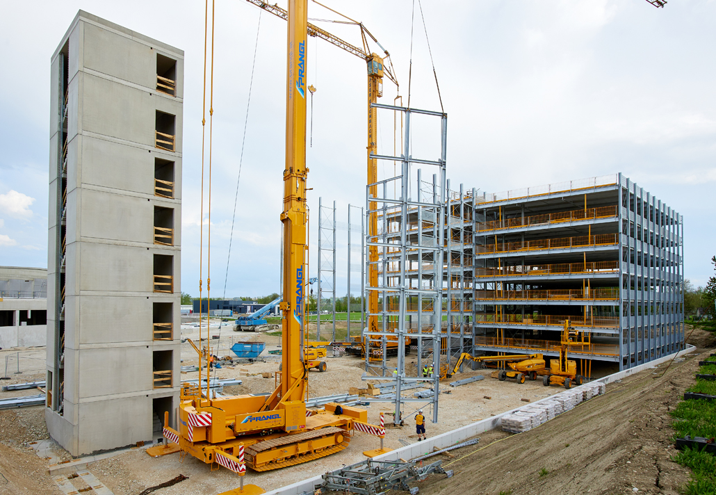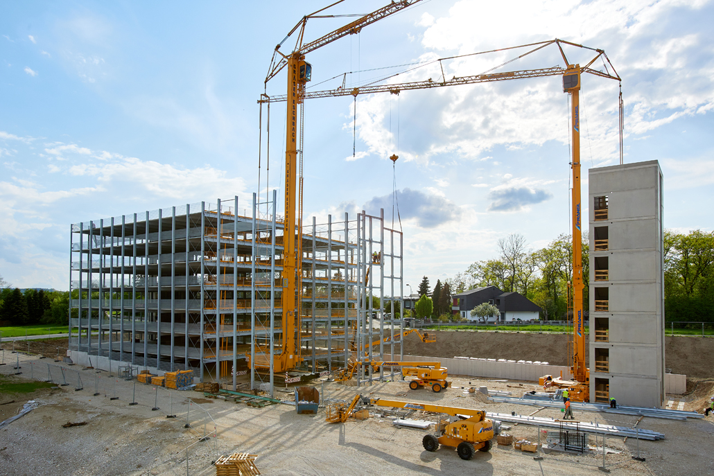A mobil toronydaru végezte az összes emelési műveletet – elsősorban az acélszerkezetek, zsaluelemek és betonelemek emelését és pozicionálását. A leglátványosabb emelés egy három előre összeszerelt acéltartóból álló szerkezeté volt: a 21 méter hosszú, 5,5 méter széles és körülbelül 6 tonna súlyú hatalmas elem egy darabban lebegett a végső célállomására. A mobil toronydaru és a darukezelő könnyedén elvégezte ezt a precíziós emelést, pontosan a helyére helyezve a leendő parkolóház központi elemét.