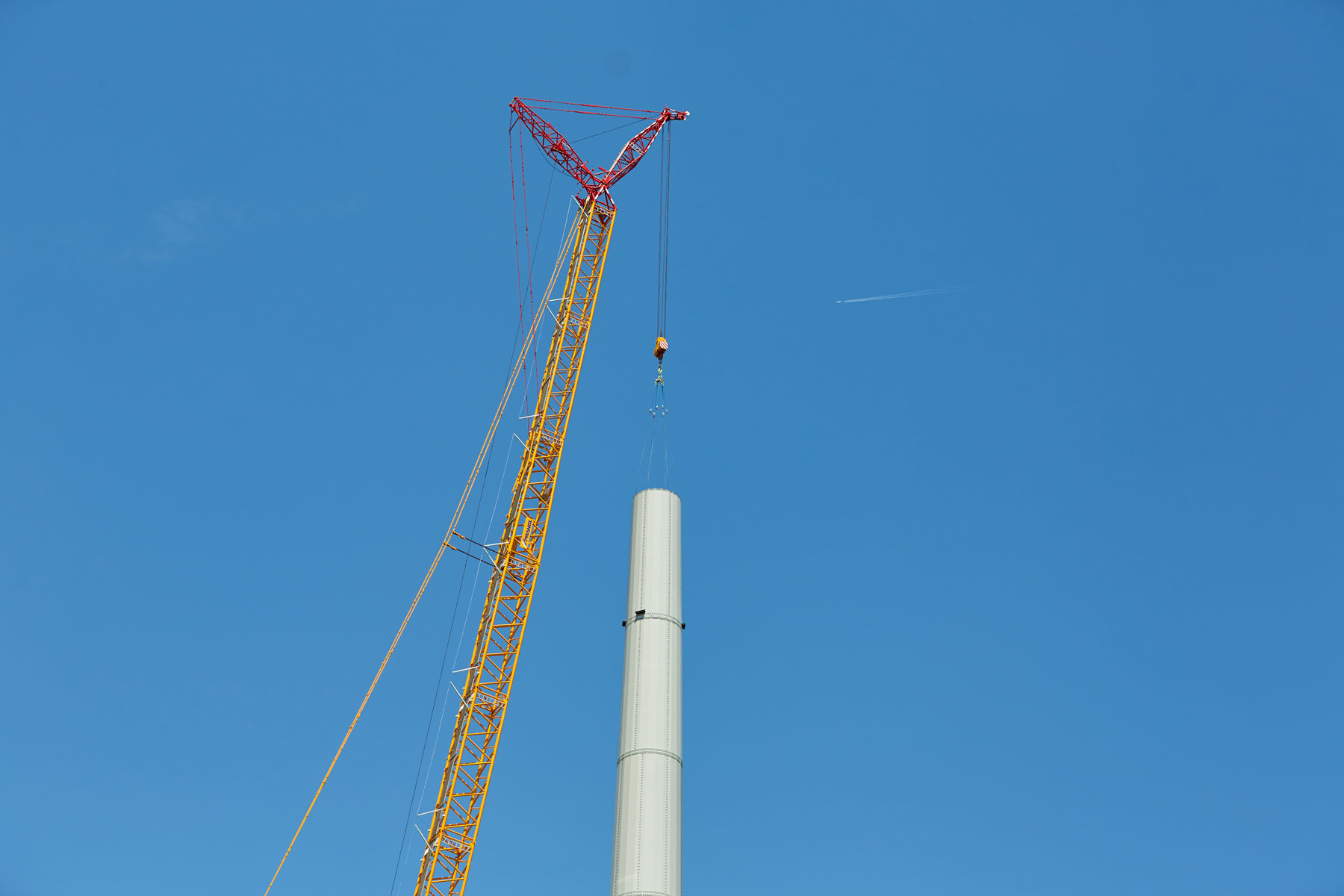 A szélerőművet az alsó-ausztriai Scharndorf közelében telepítették egy 135 méteres tengelymagasságú moduláris acéltoronyra. A fő összeszereléshez egy „mozgékony” nagydarut kellett használni. Végül egy 650 tonnás lánctalpas darura esett a választás. Az új típusú rendszer és a szükséges rögzítőeszközök miatt a főgémet a szokásosnál magasabbra kellett építeni. Összességében a teljes darurendszer 156 méter magas, a teljes tömege pedig 950 tonna volt.