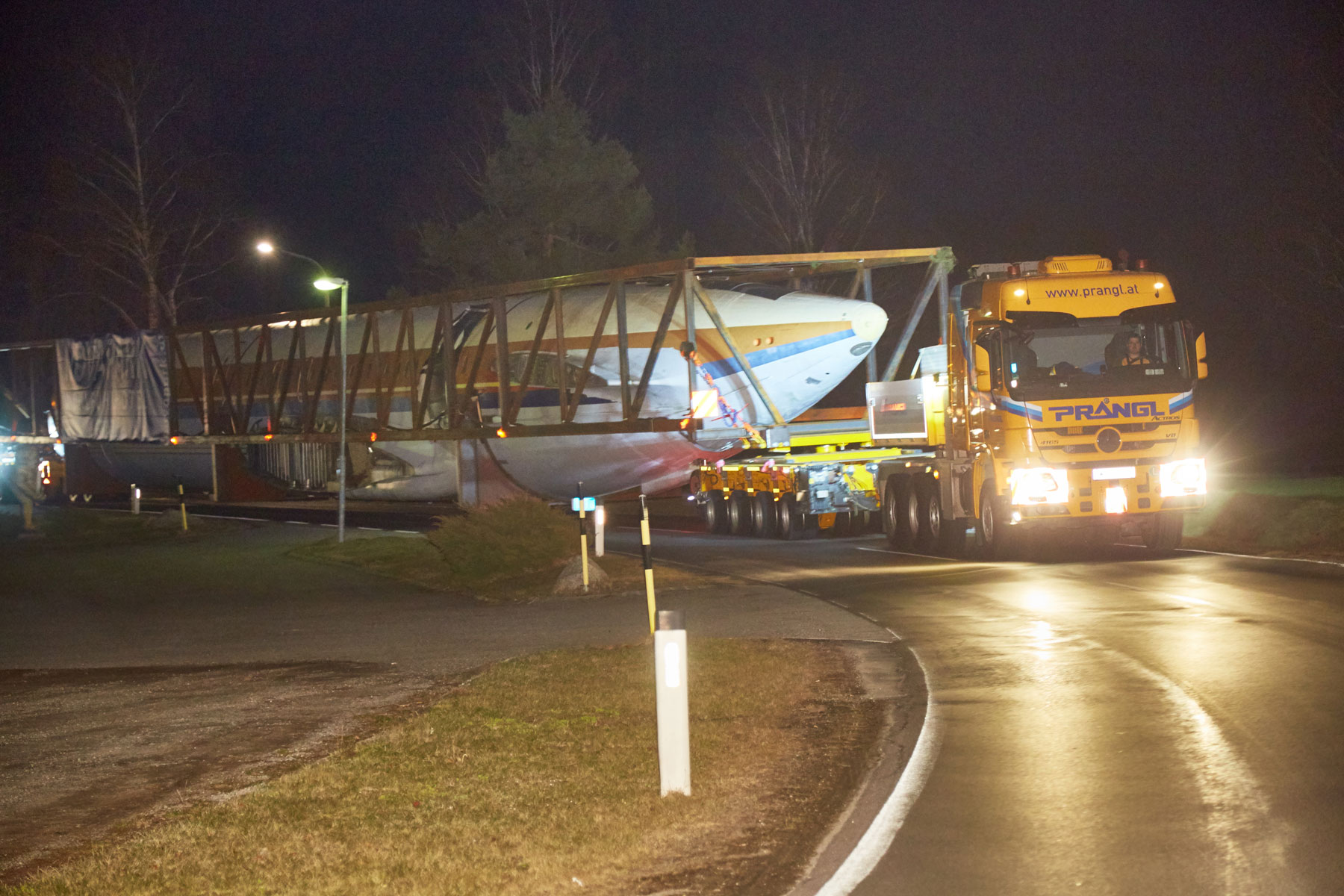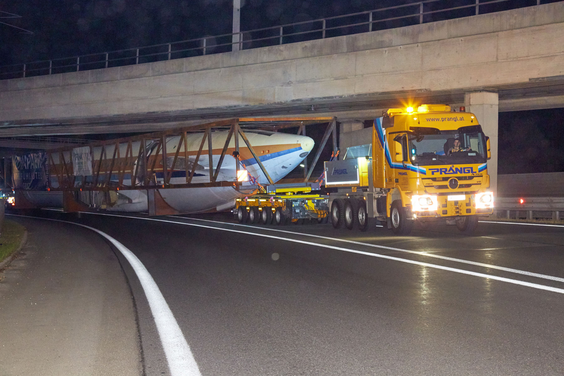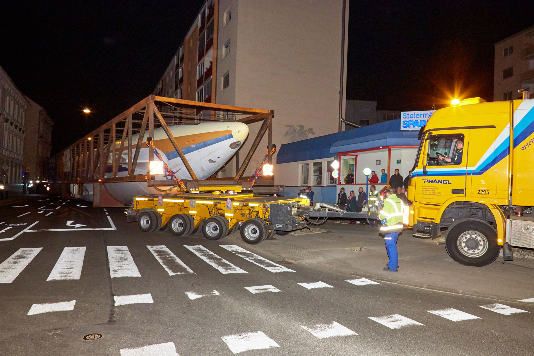 A Prangl már 2017-ben szembe találta magát egy rendkívüli projekttel. A terv szerint egy régi, 53,1 méter hosszú és 43,2 méter széles repülőgépet kellett egy erdős területről Grazba szállítani, majd a célállomáson egy hotel tetejére emelni. A projekt tényleges megvalósítása előtt közel egy éves előkészítő tervezésre, valamint számos tanulmány elvégzésére volt szükség.