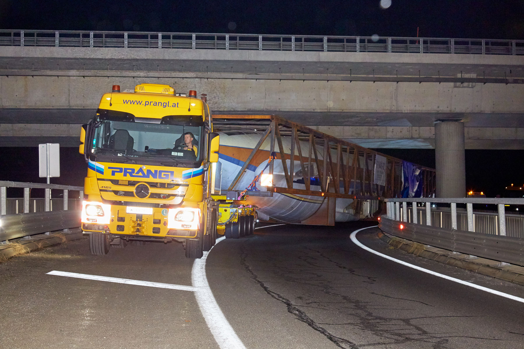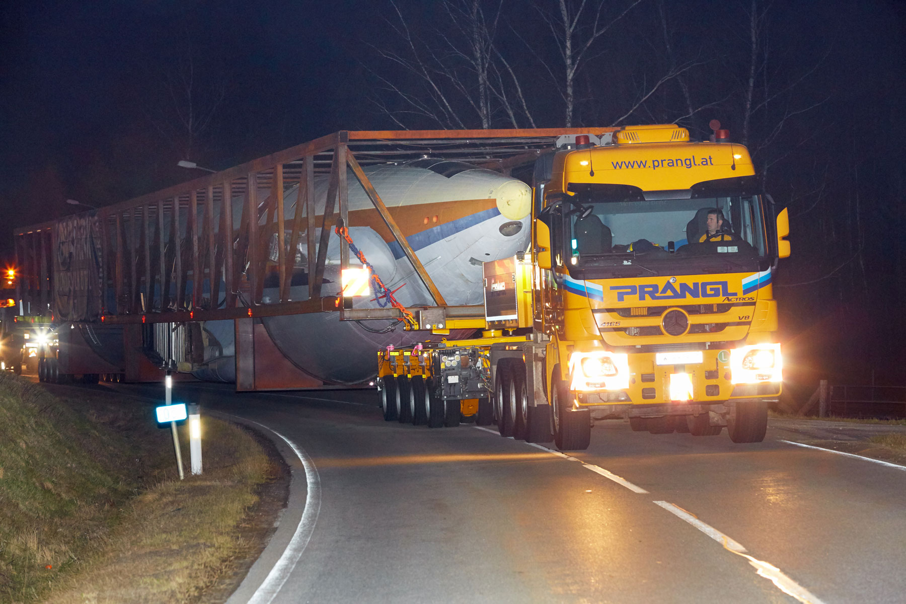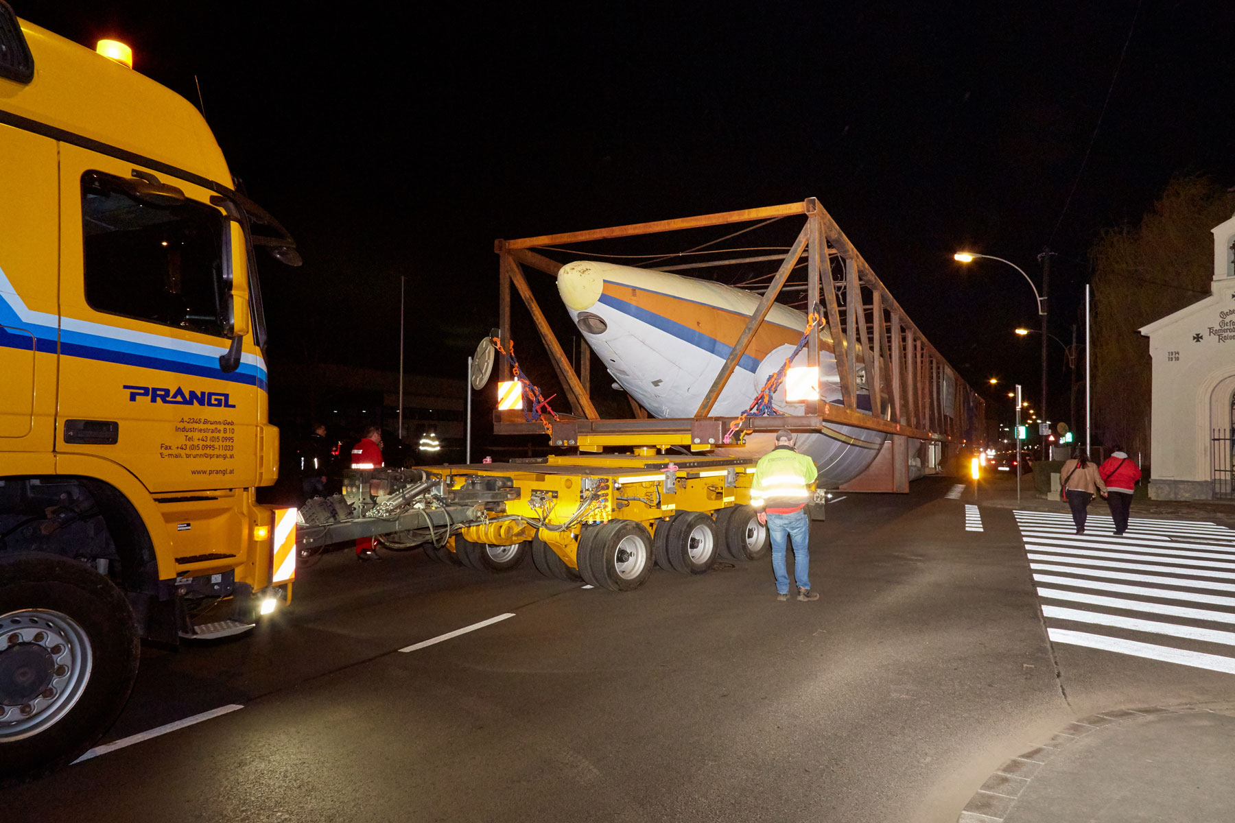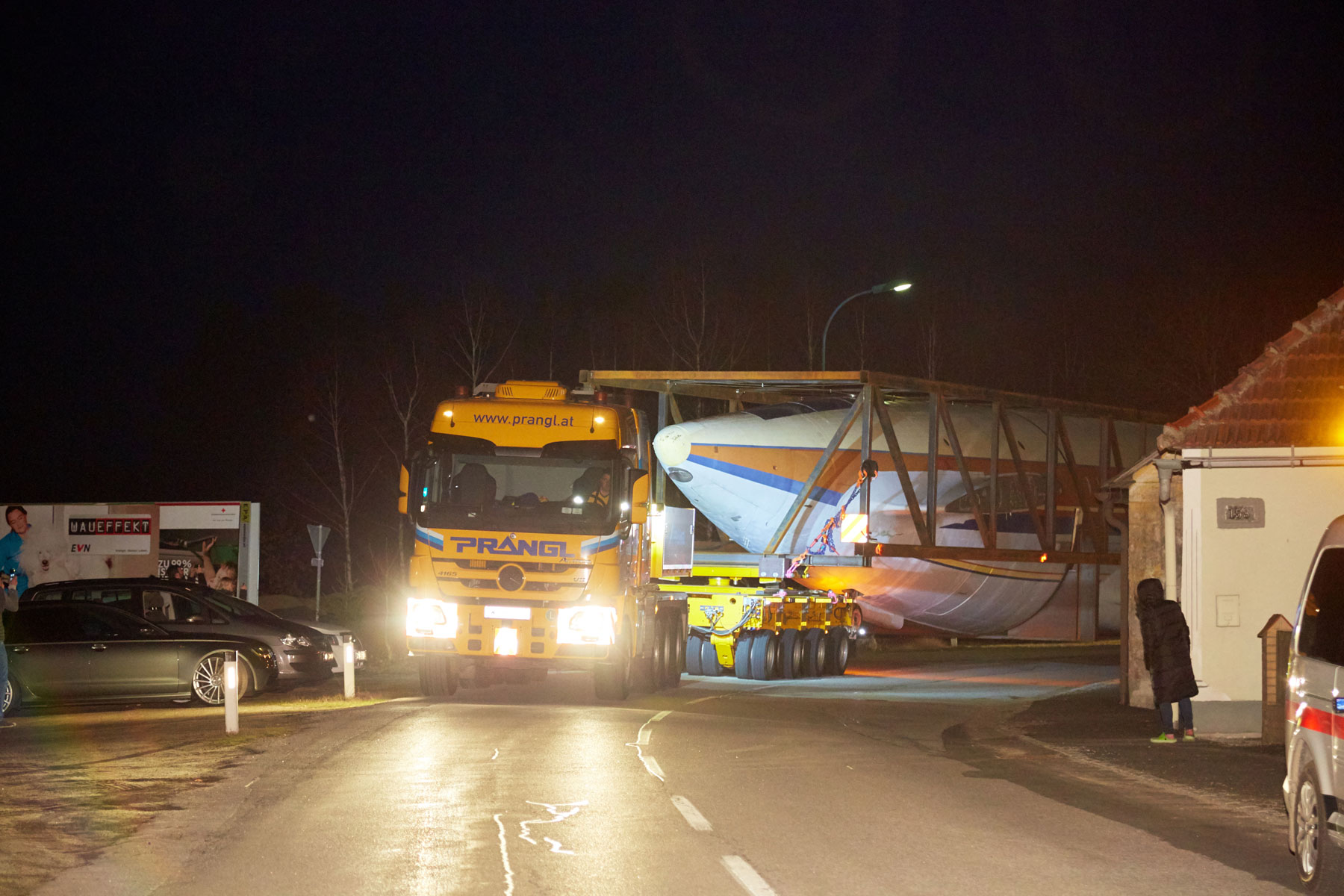 A Prangl már 2017-ben szembe találta magát egy rendkívüli projekttel. A terv szerint egy régi, 53,1 méter hosszú és 43,2 méter széles repülőgépet kellett egy erdős területről Grazba szállítani, majd a célállomáson egy hotel tetejére emelni. A projekt tényleges megvalósítása előtt közel egy éves előkészítő tervezésre, valamint számos tanulmány elvégzésére volt szükség.