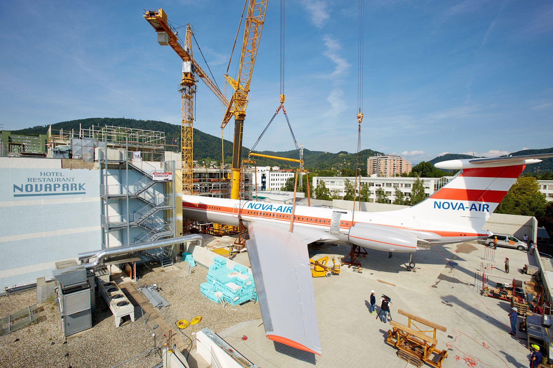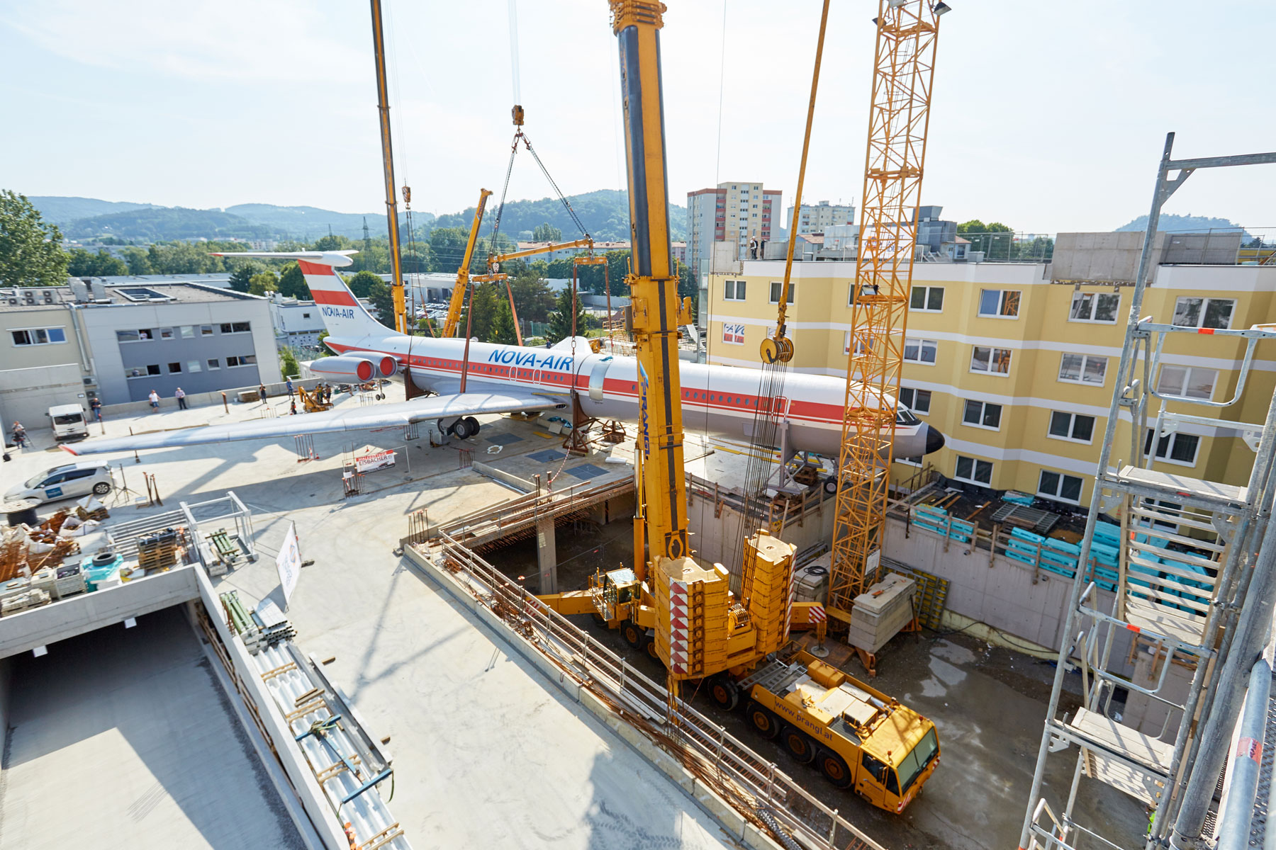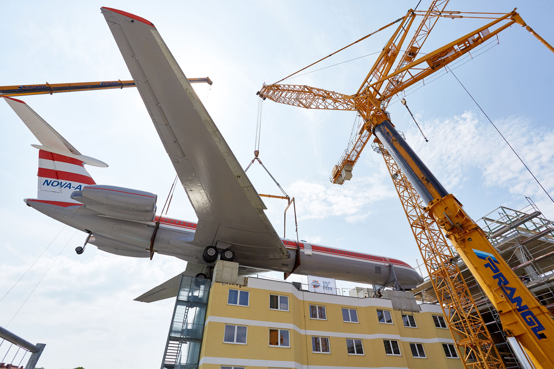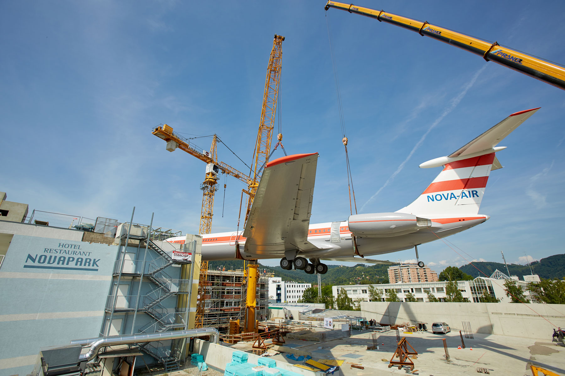 Miután a parkoló szinten több héten át szerelték össze a szerkezetet, a Prangl több hetes szünetet tarthatott. Amint elkészültek a munkával, a 62 tonnás gépet a szárnyakkal együtt egy 500 tonnás és egy 200 tonnás teleszkópos daru emelte fel a hotel tetejére, körülbelül 25 méteres magasságba. Graznak ezzel új látványossága van: A repülőgép pontosan „landolt” a hotel tetején. A Prangl csapat tökéletes teljesítménye vitte sikerre ezt a rendkívüli projektet. Erről számos kíváncsiskodó személyesen is meggyőződhetett.
