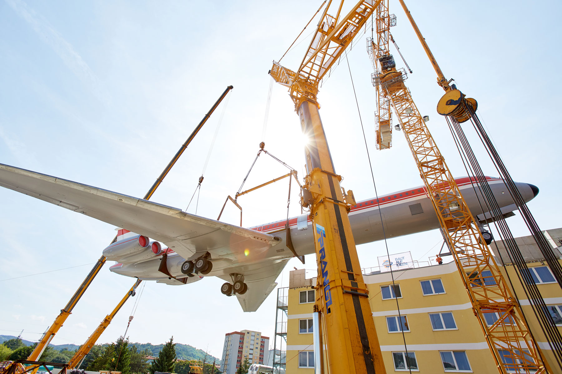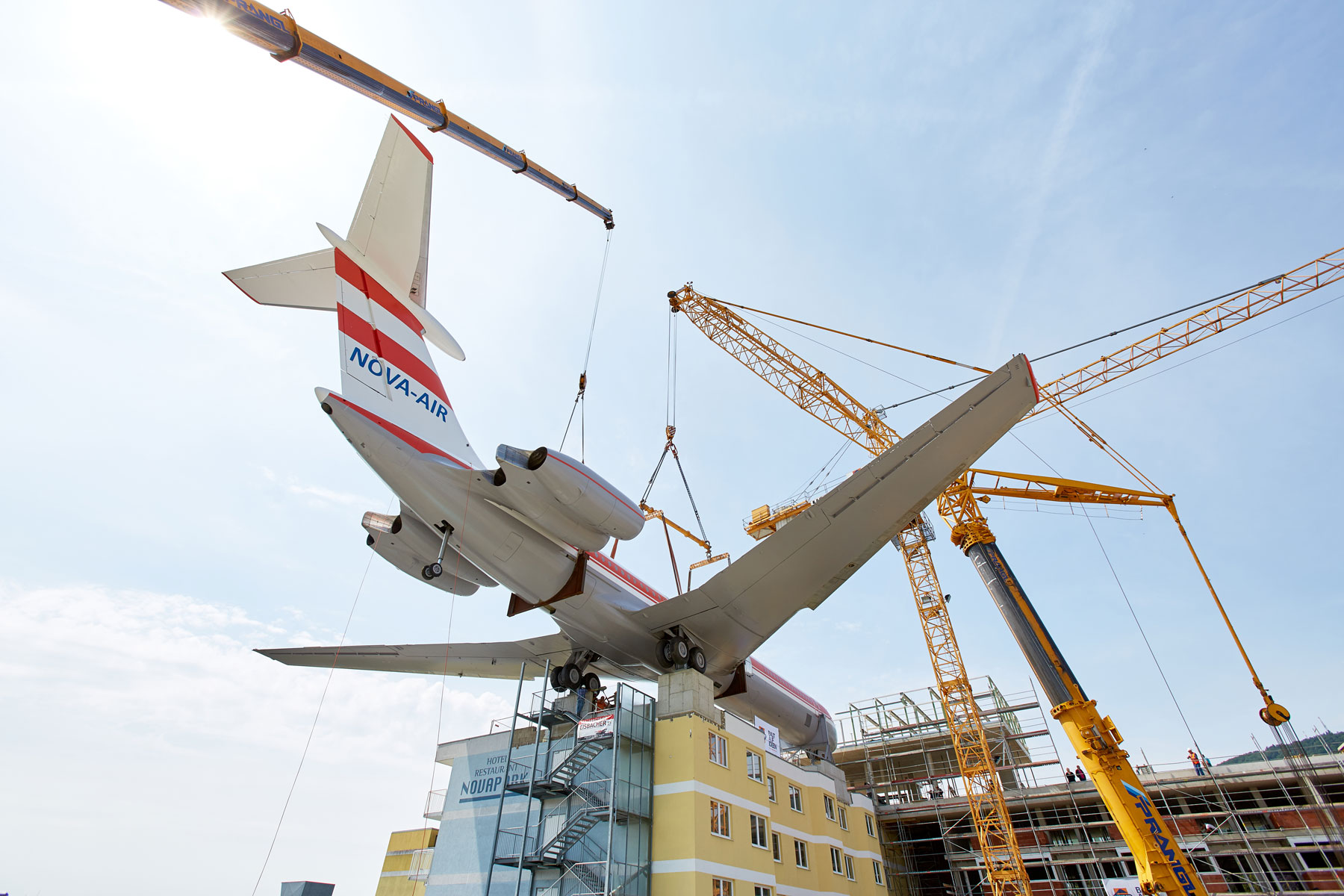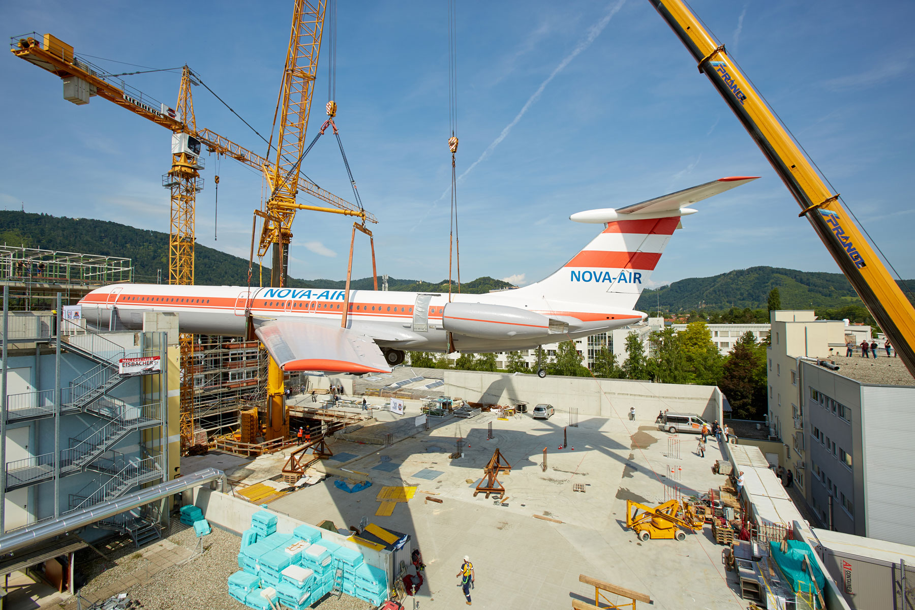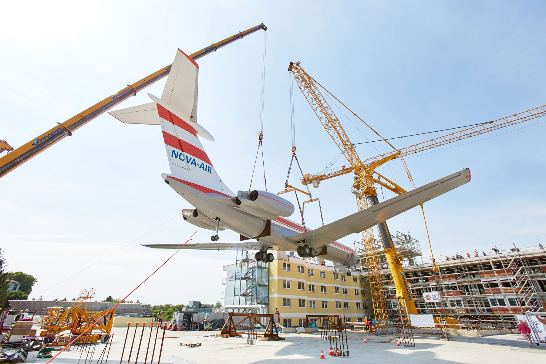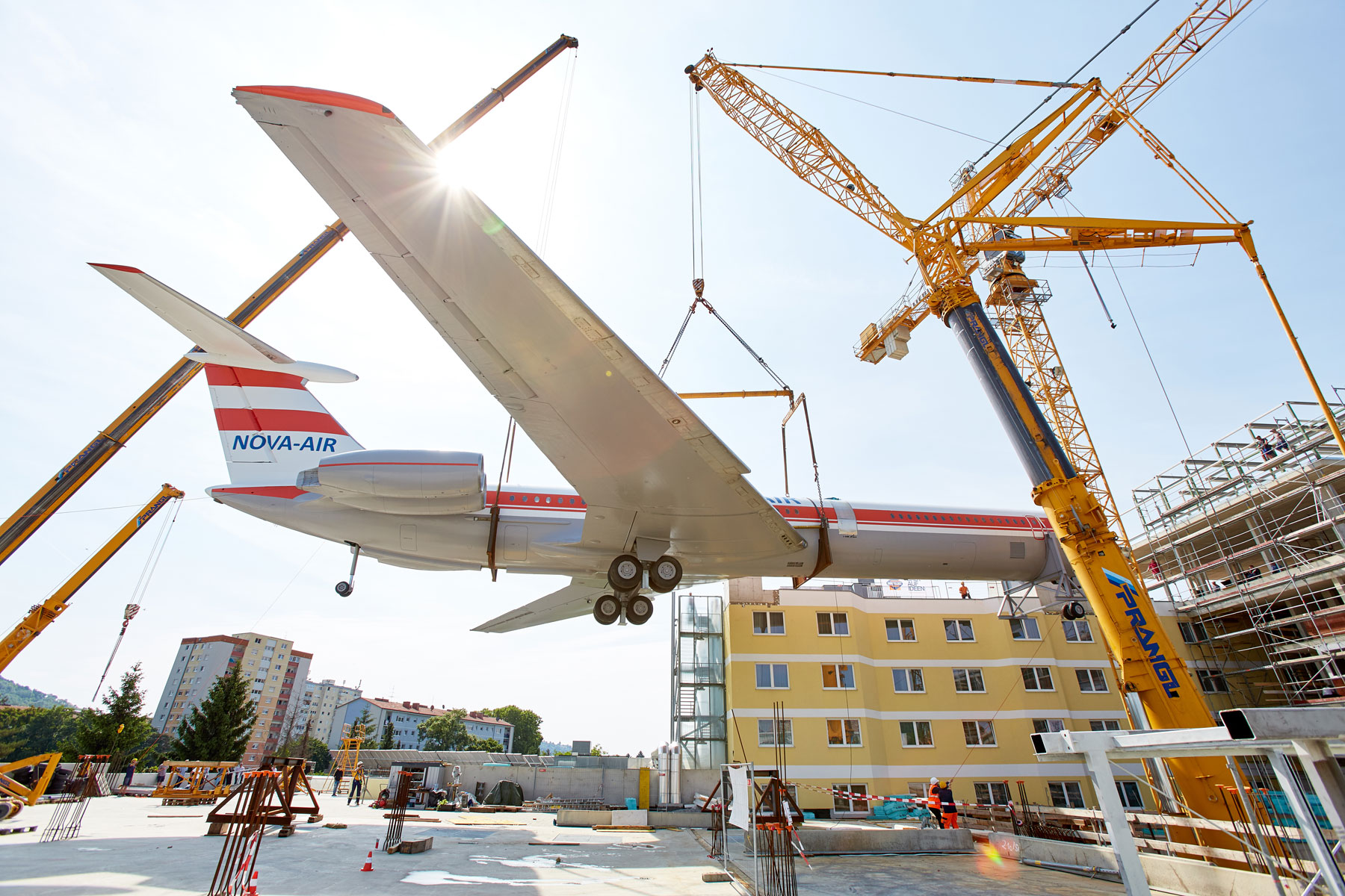 Miután a parkoló szinten több héten át szerelték össze a szerkezetet, a Prangl több hetes szünetet tarthatott. Amint elkészültek a munkával, a 62 tonnás gépet a szárnyakkal együtt egy 500 tonnás és egy 200 tonnás teleszkópos daru emelte fel a hotel tetejére, körülbelül 25 méteres magasságba. Graznak ezzel új látványossága van: A repülőgép pontosan „landolt” a hotel tetején. A Prangl csapat tökéletes teljesítménye vitte sikerre ezt a rendkívüli projektet. Erről számos kíváncsiskodó személyesen is meggyőződhetett.