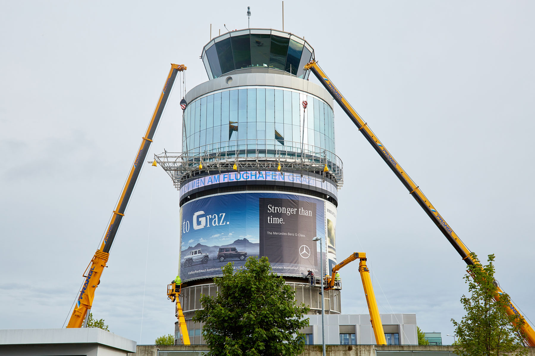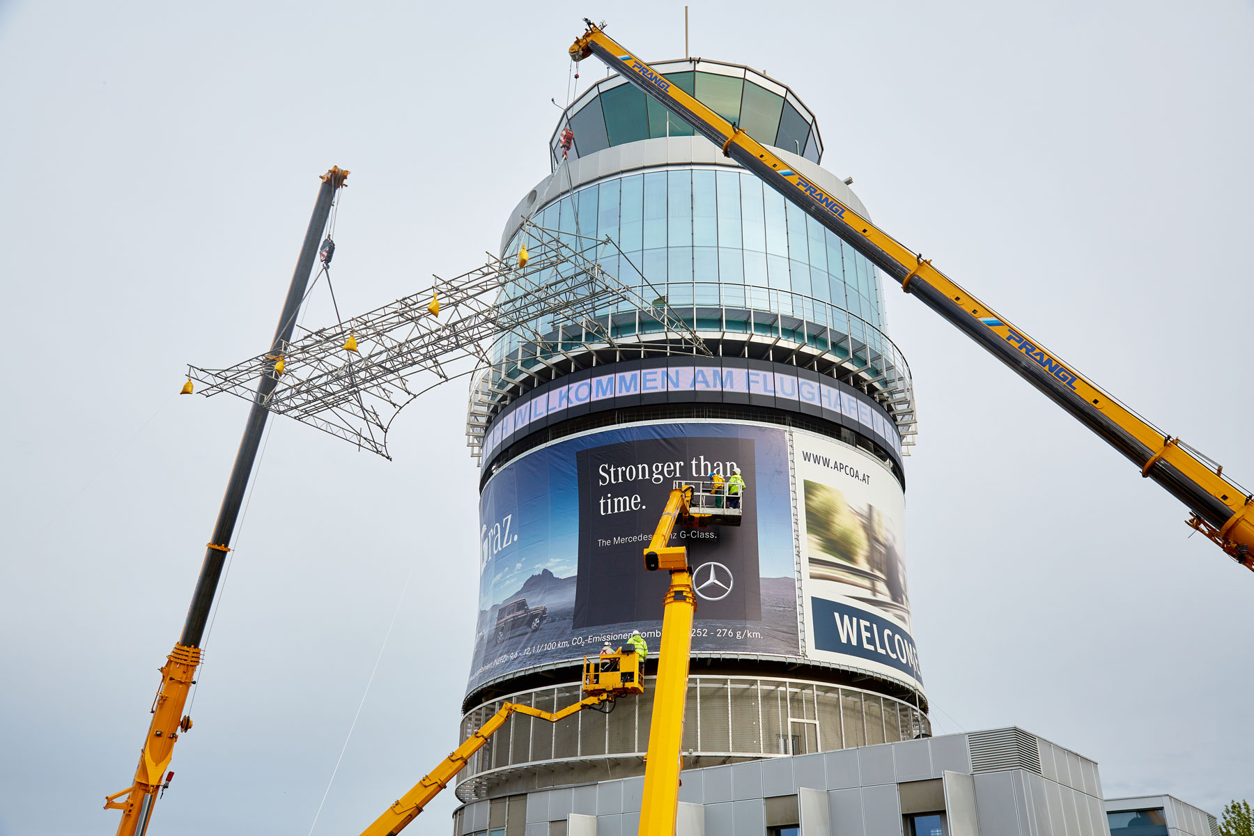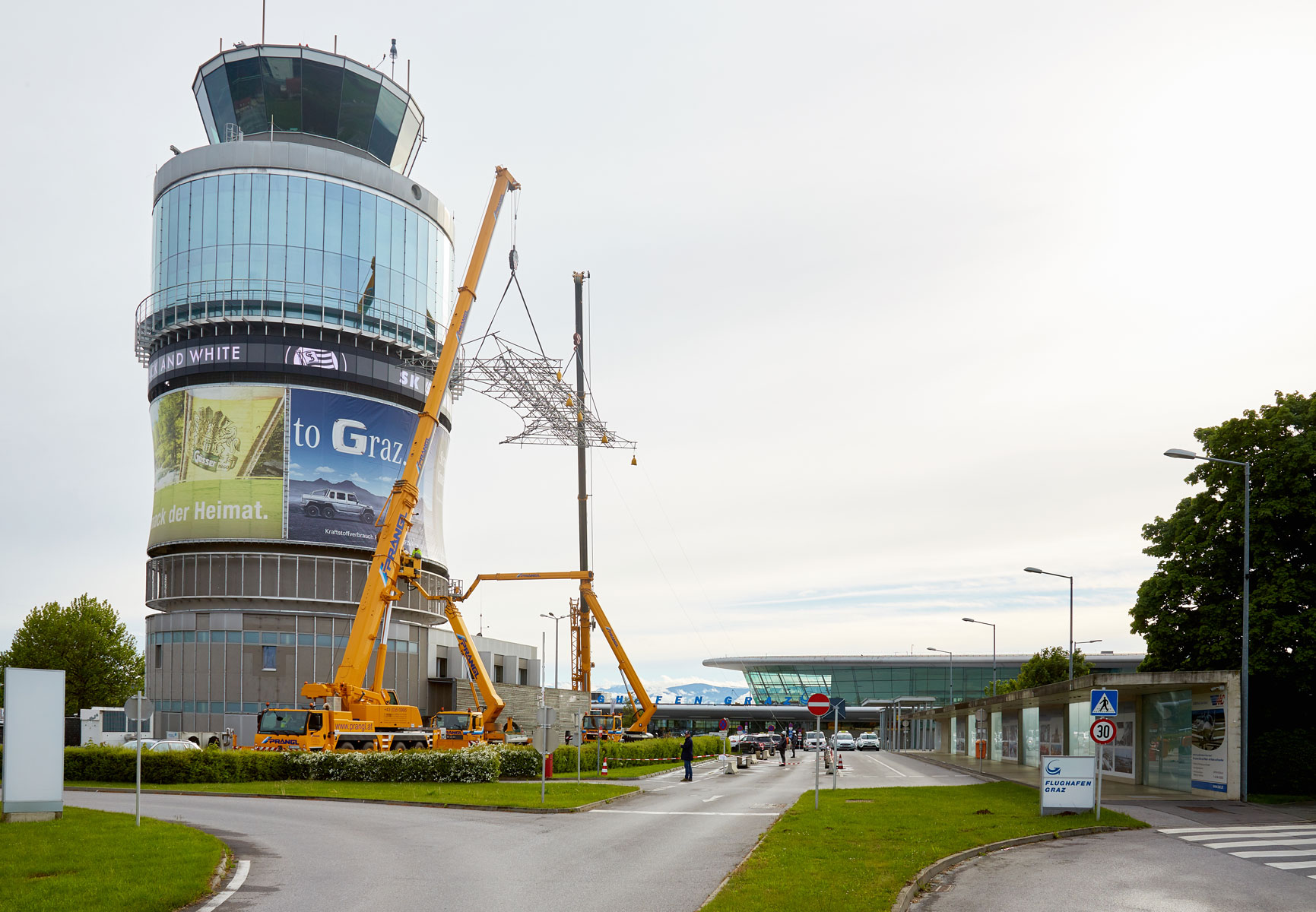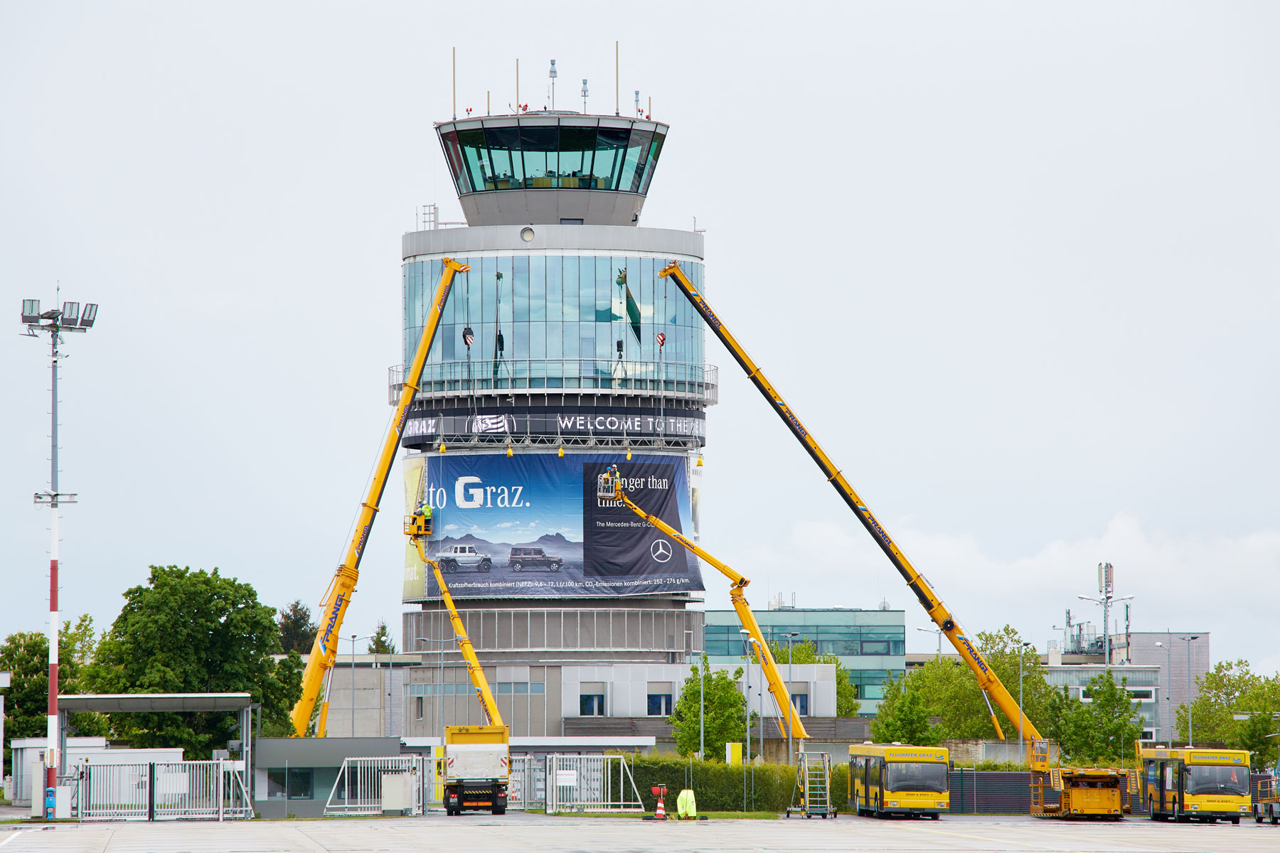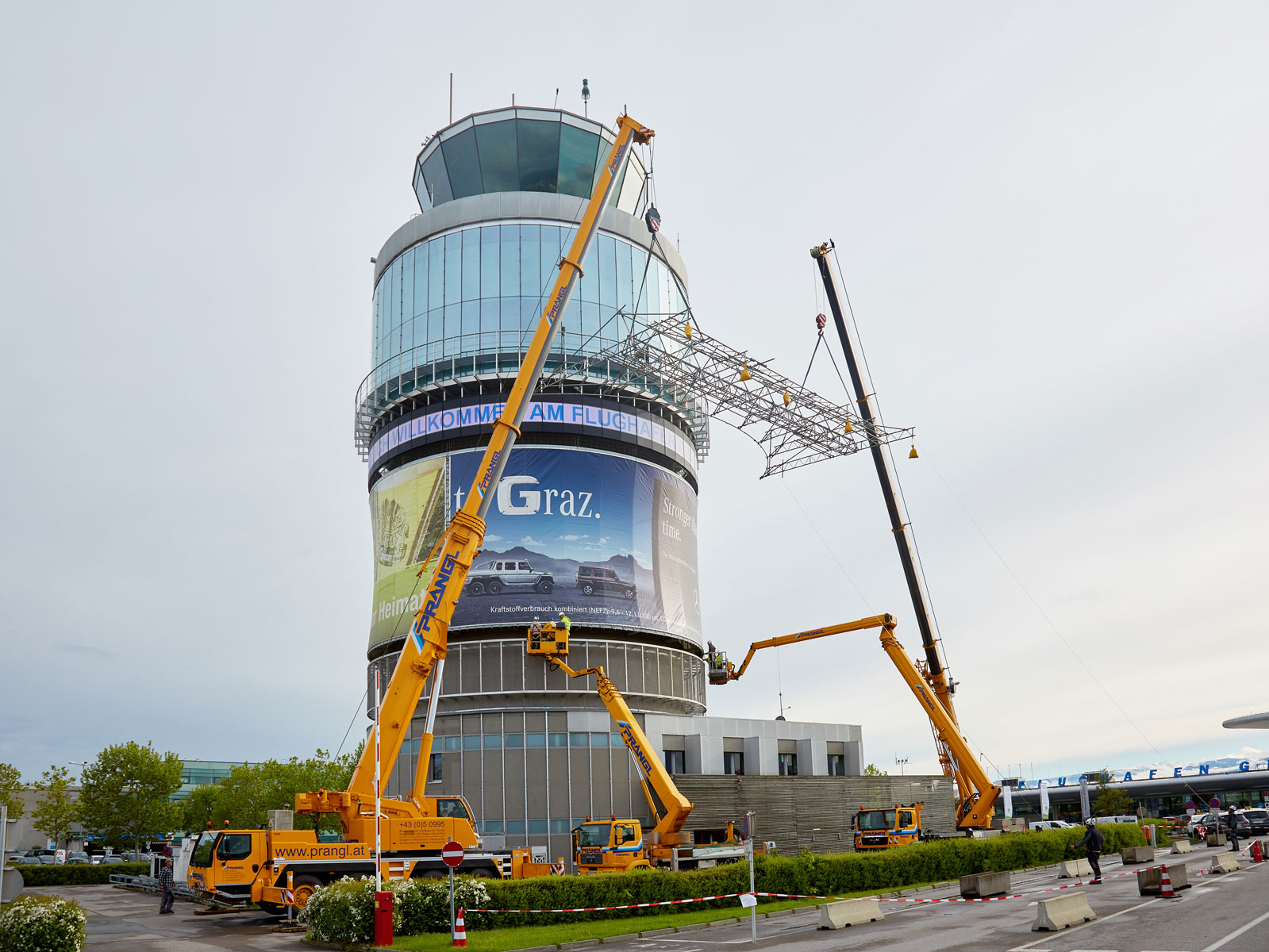 A repülőtéri irányítótoronynál végzett munkák esetén különleges biztonsági óvintézkedéseket kell tenni. Ezúttal három 30 méter hosszú és 7 méter magas hirdetőtáblát kellett lecserélni, amelyek közvetlenül a graz-thalerhofi repülőtér tornyához voltak erősítve. A hirdetőtáblák egyenként kb. 3,5 tonnát nyomtak.