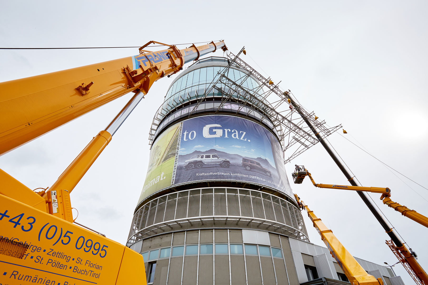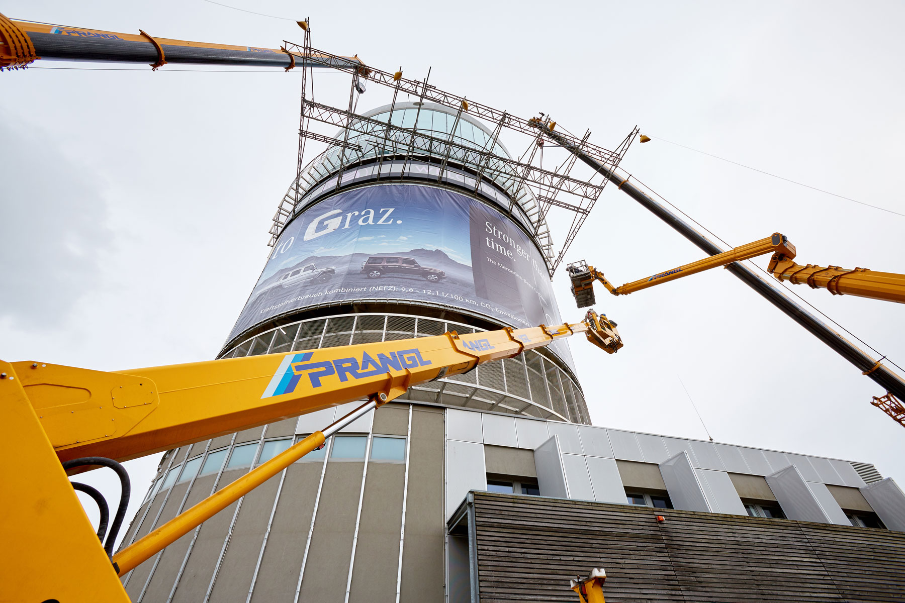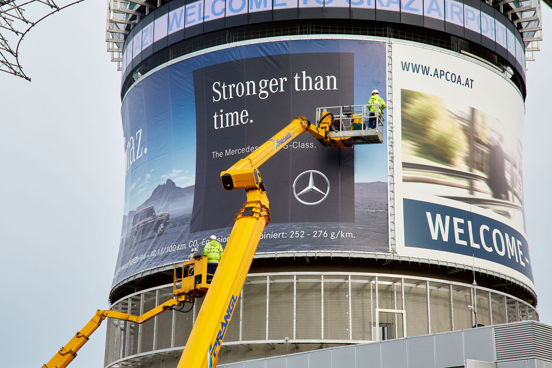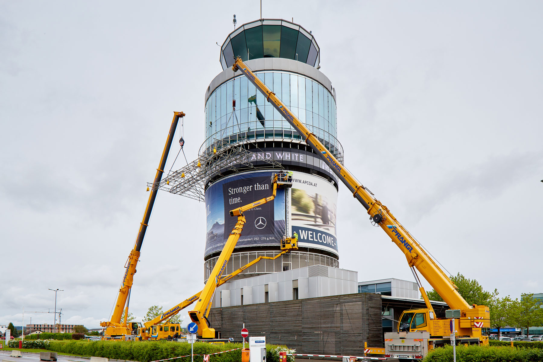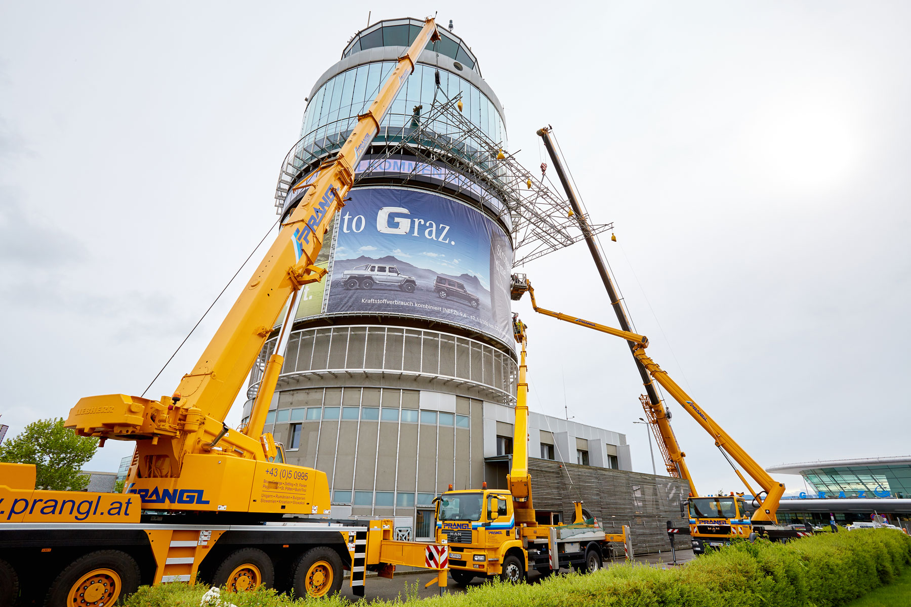 A repülőtéri irányítótoronynál végzett munkák esetén különleges biztonsági óvintézkedéseket kell tenni. Ezúttal három 30 méter hosszú és 7 méter magas hirdetőtáblát kellett lecserélni, amelyek közvetlenül a graz-thalerhofi repülőtér tornyához voltak erősítve. A hirdetőtáblák egyenként kb. 3,5 tonnát nyomtak.
