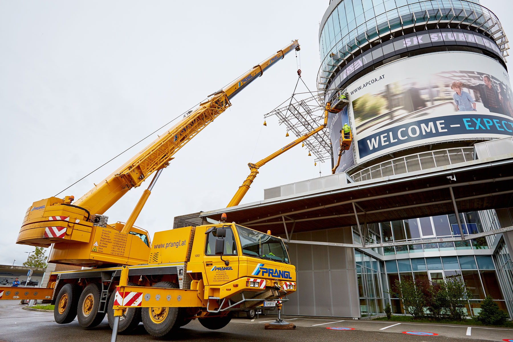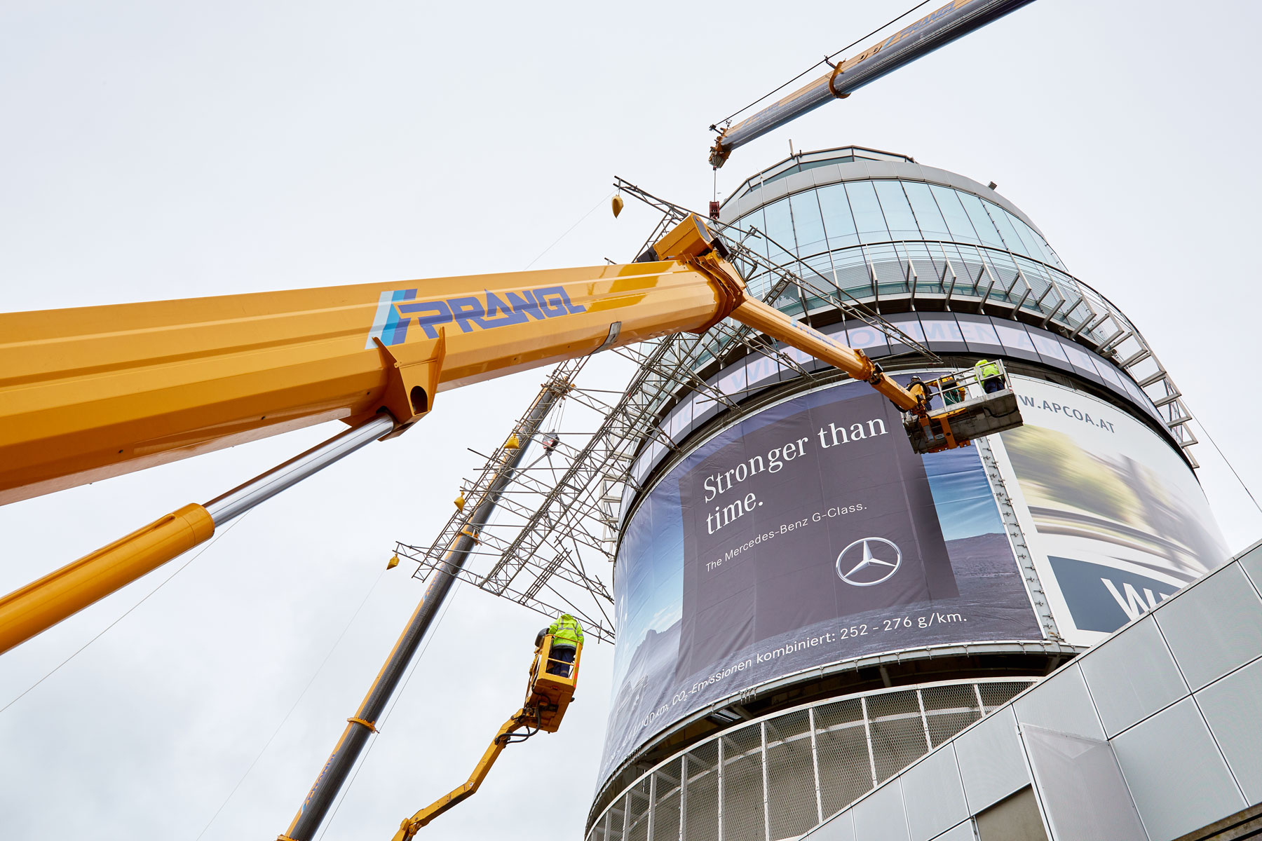 A táblák nagy mérete, és az abban a magasságban fújó erős szél miatt a transzparensek pontos emelése nagy kihívást jelentett. Ráadásul végig észben kellett tartanunk, hogy a megengedett maximális 30 méteres magasságot nem léphetjük túl. Hiszen itt a repülőgépek útvonalának közvetlen közelében vagyunk. A premstätteni Prangl telephely közelségének és a szakértők helyismeretének köszönhetően a Prangl gyorsan előállt a legmegfelelőbb koncepcióval.