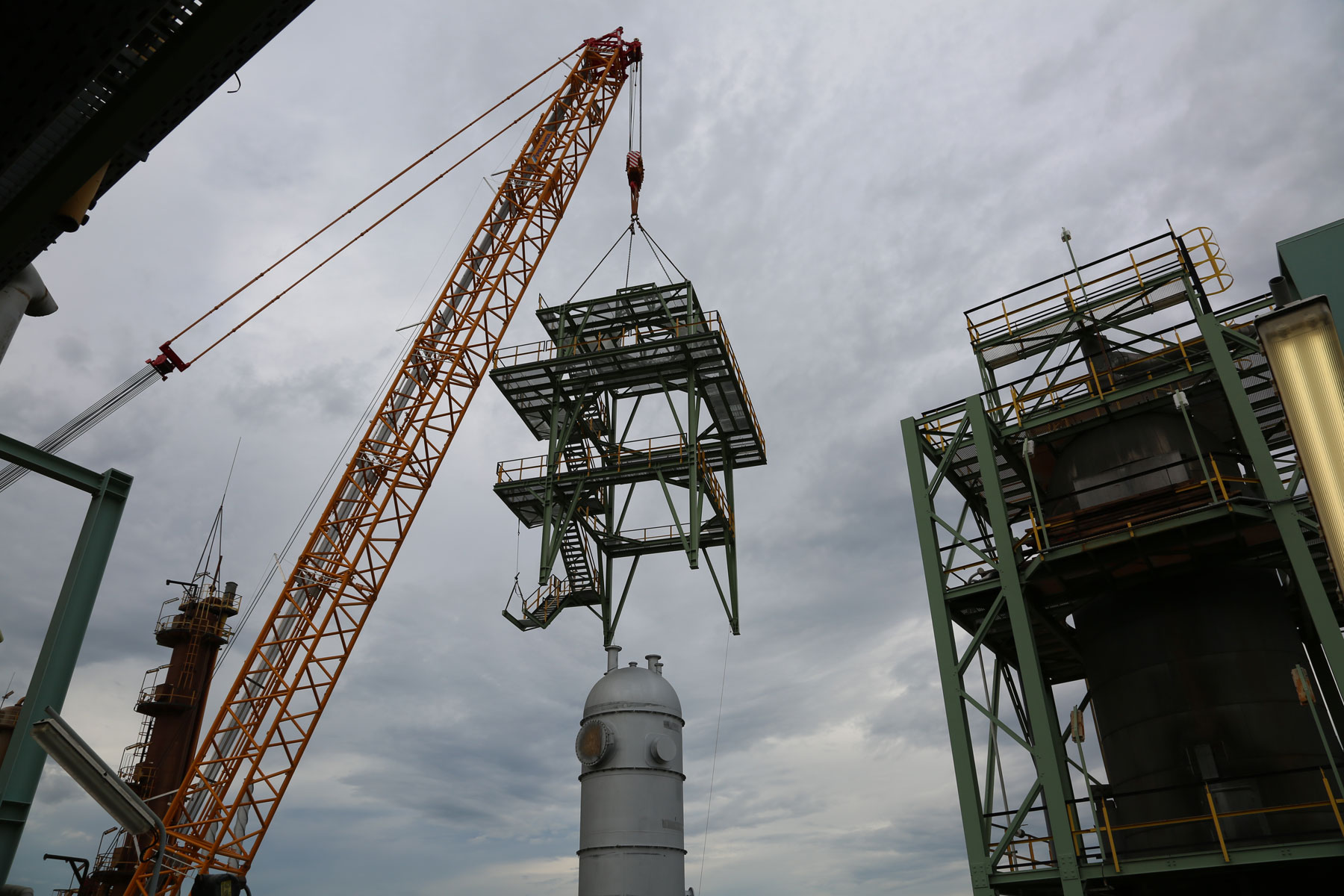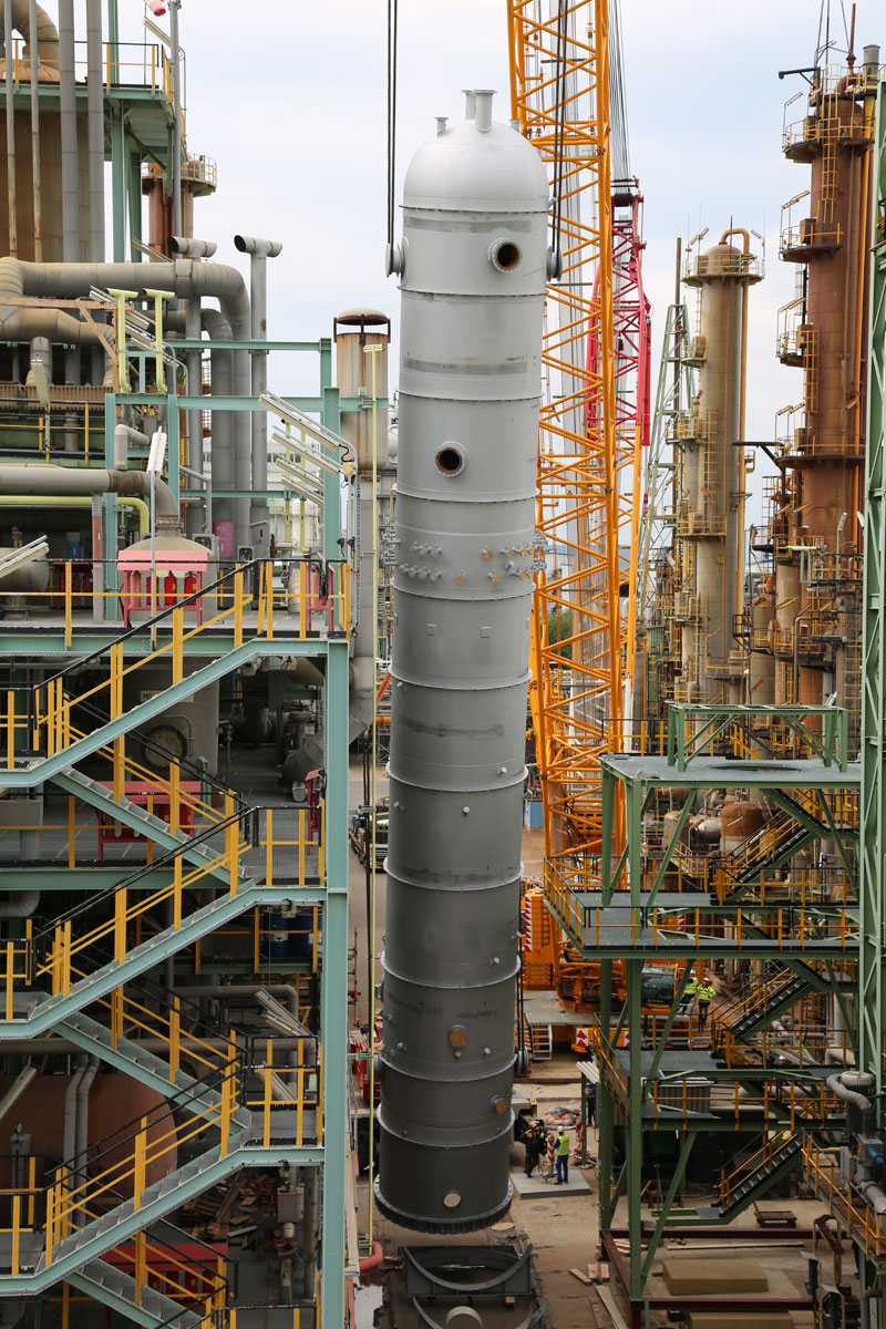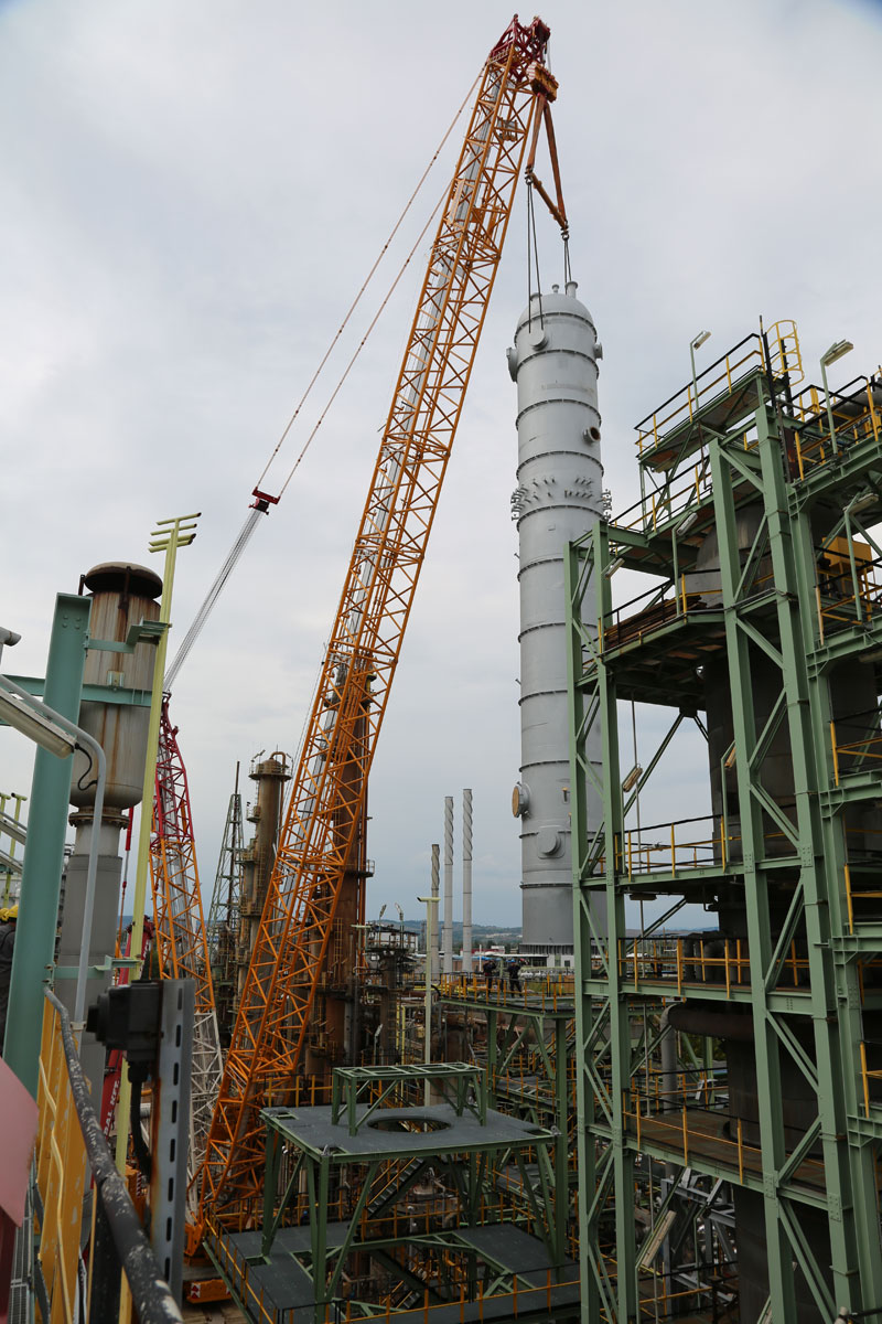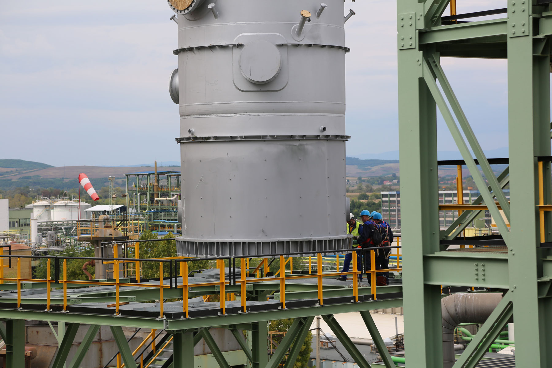 A 4,8 méter átmérőjű reaktort Délnyugat-Magyarországon készítették, és teherautó szállította Kazincbarcikára. Az ottani vegyi üzemben a berendezést egy 650 tonnás lánctalpas daru és egy 250 tonnás teleszkópos daru fogadta. A reaktort tandememeléssel előbb úgy fordították, hogy a nagy daru számára elérhető legyen, és be tudja emelni a végleges helyére. Ahhoz, hogy a művelet biztonságosan végezhető legyen, a lánctalpas darura egy 72 méteres gémet és egy 460 tonnás ellensúlyt szereltek. A kolosszus összesen 721,6 tonnát nyomott.
