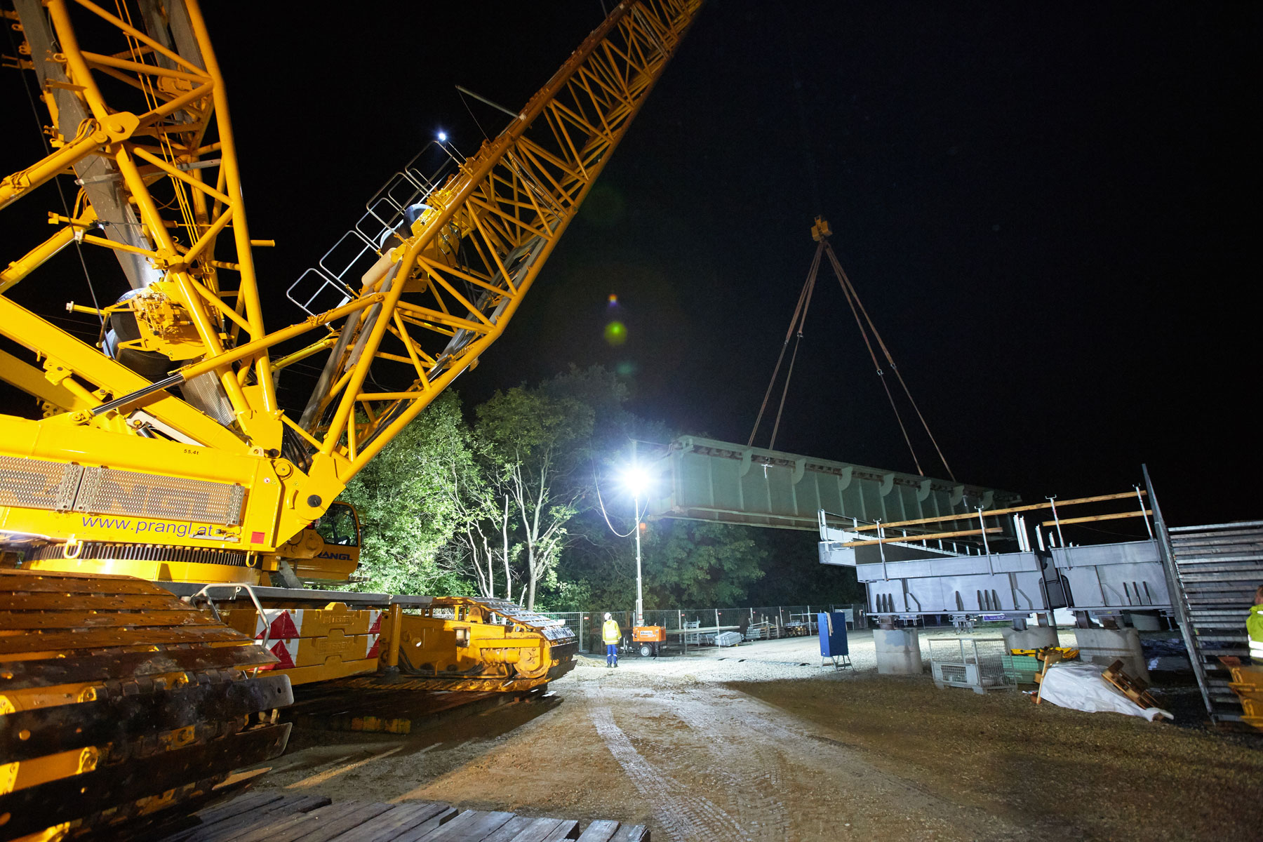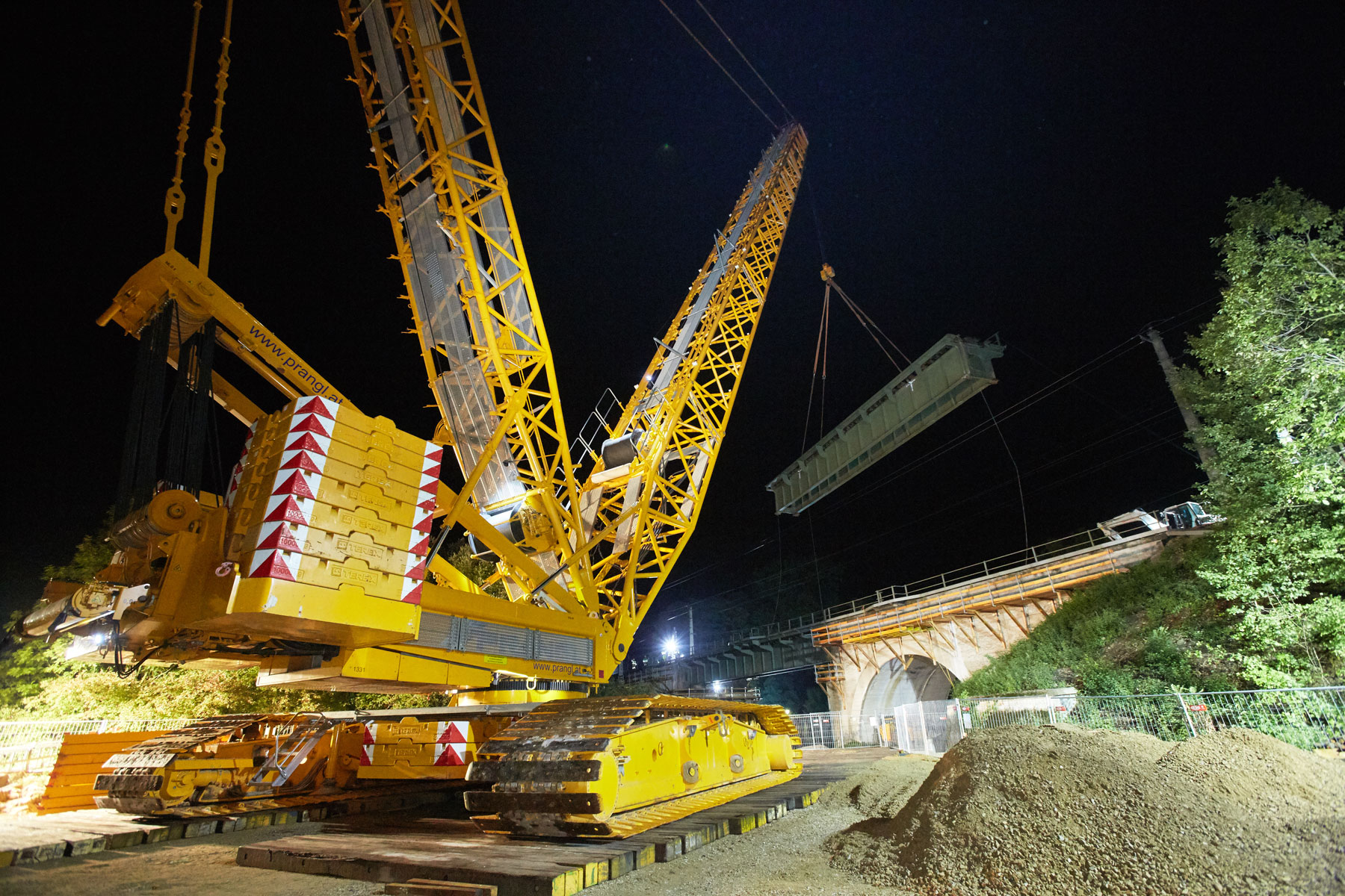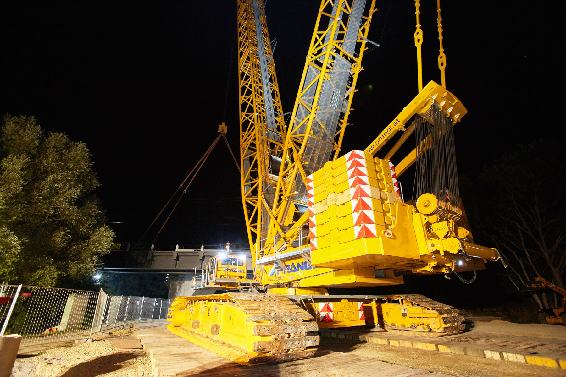 A szűkös hely miatt egy szomszédos BMX-pályát és egy strandröplabda-pályát is át kellett alakítani, hogy a daru felállításához alkalmasak legyenek. A Prangl szakértői ebben is kezdettől fogva részt vettek. Ahhoz, hogy a vasúti forgalmat minél kevésbé akadályozzuk, volt egy fix időablak (00:00 órától 06:00 óráig), amikor a vágányok mindkét oldalon le voltak zárva. Az ilyen éjszakai emelések minden esetben a darukezelő fokozott figyelmét igénylik. Nehezítő körülmény volt, hogy a híd szelvényeit a villanyvezetékek fölött kellett beemelni.
