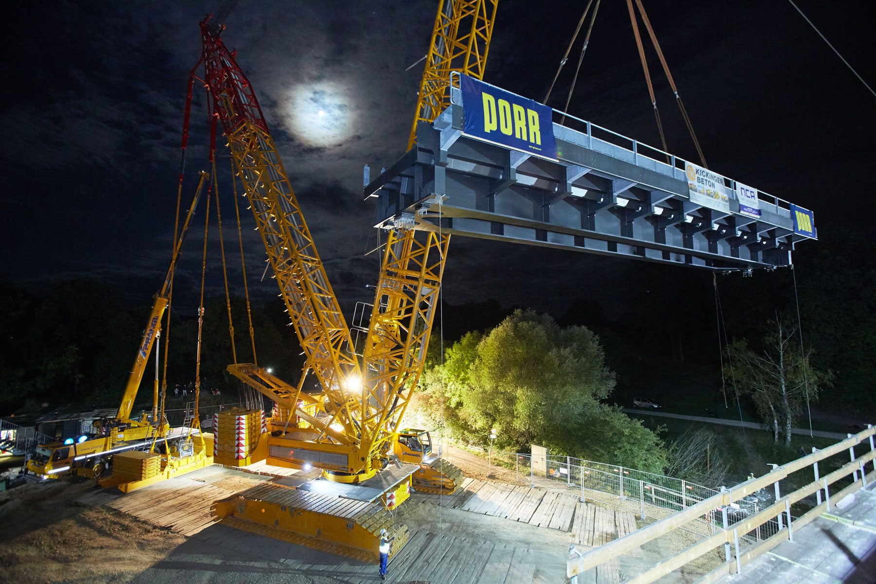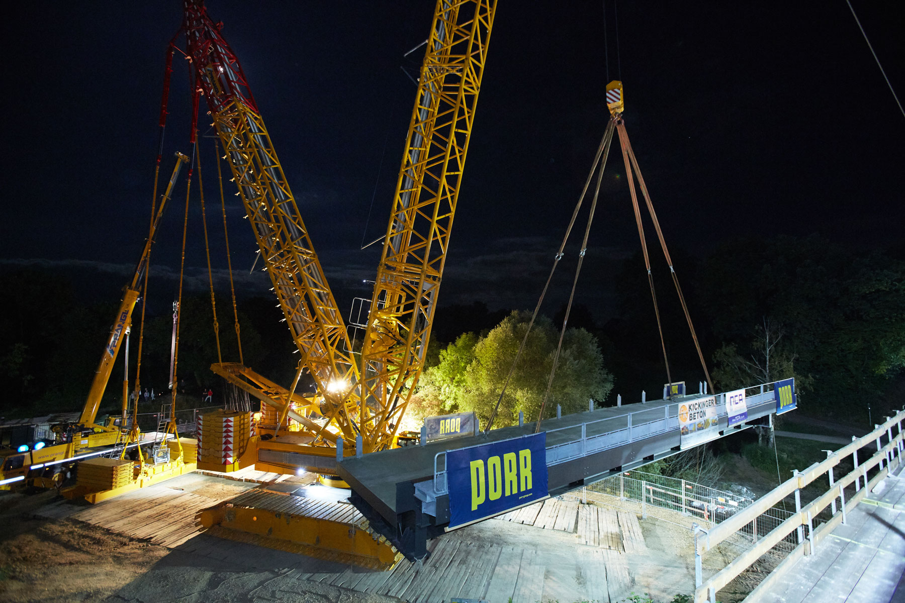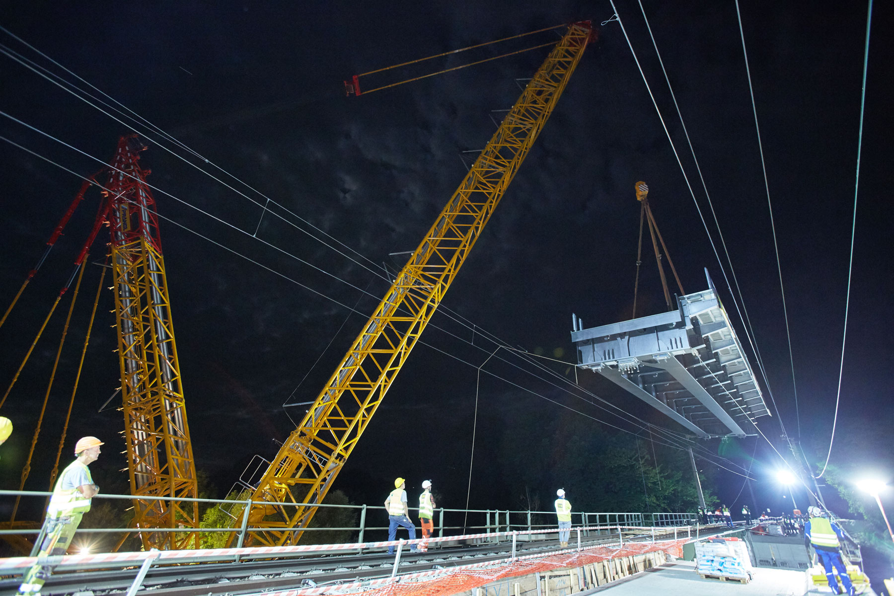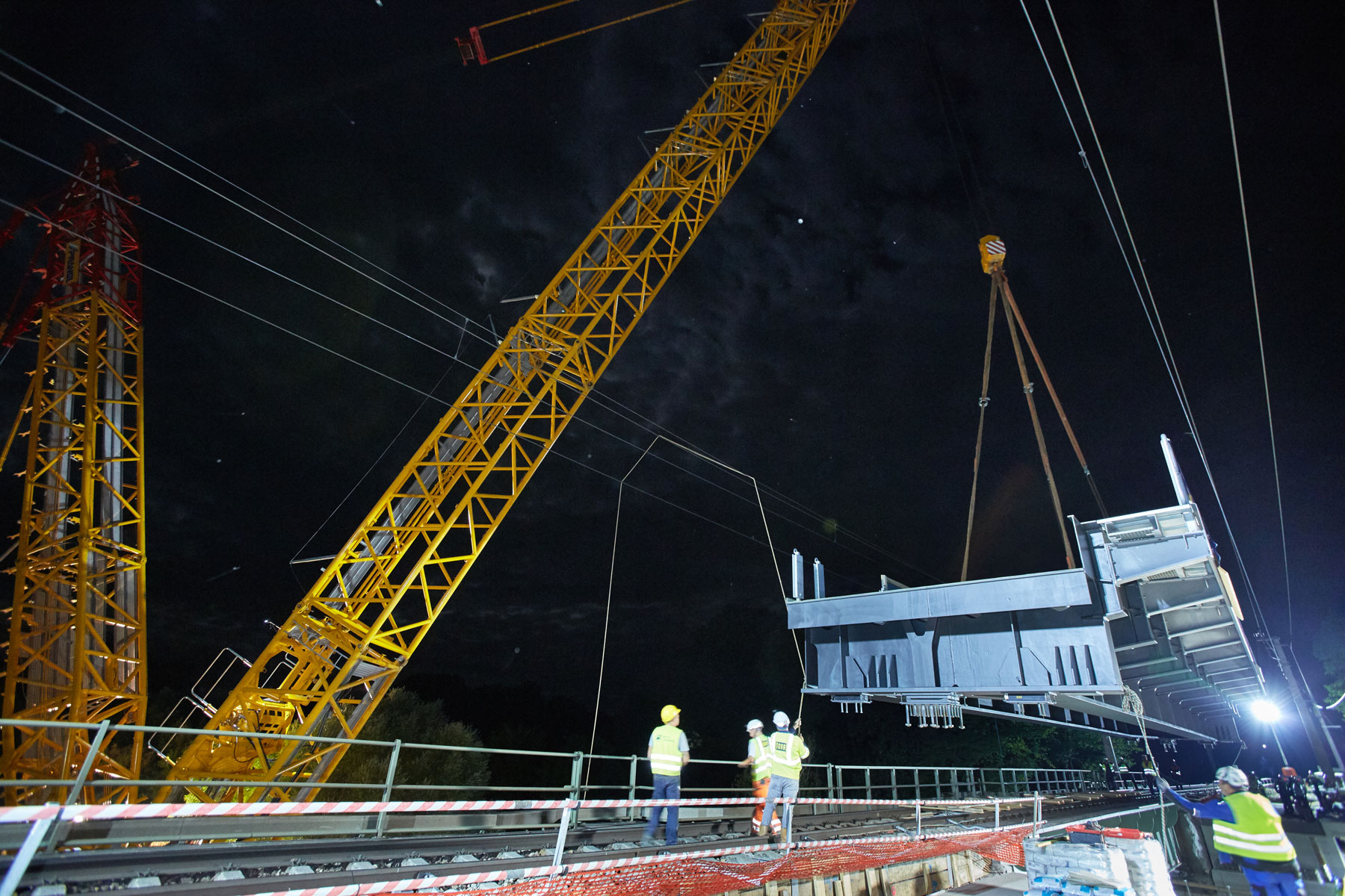 A szűkös hely miatt egy szomszédos BMX-pályát és egy strandröplabda-pályát is át kellett alakítani, hogy a daru felállításához alkalmasak legyenek. A Prangl szakértői ebben is kezdettől fogva részt vettek. Ahhoz, hogy a vasúti forgalmat minél kevésbé akadályozzuk, volt egy fix időablak (00:00 órától 06:00 óráig), amikor a vágányok mindkét oldalon le voltak zárva. Az ilyen éjszakai emelések minden esetben a darukezelő fokozott figyelmét igénylik. Nehezítő körülmény volt, hogy a híd szelvényeit a villanyvezetékek fölött kellett beemelni.