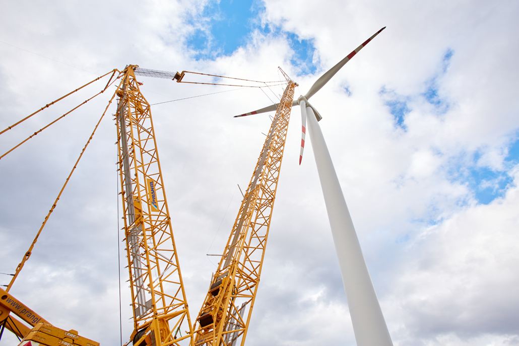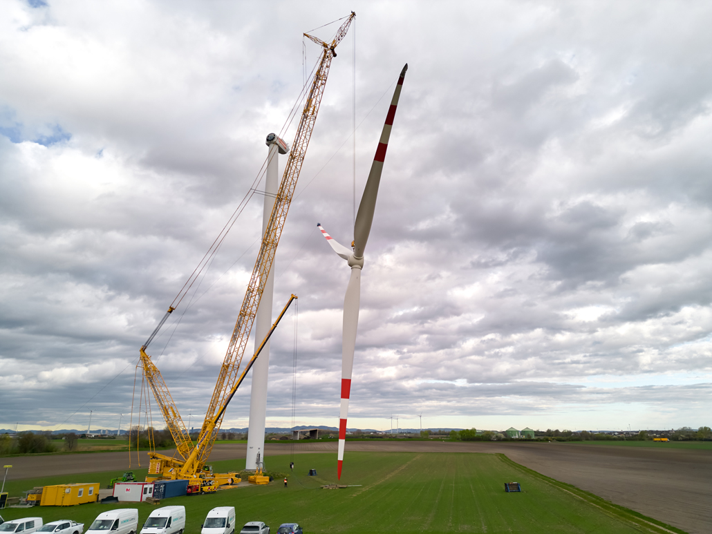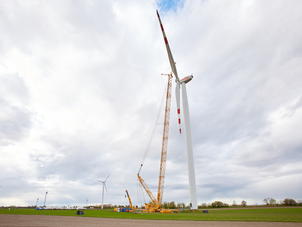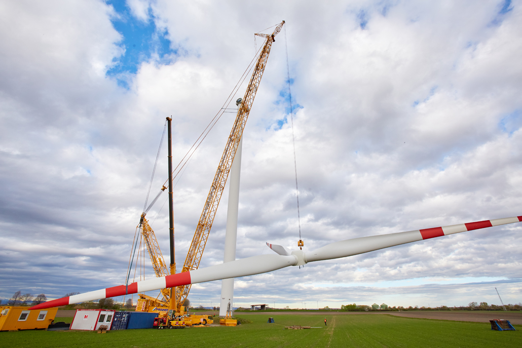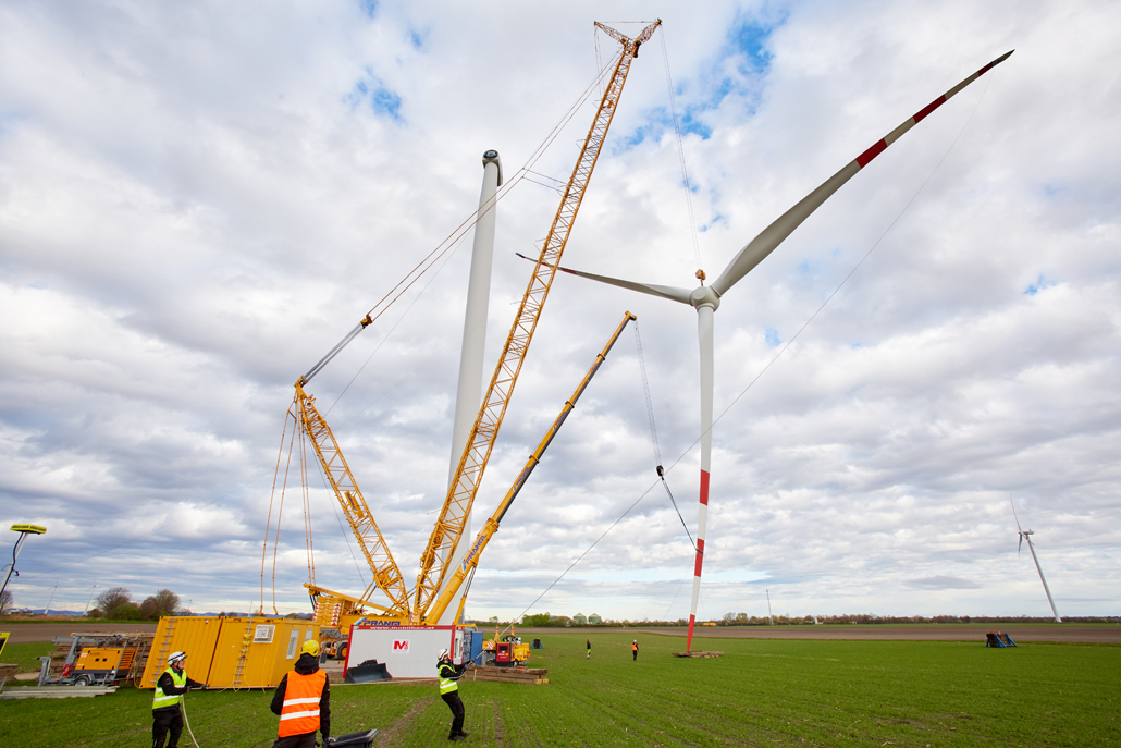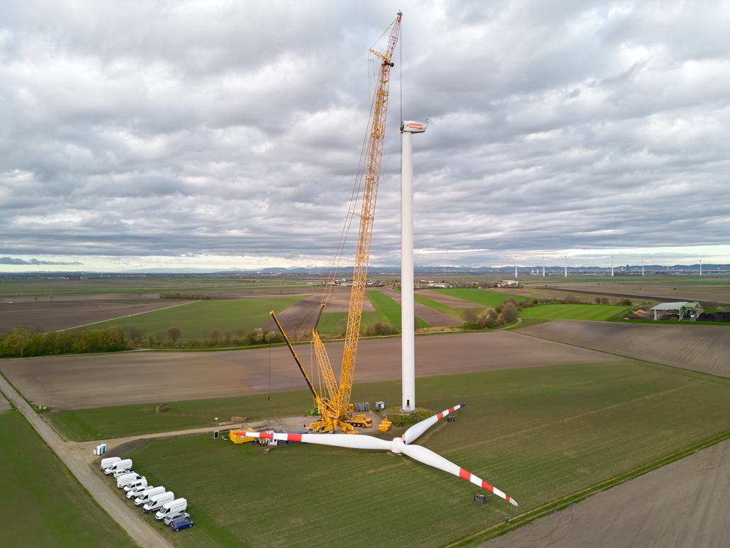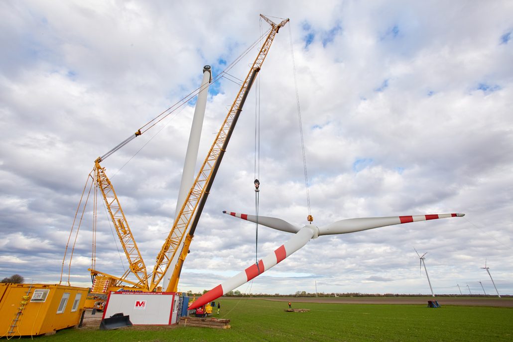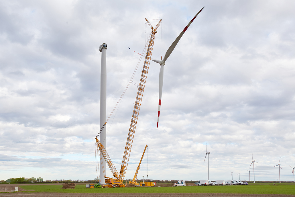 A javításhoz a kerékagyból és rotorlapátokból álló, mintegy 45 tonna súlyú „rotorcsillagot” 100 méter magasból kellett leemelni két turbinánál. Ez 110 méteres horogmagasságot eredményezett a nagy daruhoz. Ennek eredményeként a csapat egy 600 tonnás rácsos gémű darut választott fő darunak, mivel ez tökéletes ehhez a turbinatípushoz. Nagyon erős, hosszú gémje van, gyorsan felállítható és mozgatható. A rácsos gémű darut a követelményeknek megfelelően konfigurálták: 120 méteres gémhossz, 160 tonna ellensúly és 65 tonna SL ellensúly.