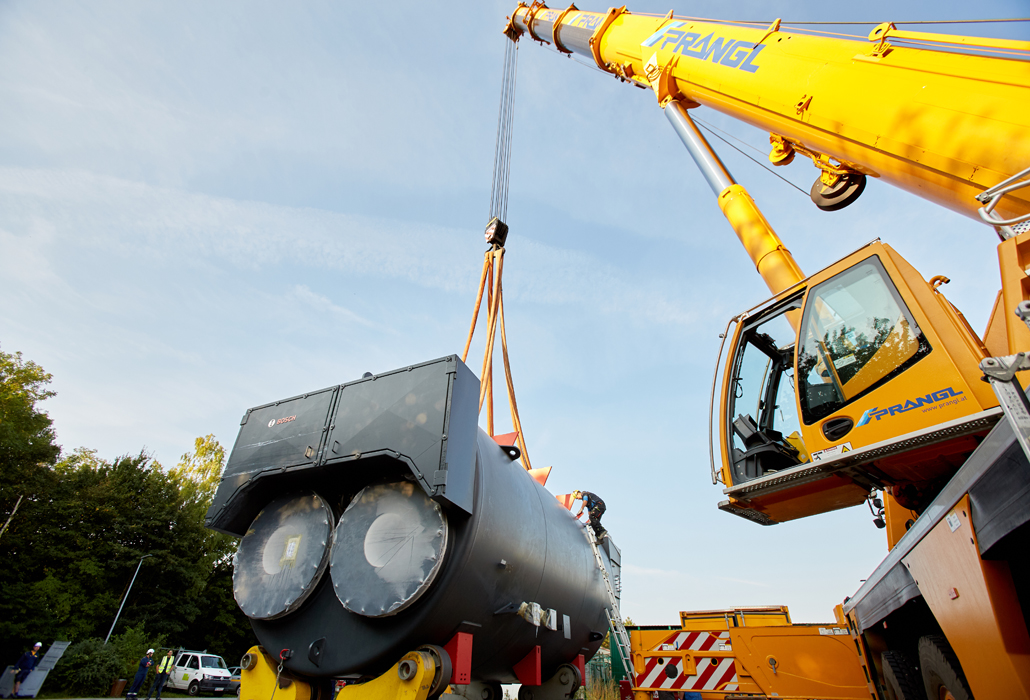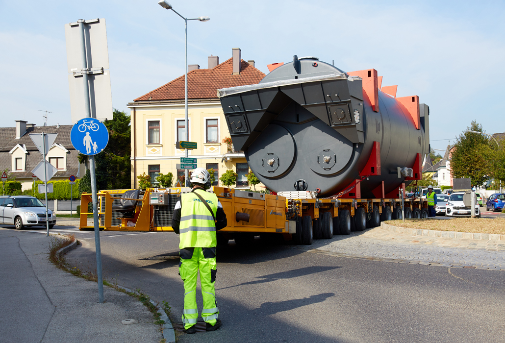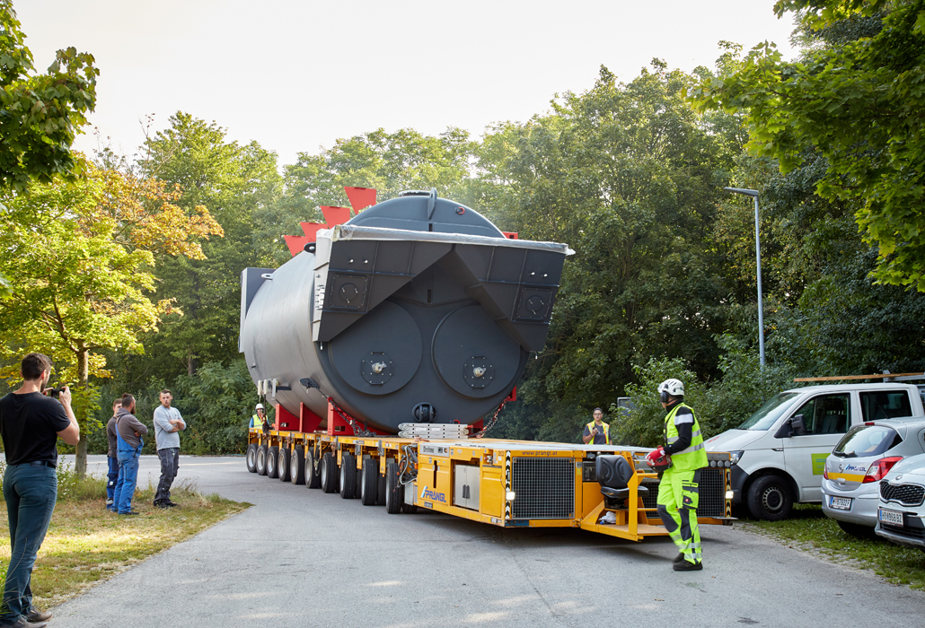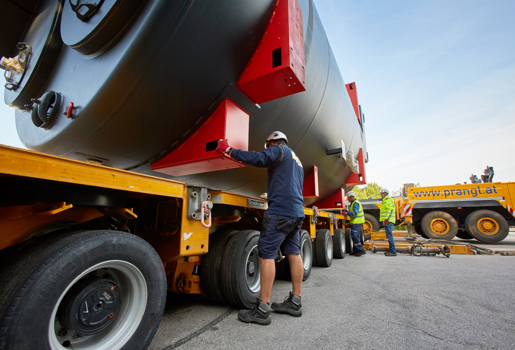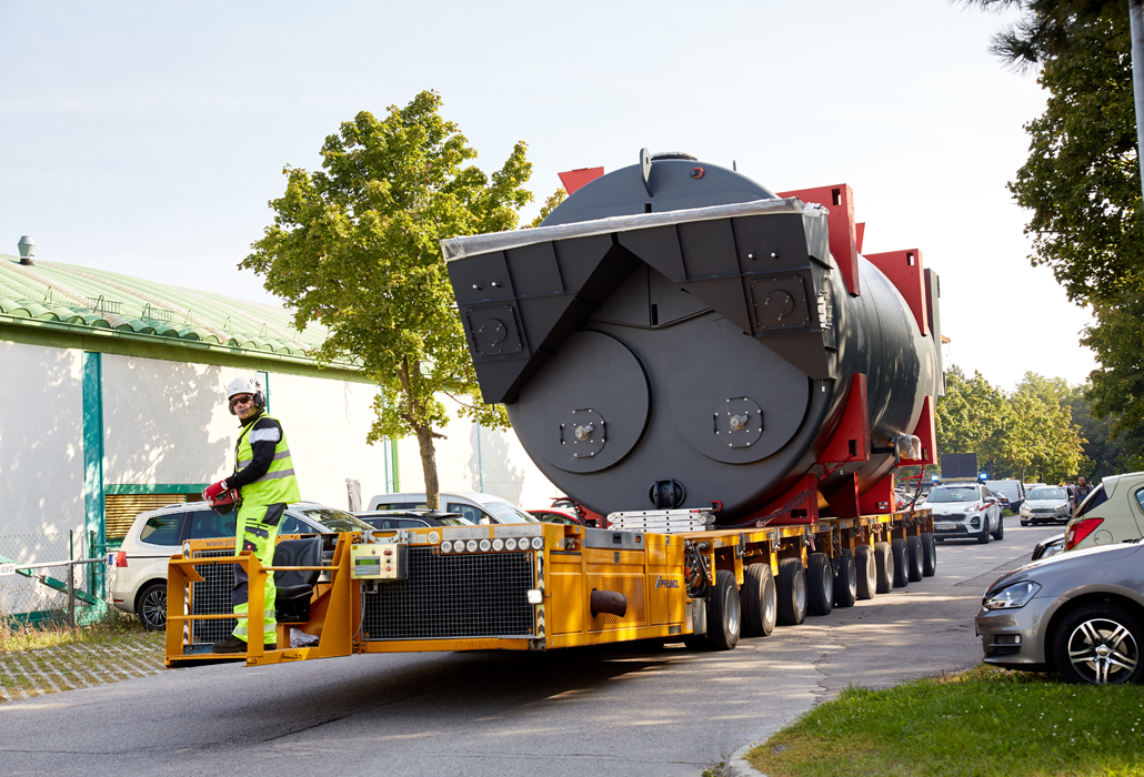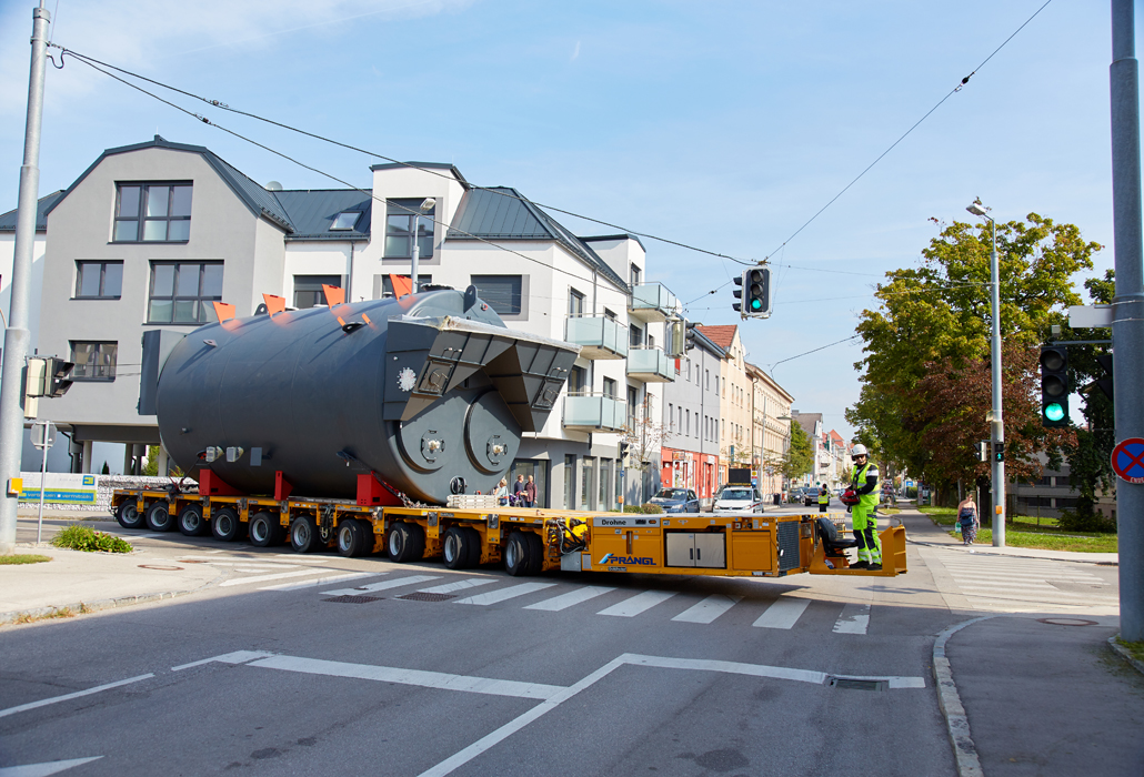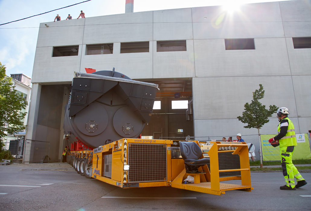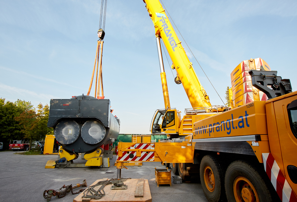 A feladat befejező műveletével a Prangl szakértői ismét bizonyíthatták a "mindent egy kézből" koncepció sikerét az új épületben. A Pranglnál egy kézben volt a teljes logisztika a rakodástól a közúti szállításon át a speciális berendezések behozataláig. A tervezési folyamat gyorsan az alternatív megoldásokra fókuszált. Csak a PHP 63 hidraulikus emelőportál jöhetett szóba, mint kompakt és erős emelőeszköz. Az utolsó néhány métert egy villás targonca és nagy teherbírású görgők segítségével sikerült megtennie a berendezésnek végső pozíciójáig. Modern technológia nemcsak az energiatermeléshez, hanem az oda vezető úton is.