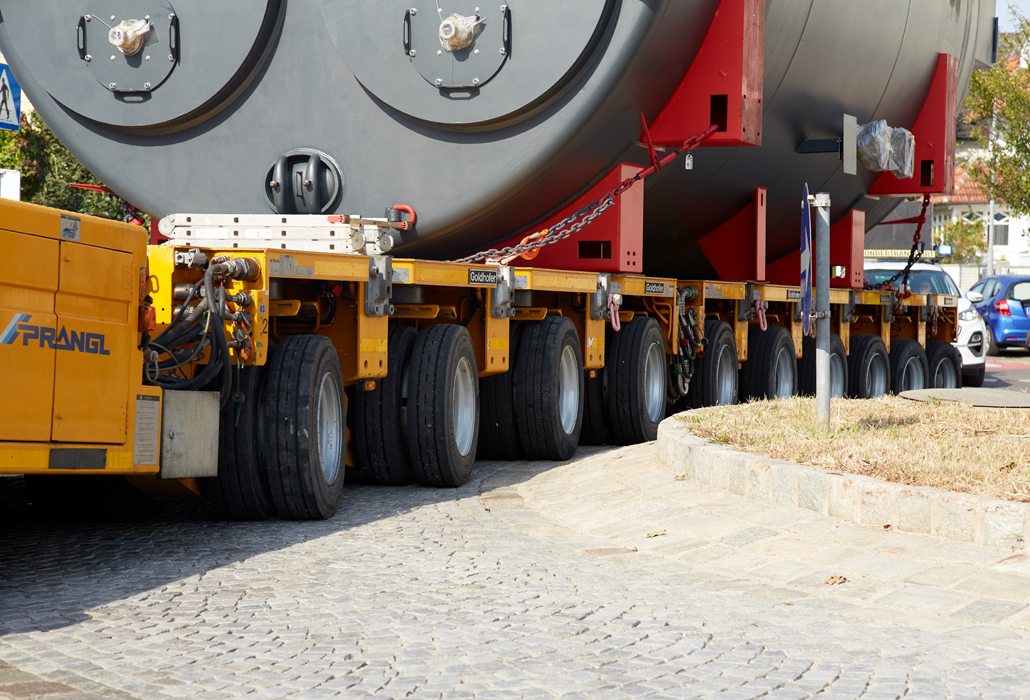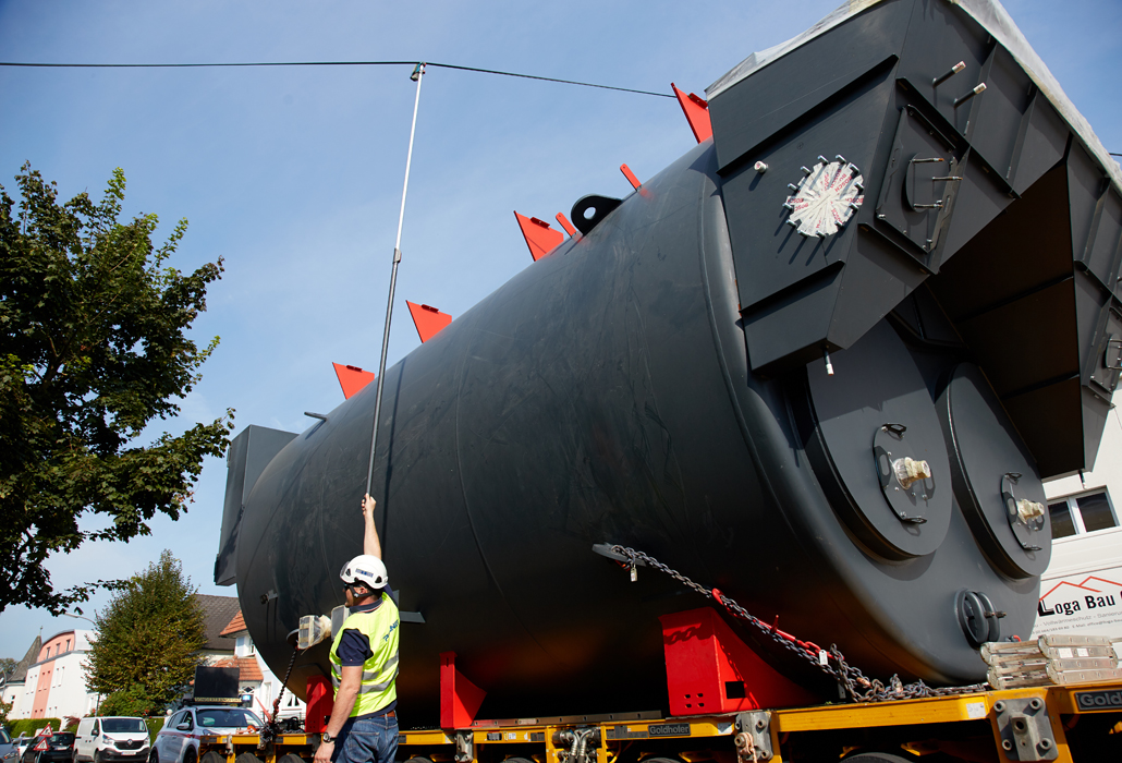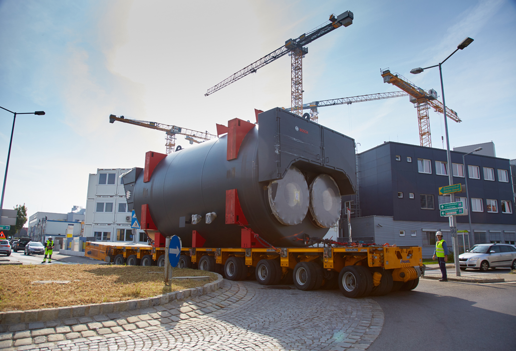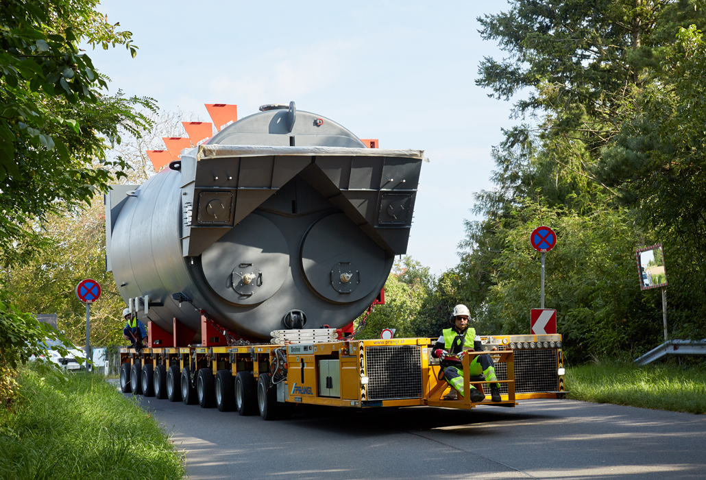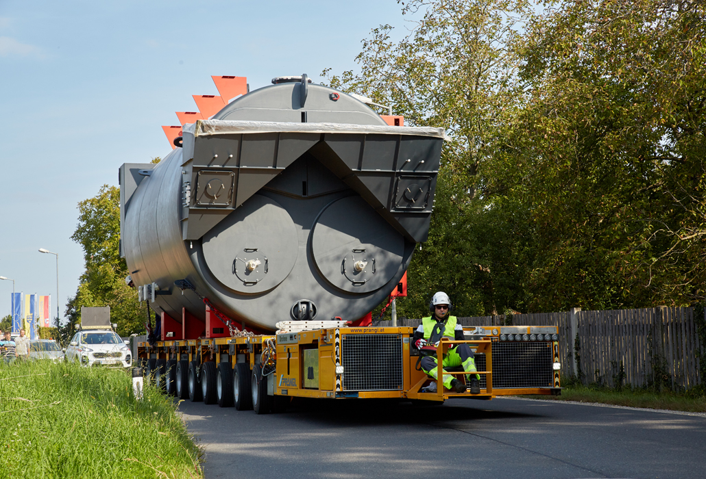 Van, hogy nem a szállítási útvonal határozza meg a nehéz szállítójárművet, hanem a rendeltetési hely tulajdonságai. Mivel az északi távfűtőerőmű bejárata túl keskeny volt, nem lehetett "hagyományos" nehézvontatóval közlekedni. Egy 10 tengelyes, önjáró nagy teherbírású járművel azonban ez a szűk hely is gond nélkül leküzdhető. A 4,6 méteres magasságával ismét a melegvizes kazán jelentette a legnagyobb kihívást - különösen az elektromos vezetékek alatti közlekedés során. Ezzel a kazánnal a "hátán" az önjáró jármű körülbelül 118 tonna volt.