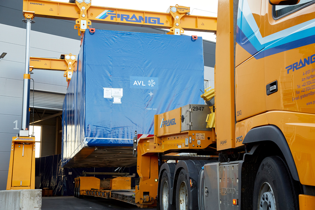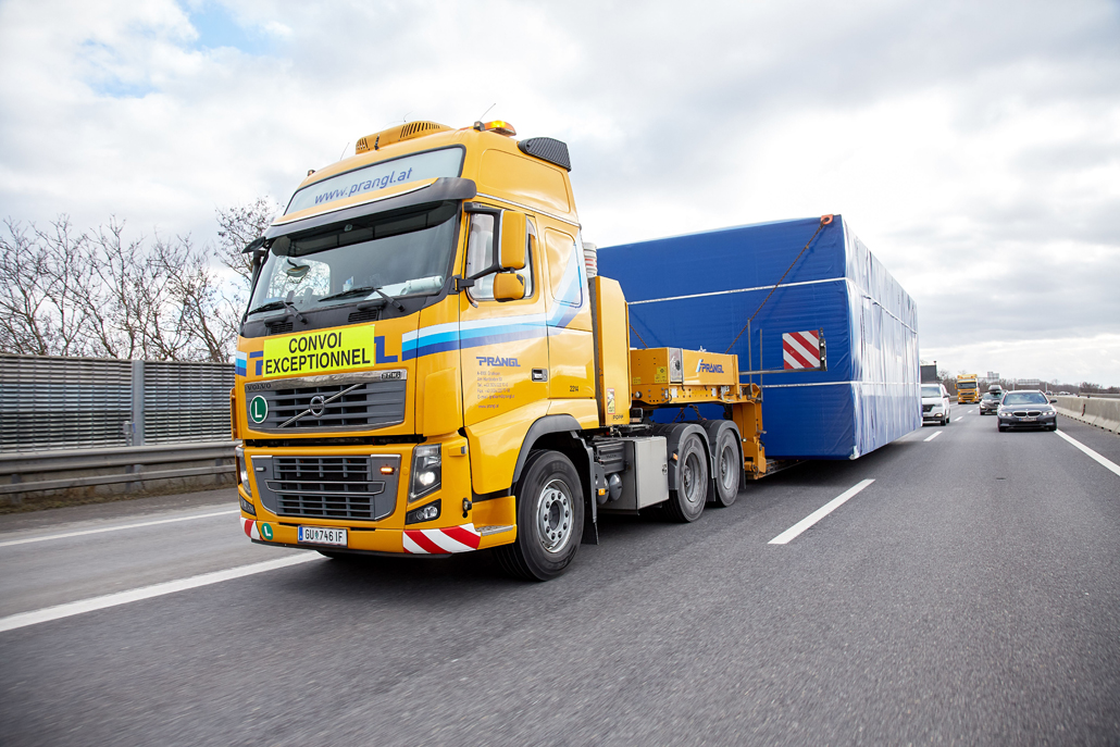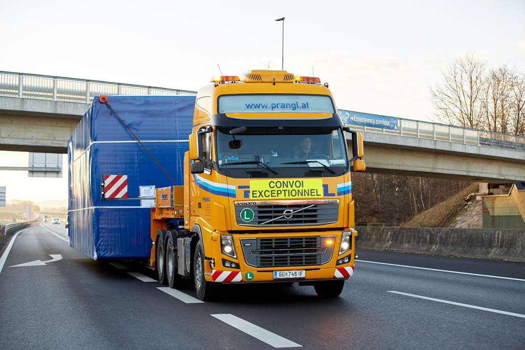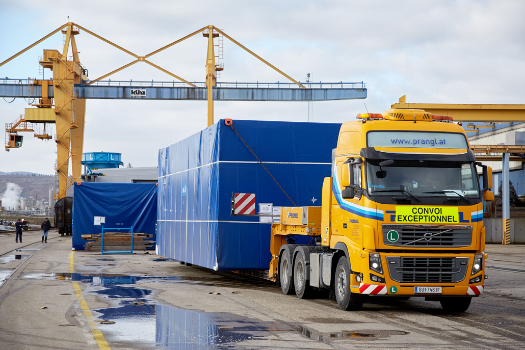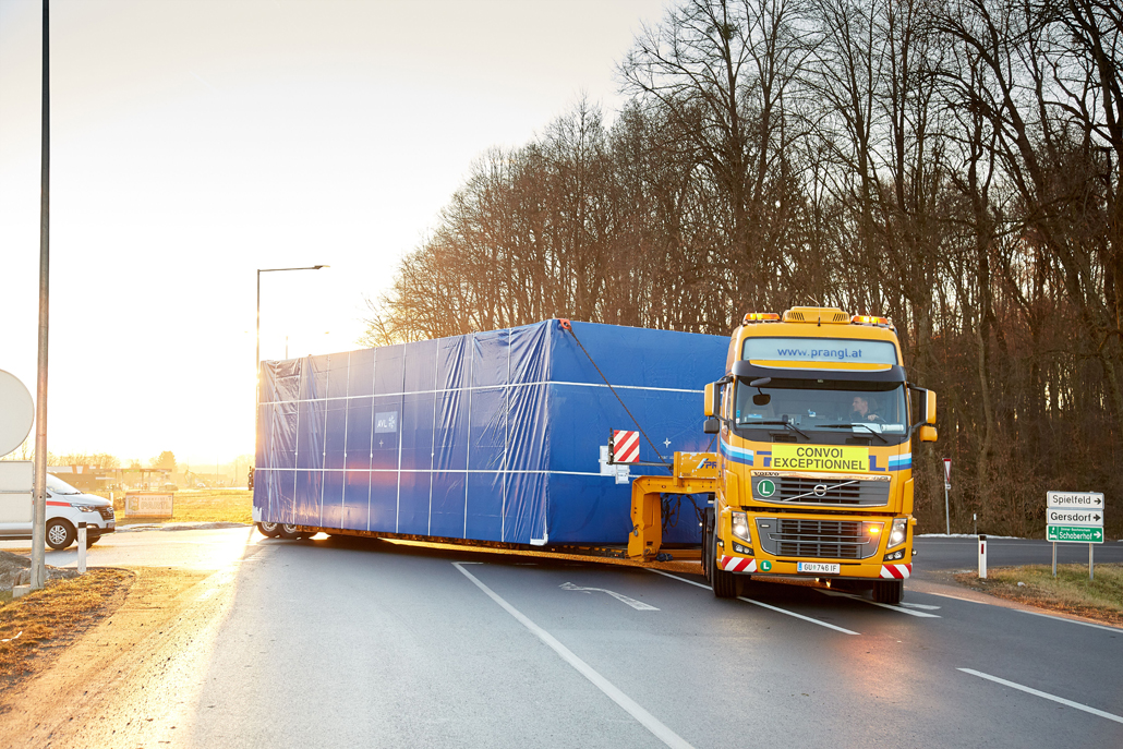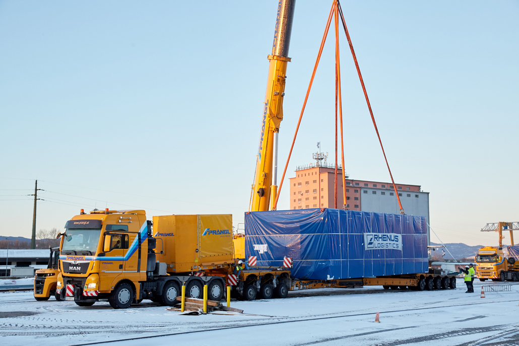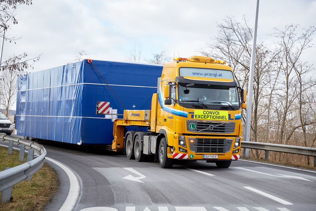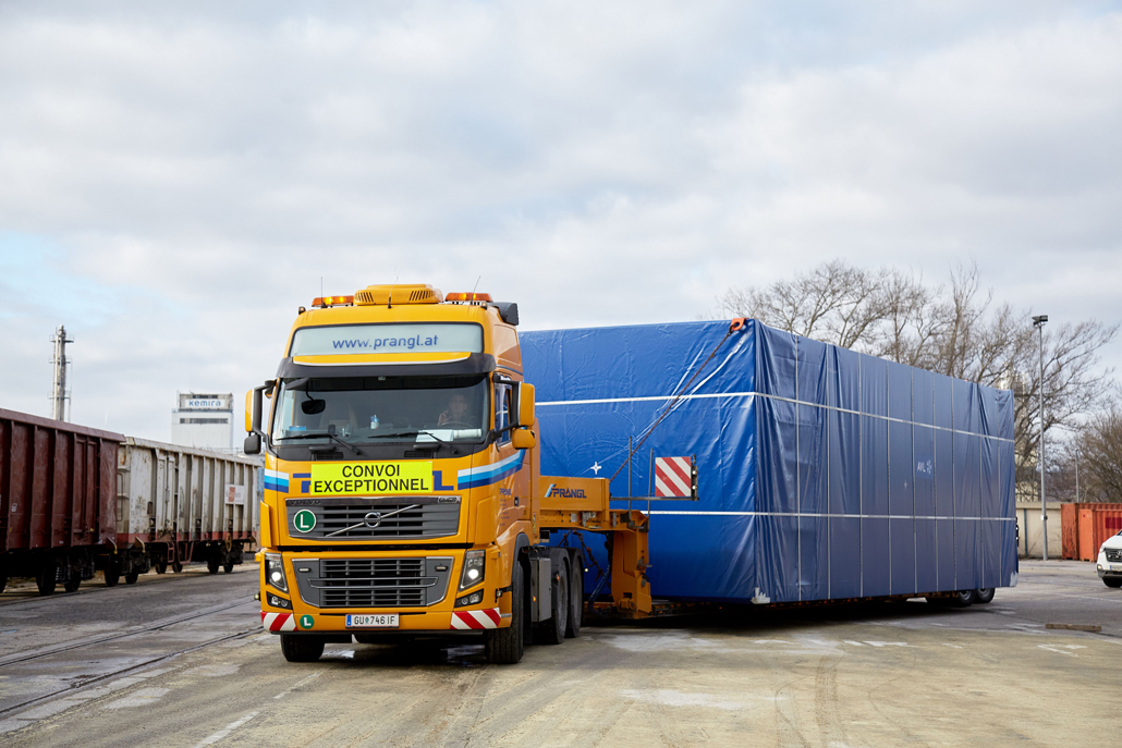 A 12 modult (egyenként 13,3 méter hosszú, 4,1-5,6 méter széles, 3,6-4,0 méter magas és 17-58 tonna súlyú) nagy teherbírású görgők és emelőportálok segítségével hozták ki a raktárból, hogy aztán a Prangl speciális szállítójárműire rakodják. A 3 és 4 tengelyes vontatók és a különböző pótkocsik (2 tengelyes, 3 tengelyes, 2+4 tengelyes alacsonypadlós félpótkocsi, 3+5 tengelyes tartályszállító, valamint 6 tengelyes mélybölcsős félpótkocsi) optimális kombinációit használták az előfuvarozáshoz, tekintettel az Ausztriában lehetséges maximális méretekre.