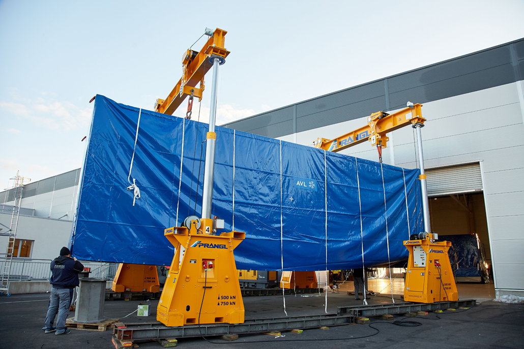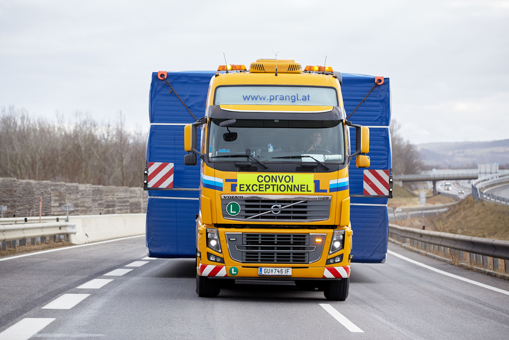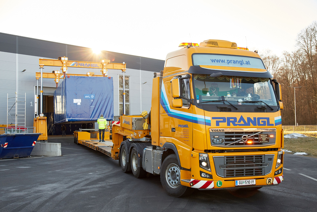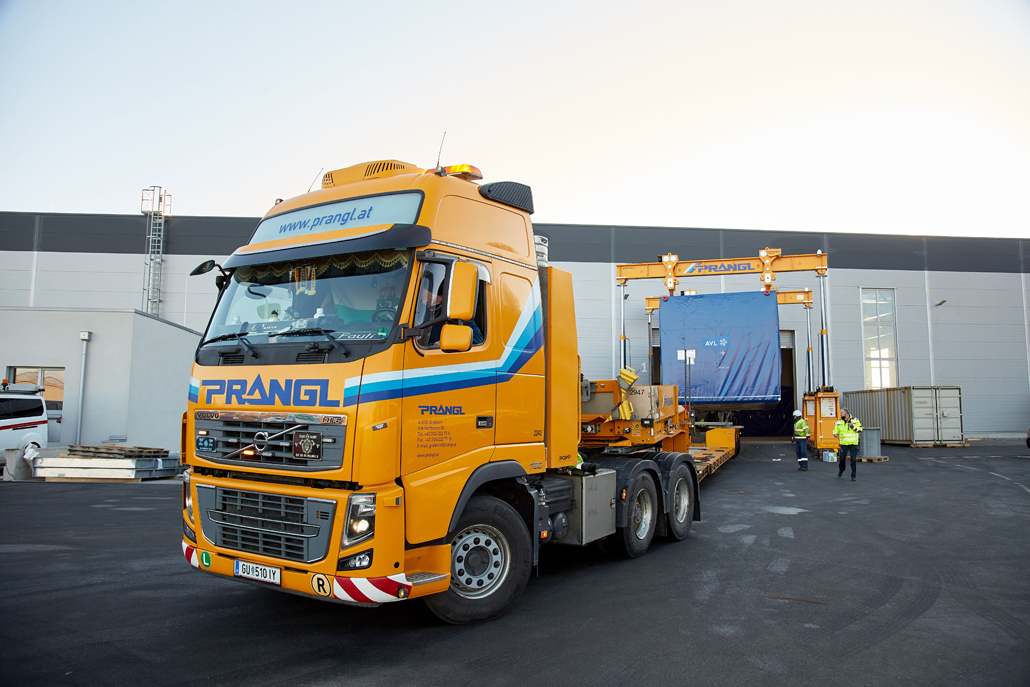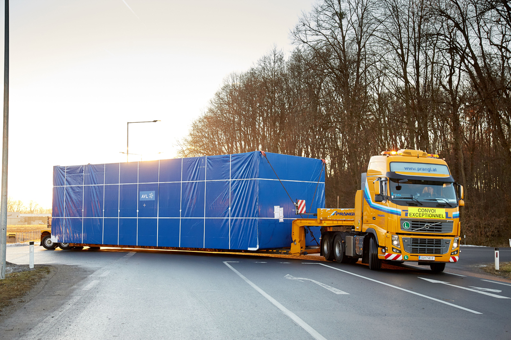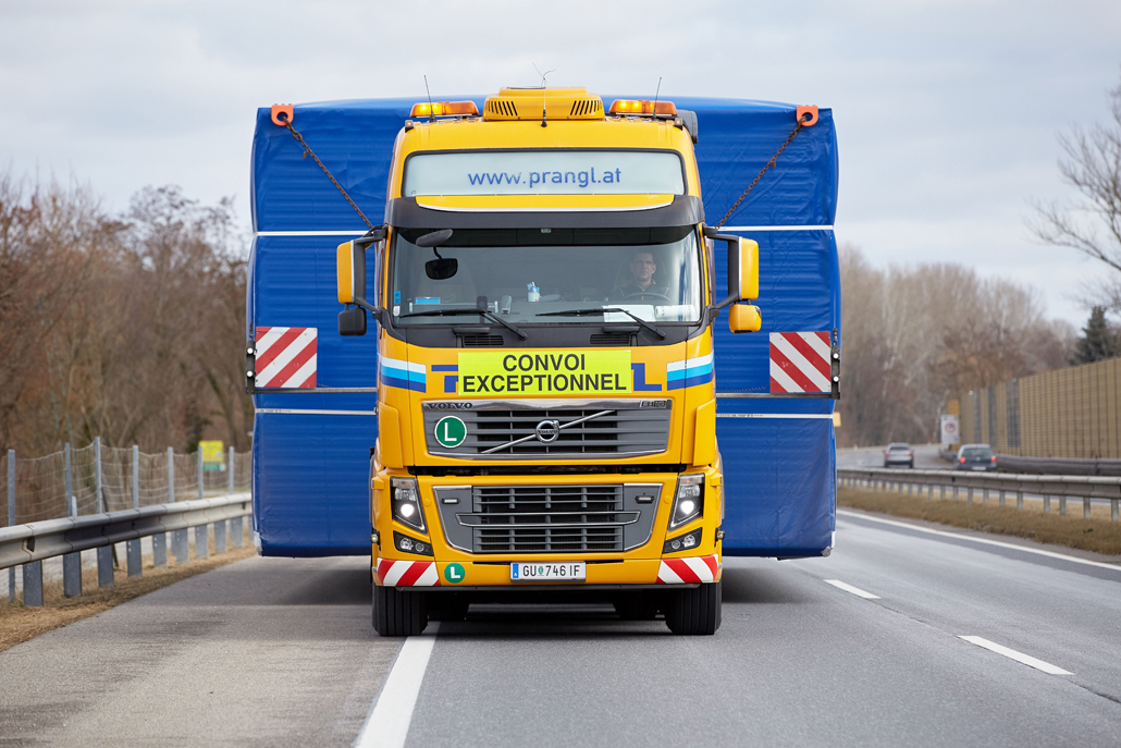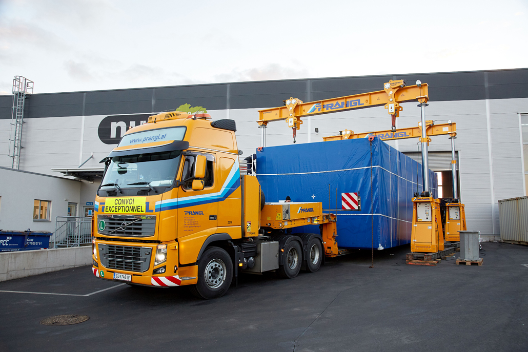 A 12 modult (egyenként 13,3 méter hosszú, 4,1-5,6 méter széles, 3,6-4,0 méter magas és 17-58 tonna súlyú) nagy teherbírású görgők és emelőportálok segítségével hozták ki a raktárból, hogy aztán a Prangl speciális szállítójárműire rakodják. A 3 és 4 tengelyes vontatók és a különböző pótkocsik (2 tengelyes, 3 tengelyes, 2+4 tengelyes alacsonypadlós félpótkocsi, 3+5 tengelyes tartályszállító, valamint 6 tengelyes mélybölcsős félpótkocsi) optimális kombinációit használták az előfuvarozáshoz, tekintettel az Ausztriában lehetséges maximális méretekre.