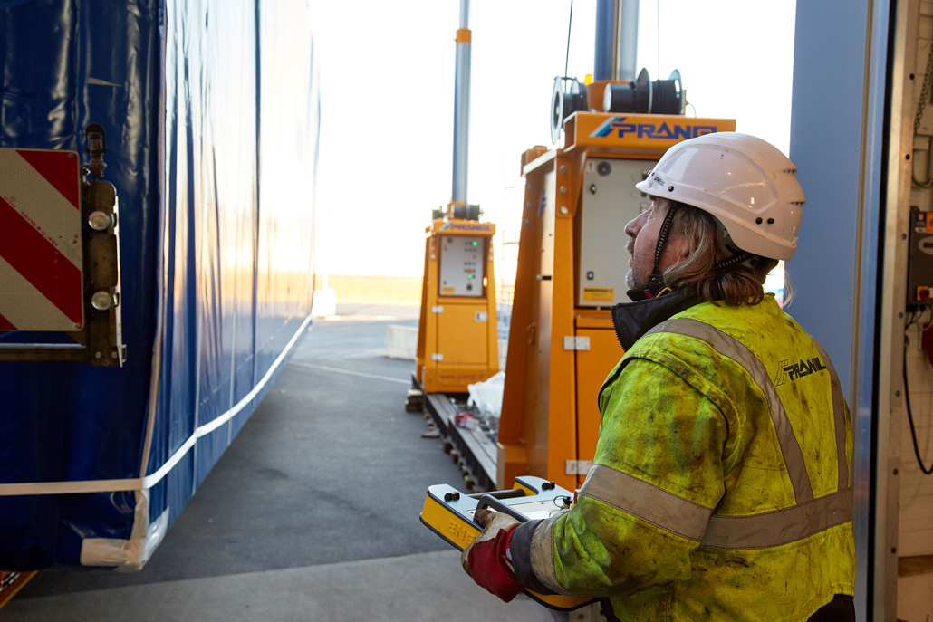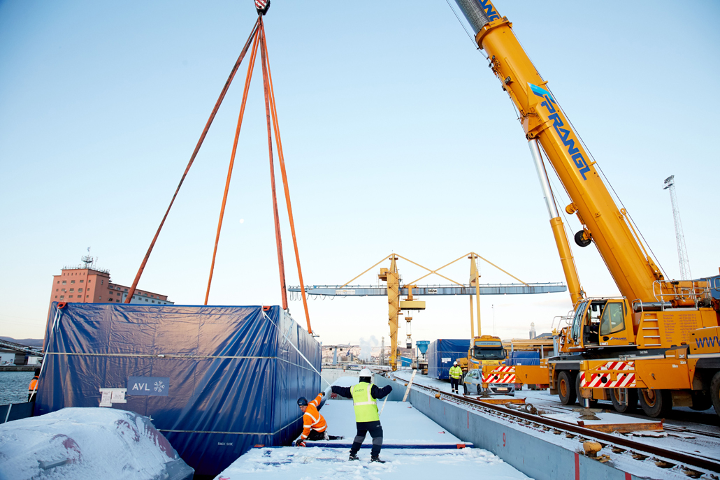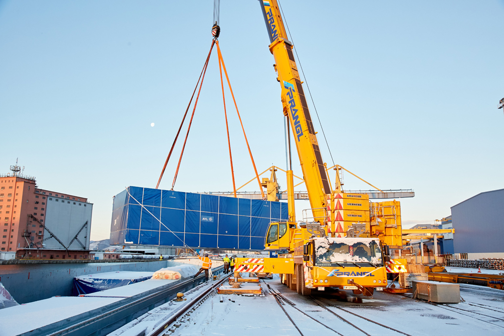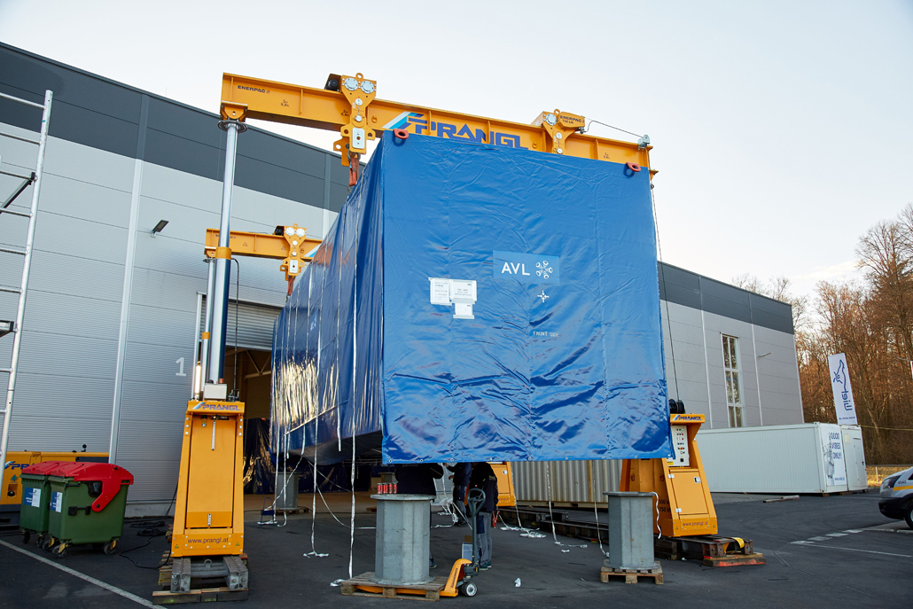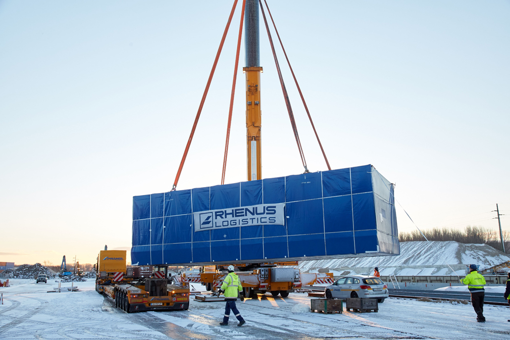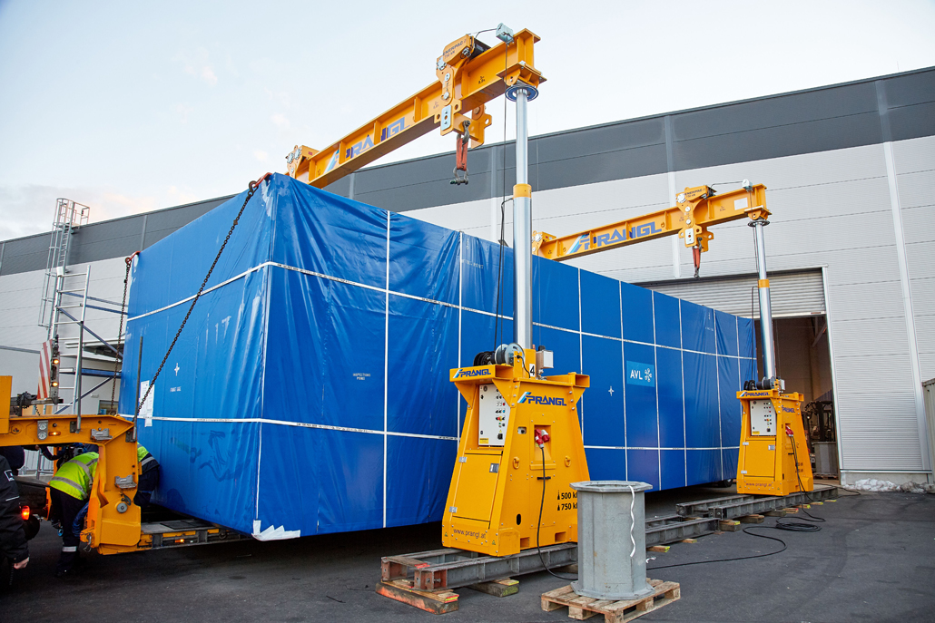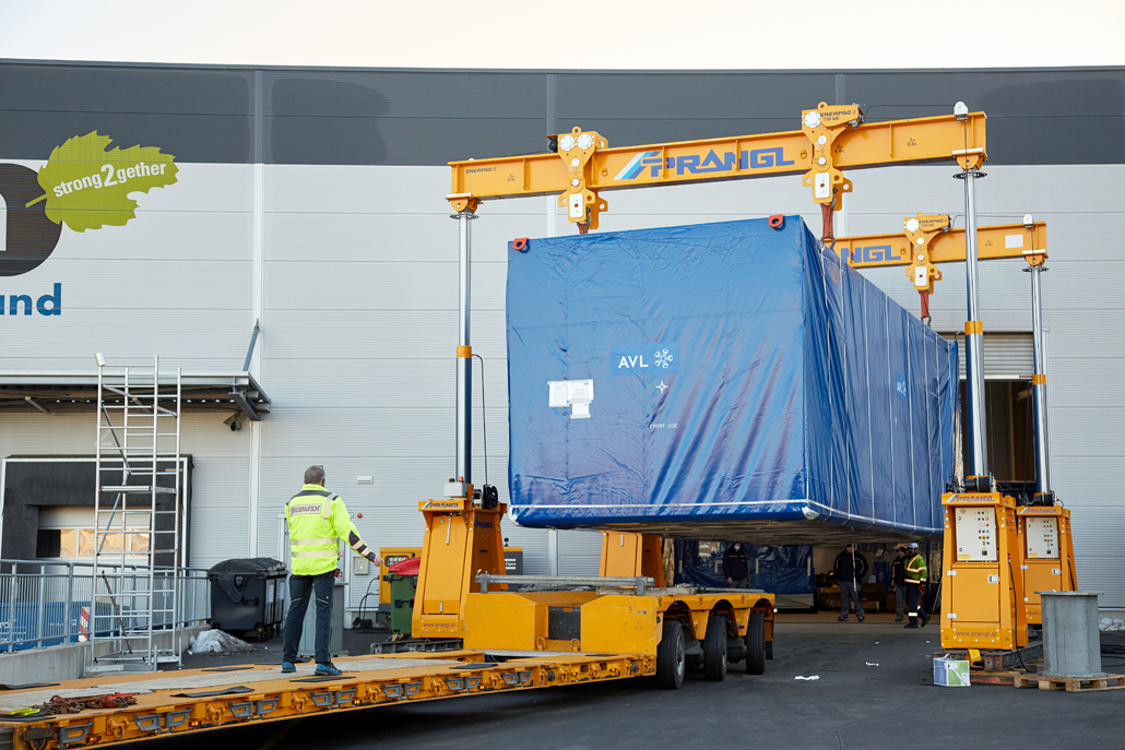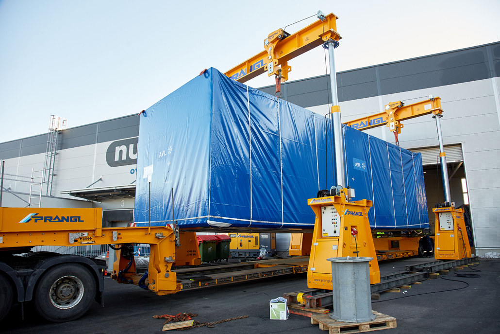 A 12 modult (egyenként 13,3 méter hosszú, 4,1-5,6 méter széles, 3,6-4,0 méter magas és 17-58 tonna súlyú) nagy teherbírású görgők és emelőportálok segítségével hozták ki a raktárból, hogy aztán a Prangl speciális szállítójárműire rakodják. A 3 és 4 tengelyes vontatók és a különböző pótkocsik (2 tengelyes, 3 tengelyes, 2+4 tengelyes alacsonypadlós félpótkocsi, 3+5 tengelyes tartályszállító, valamint 6 tengelyes mélybölcsős félpótkocsi) optimális kombinációit használták az előfuvarozáshoz, tekintettel az Ausztriában lehetséges maximális méretekre.