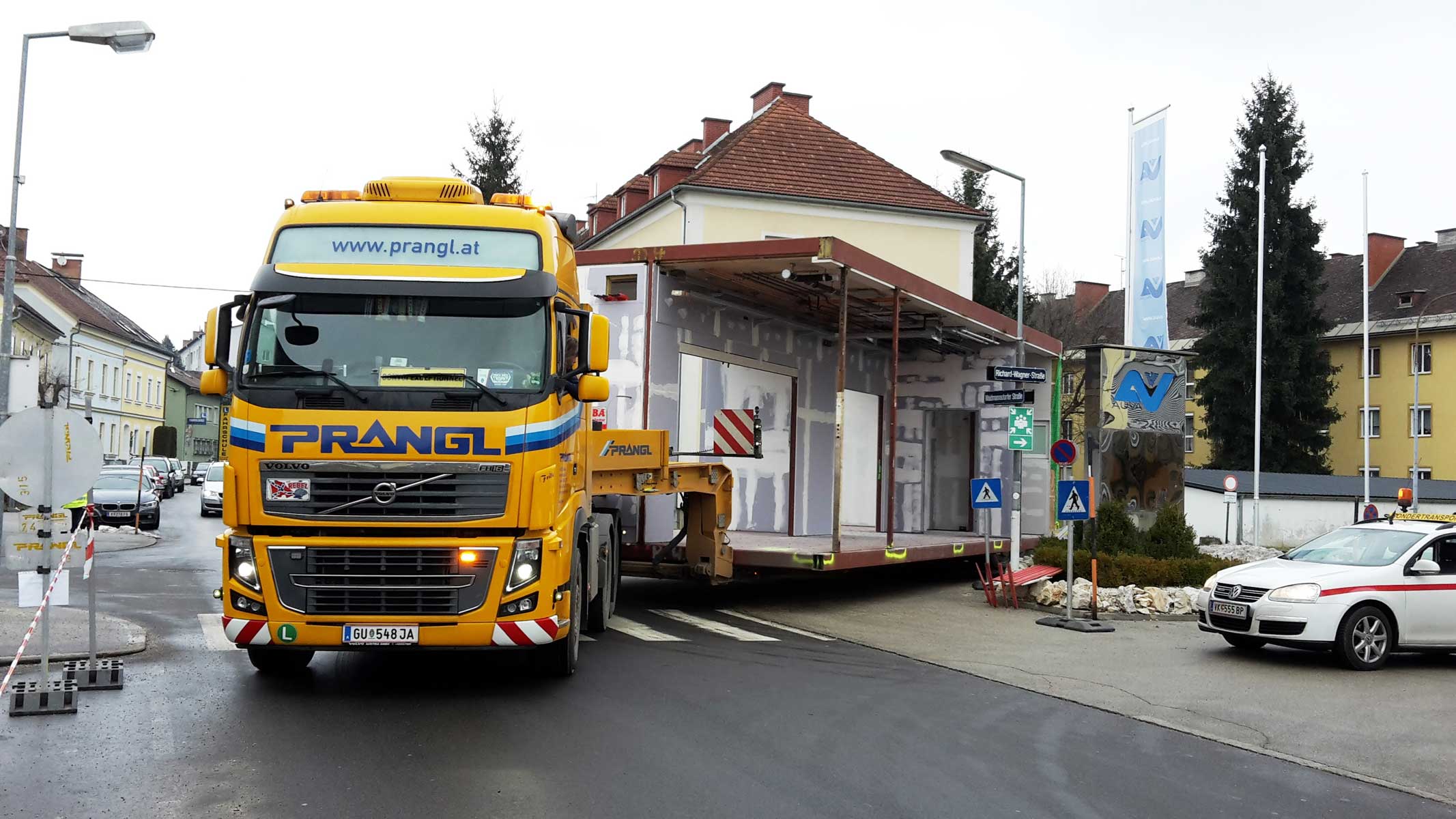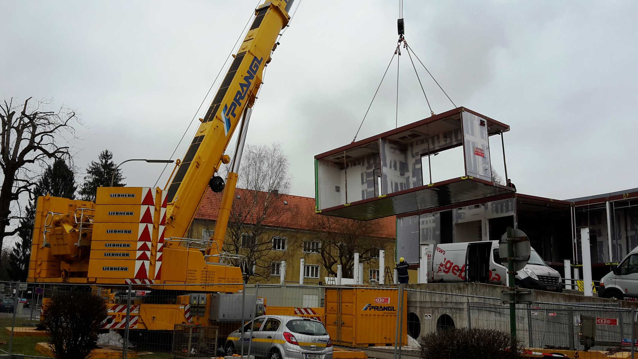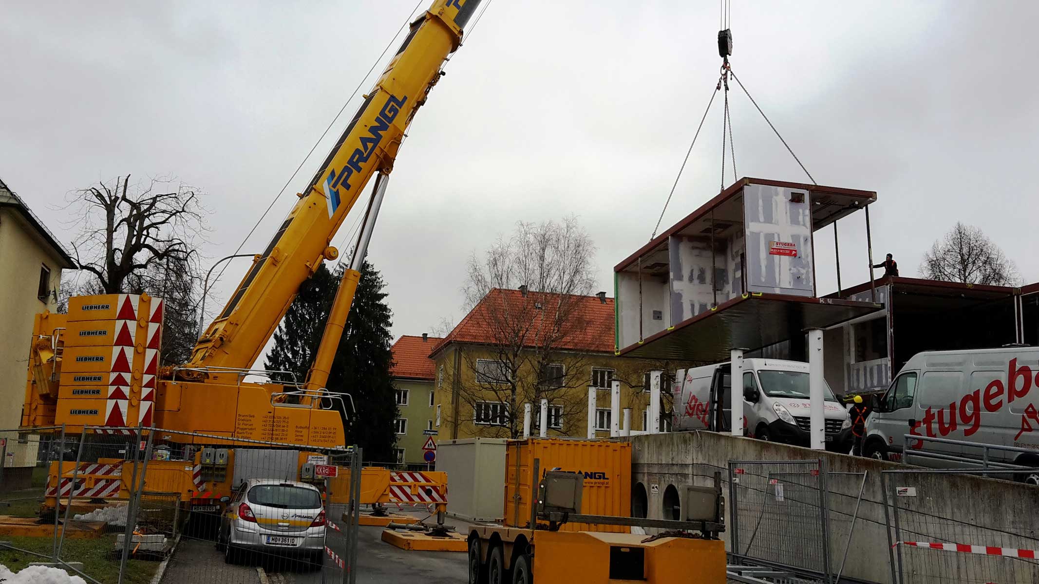 A modulok beemelése egy 350 tonnás teleszkópos daruval szintén kihívás elé állította a Prangl csapatát. A kórház mélygarázsa miatt a mobildaru felállítása csak nagyon korlátozott módon volt lehetséges. Még egy fát is ki kellett vágni ahhoz, hogy az emelési munkát egyáltalán végre lehessen hajtani. Csak így lehetett elegendő helyet nyerni a daru felállításához és kitámasztásához. A közelben található helikopter leszállóhely szintén nehezítő körülmény volt. Biztonsági intézkedésként a 46 méteres maximálisan megengedett gémmagasságot a bevetés minden percében be kellett tartani.