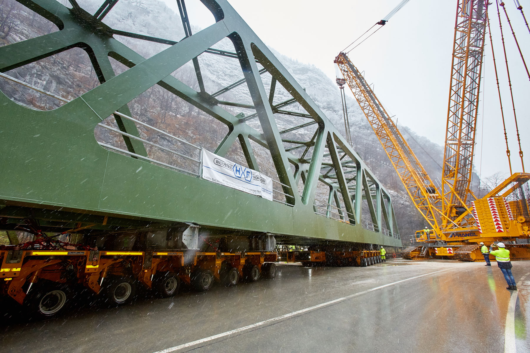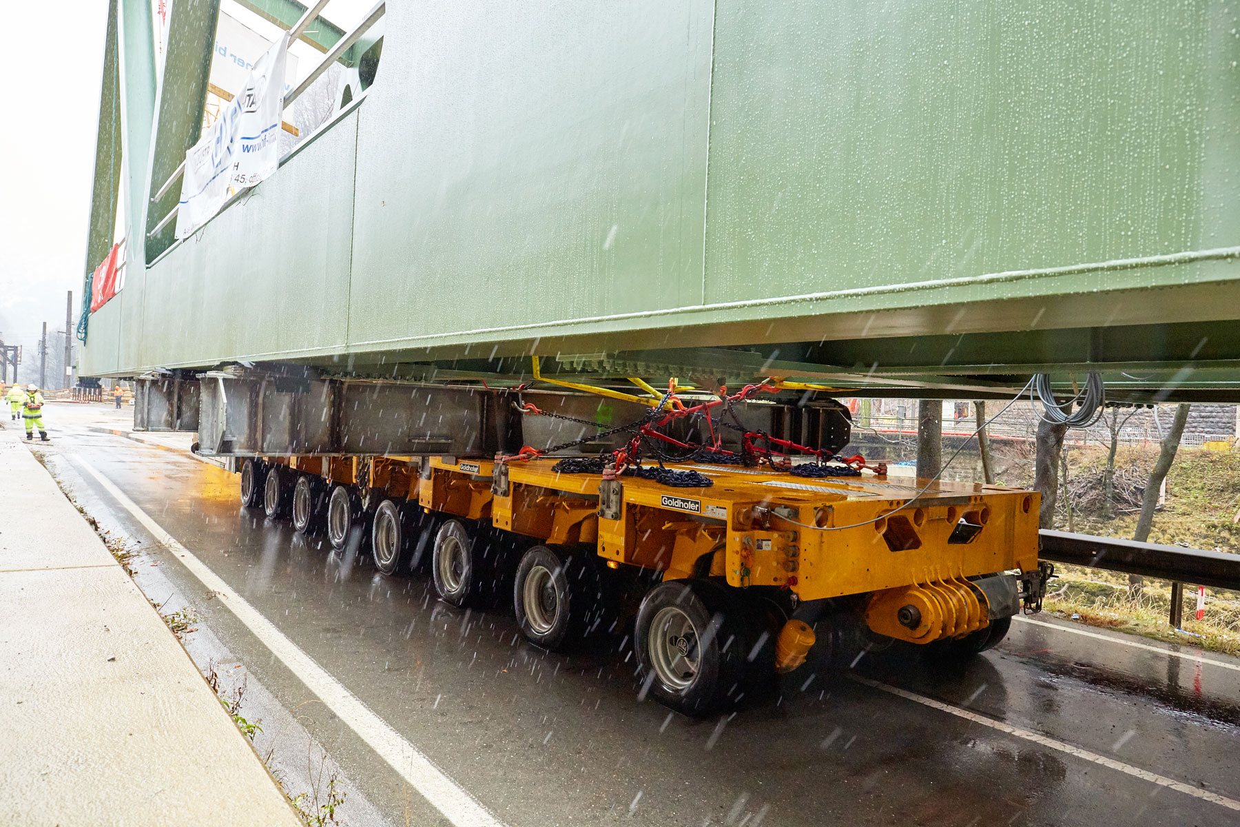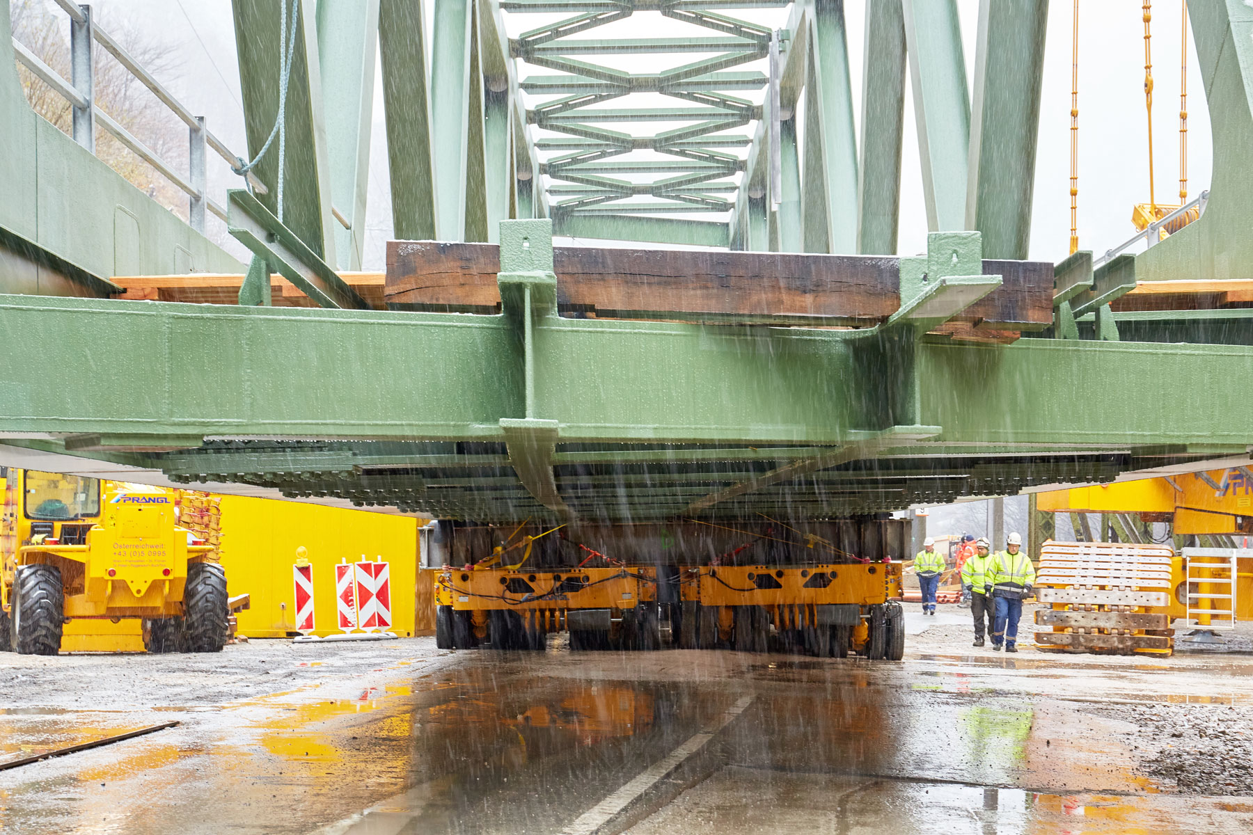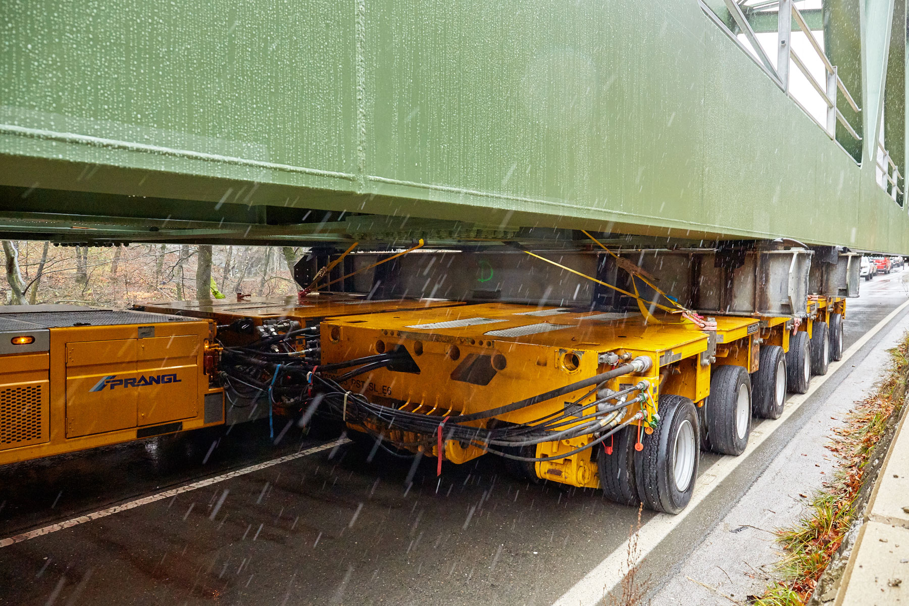 A Prangl csapatának első feladata az volt, hogy az összesen 380 tonna tömegű régi hídszerkezetet kiemelje, három, egymással szinkronba hozott nehézteher-szállító járműre rakja, és távirányítással a közbenső tárolóhelyre fuvarozza. Az új hidat annak szállítása előtt kb. 300 méterre kellett ugyanígy ellenkező irányba az emelés helyéig vinni. Erre szintén az önjáró nagy teherbírású egységekkel került sor. A szűk hely és a 70 méteres hossz már az első fázisban a legnagyobb koncentrációt követelte meg az összes résztvevőtől.