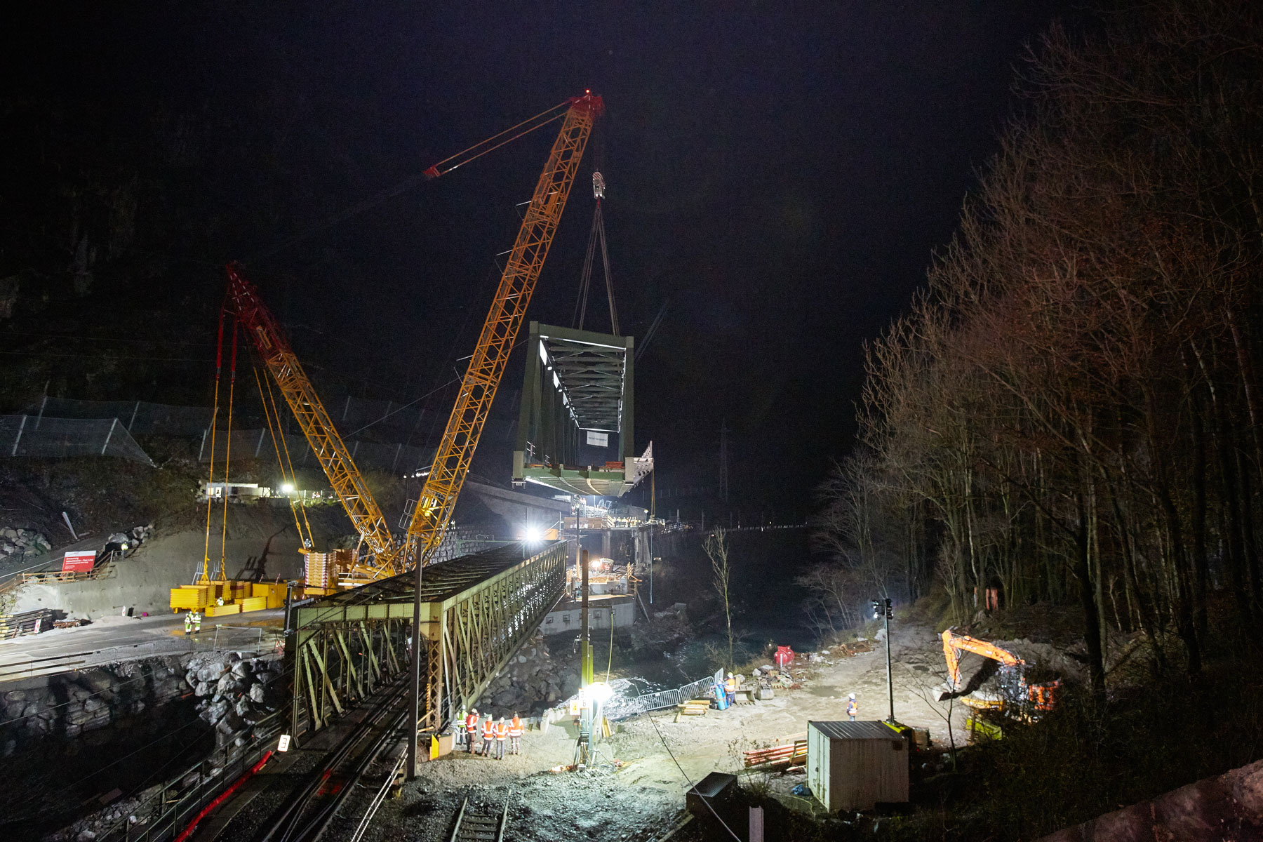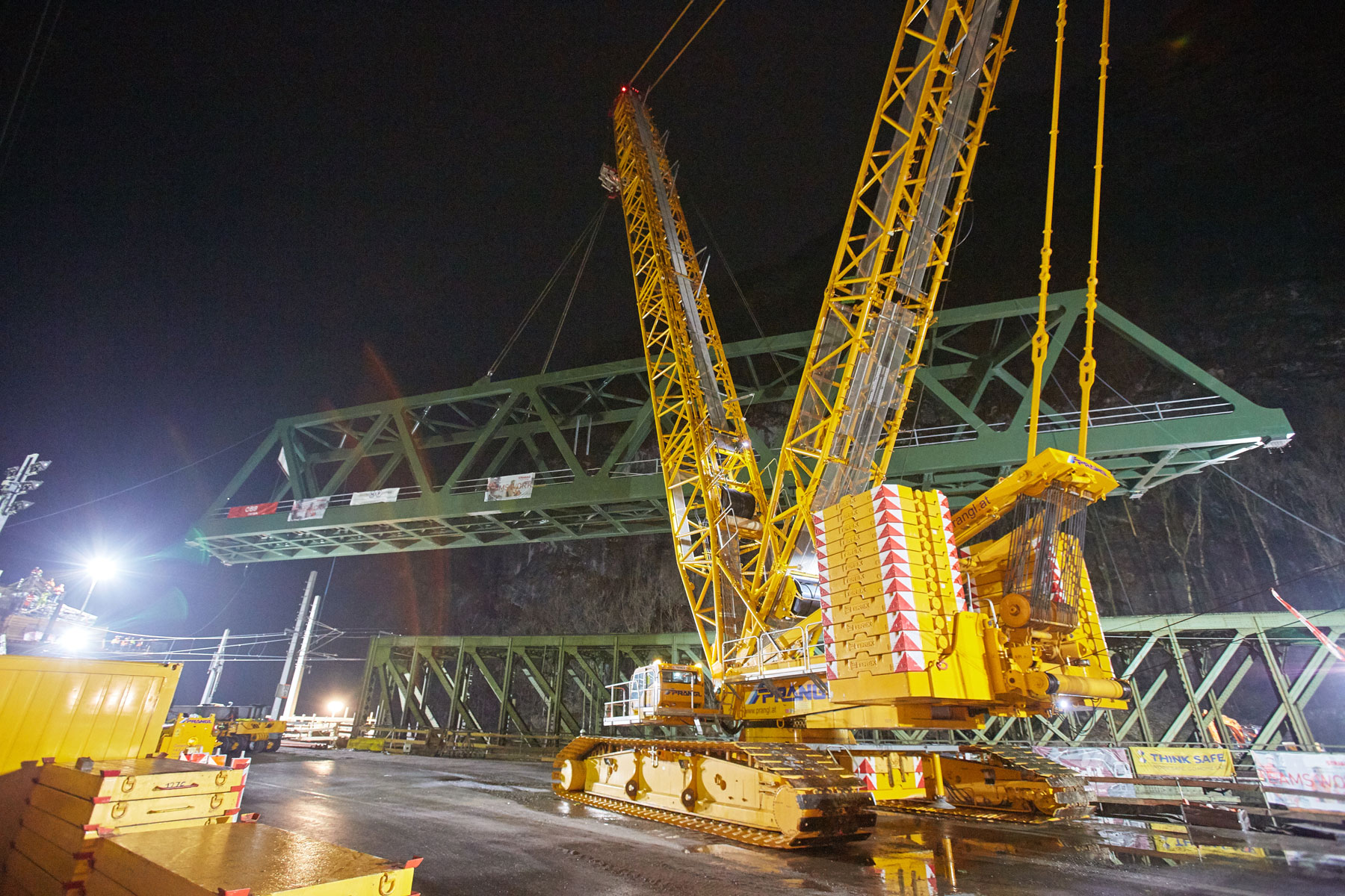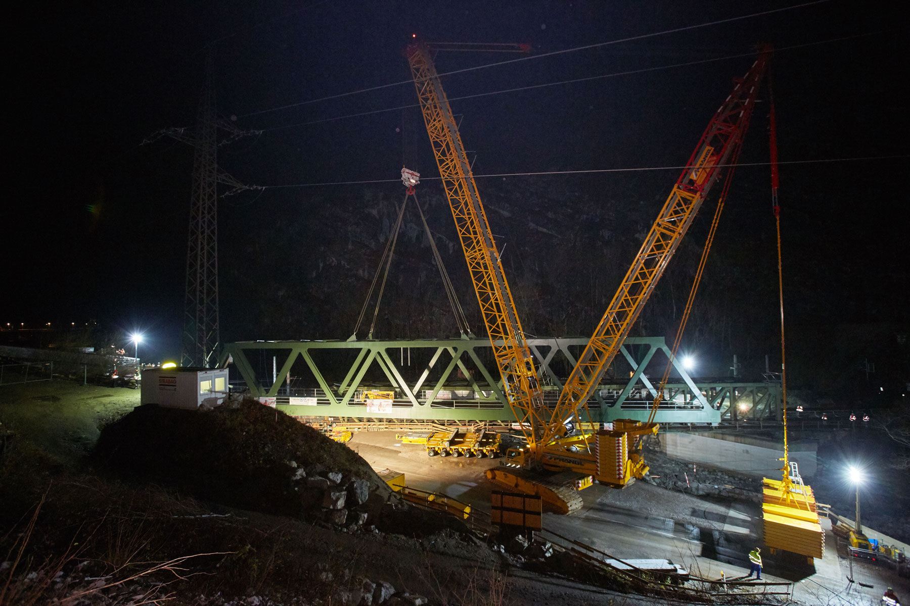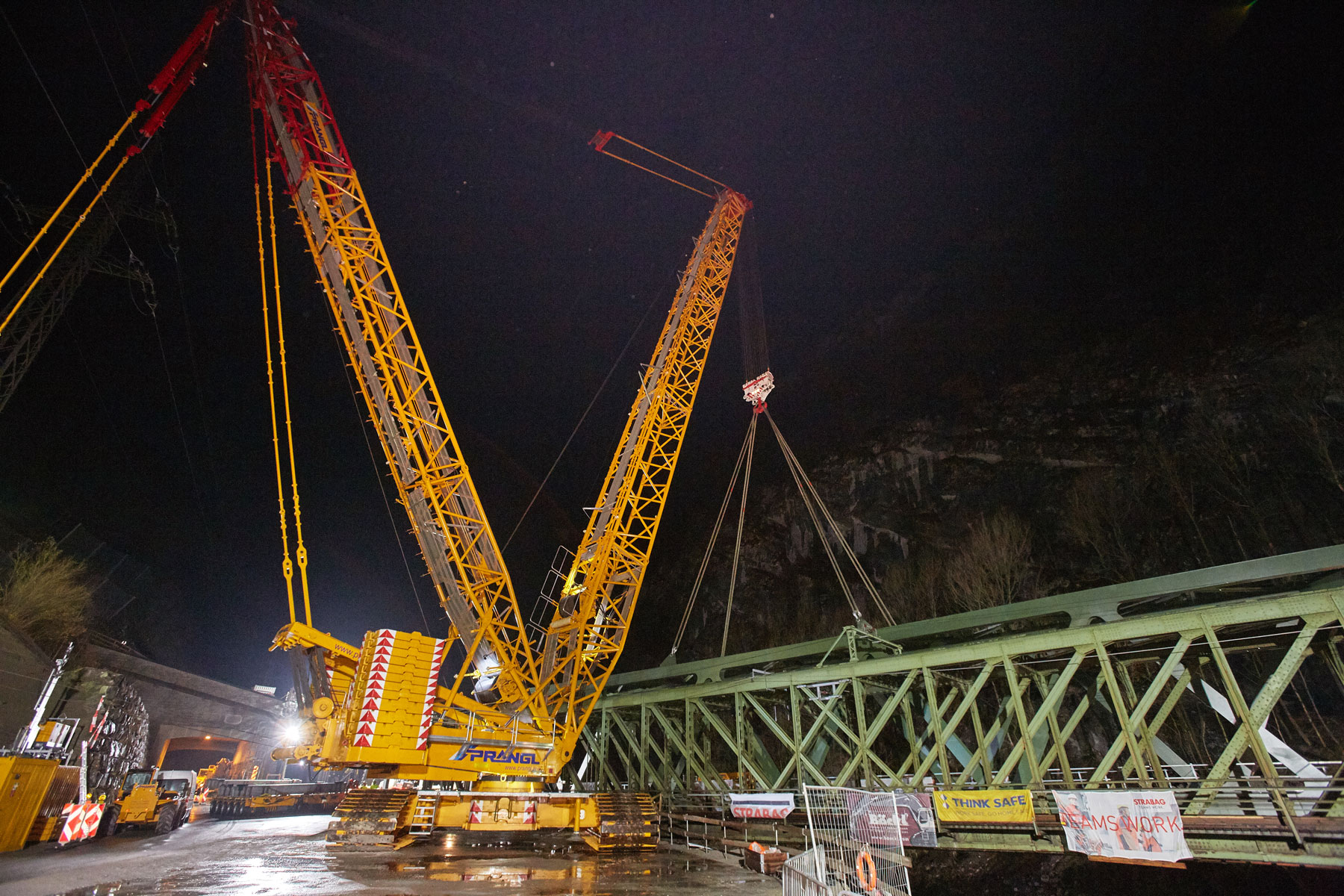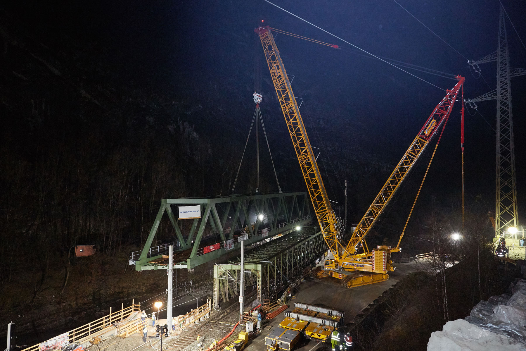 Végül elérkezett az idő: Röviddel azután, hogy az utolsó vonat 02:00 órakor átment az érintett szakaszon, el lehetett kezdeni a tulajdonképpeni emelési munkákat. Ahhoz, hogy az első menetrend szerinti vonat reggel újra közlekedhessen, szűk két óra állt rendelkezésre. Ez minden résztvevő számára nagy nyomást jelentett! A daru közvetlenül a nagy teherbírású önjáró utánfutókról vette le a szerkezetet. A lánctalpas daru a távolság miatt kénytelen volt egyszer megváltoztatni a helyzetét, és kb. 20 métert megtenni a teherrel együtt.