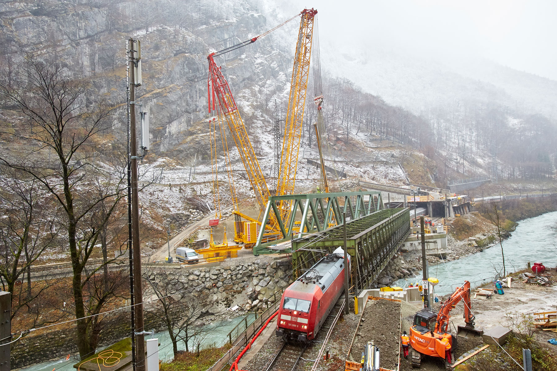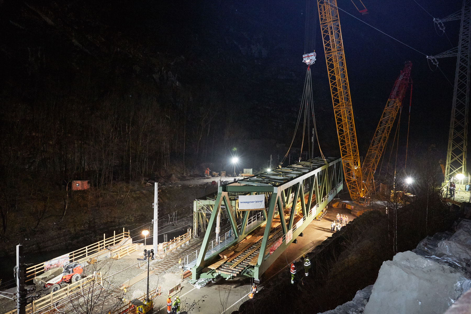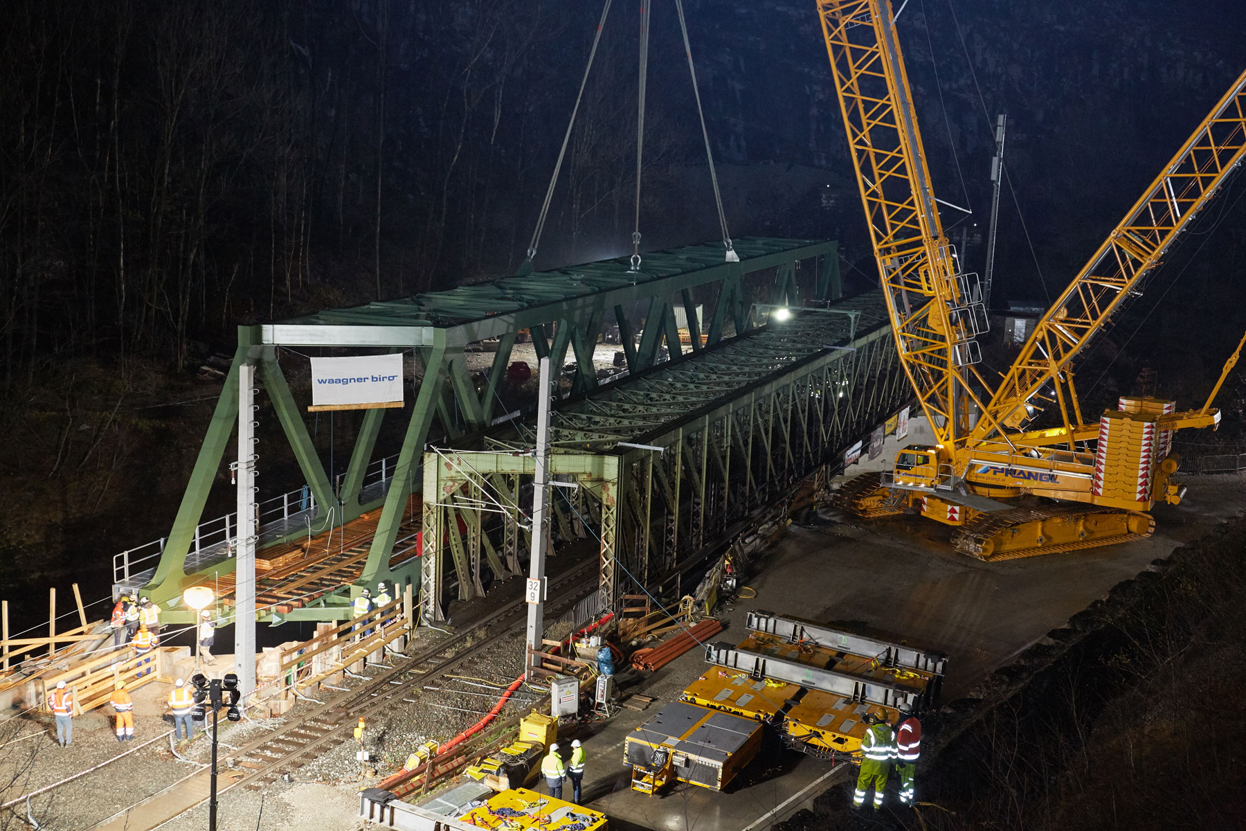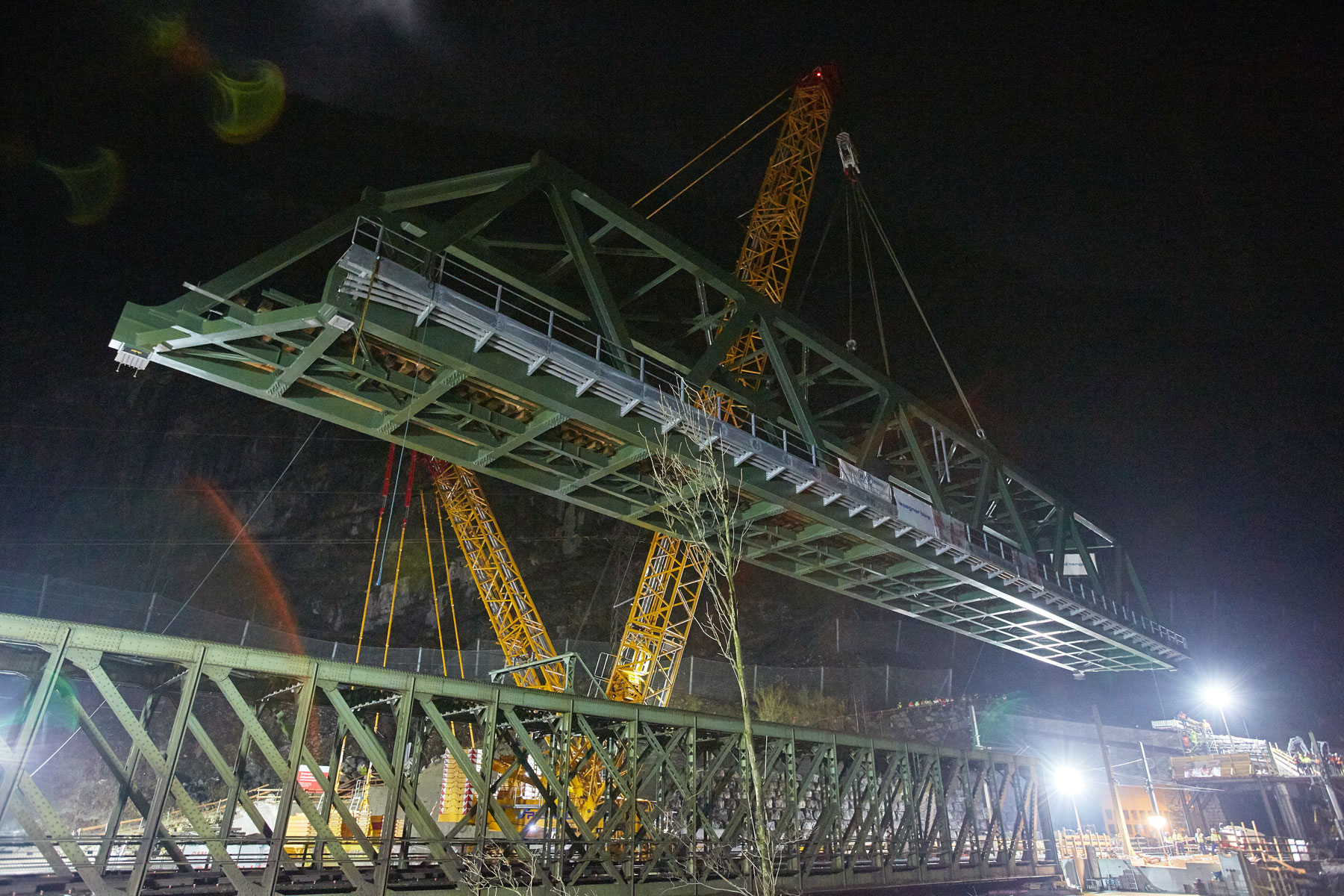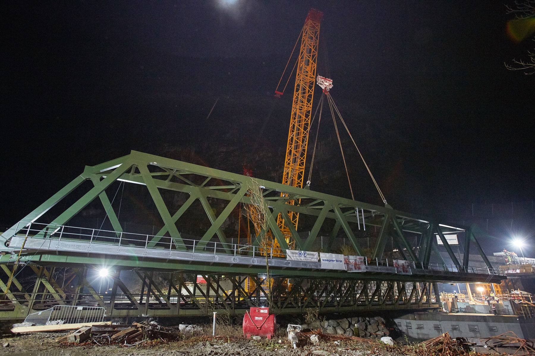 Végül elérkezett az idő: Röviddel azután, hogy az utolsó vonat 02:00 órakor átment az érintett szakaszon, el lehetett kezdeni a tulajdonképpeni emelési munkákat. Ahhoz, hogy az első menetrend szerinti vonat reggel újra közlekedhessen, szűk két óra állt rendelkezésre. Ez minden résztvevő számára nagy nyomást jelentett! A daru közvetlenül a nagy teherbírású önjáró utánfutókról vette le a szerkezetet. A lánctalpas daru a távolság miatt kénytelen volt egyszer megváltoztatni a helyzetét, és kb. 20 métert megtenni a teherrel együtt.