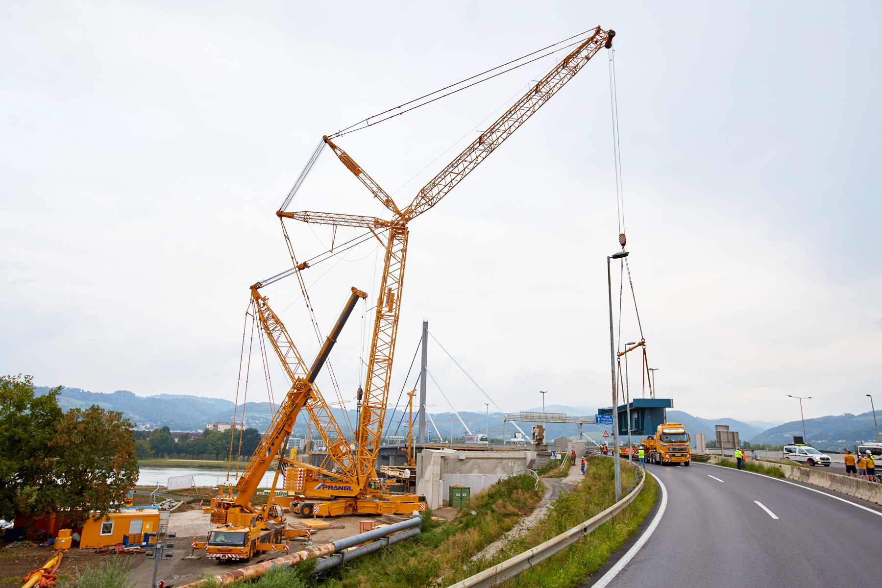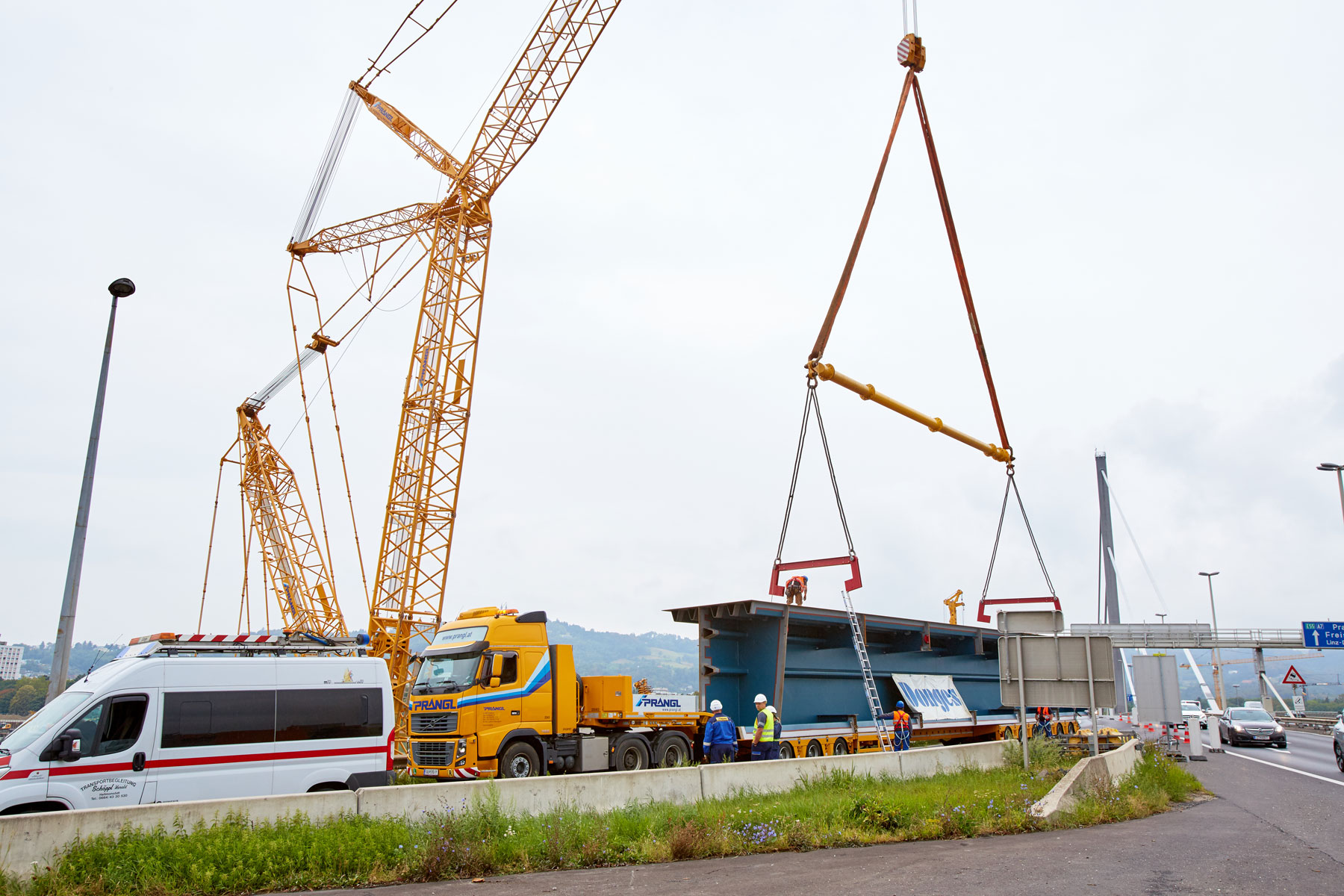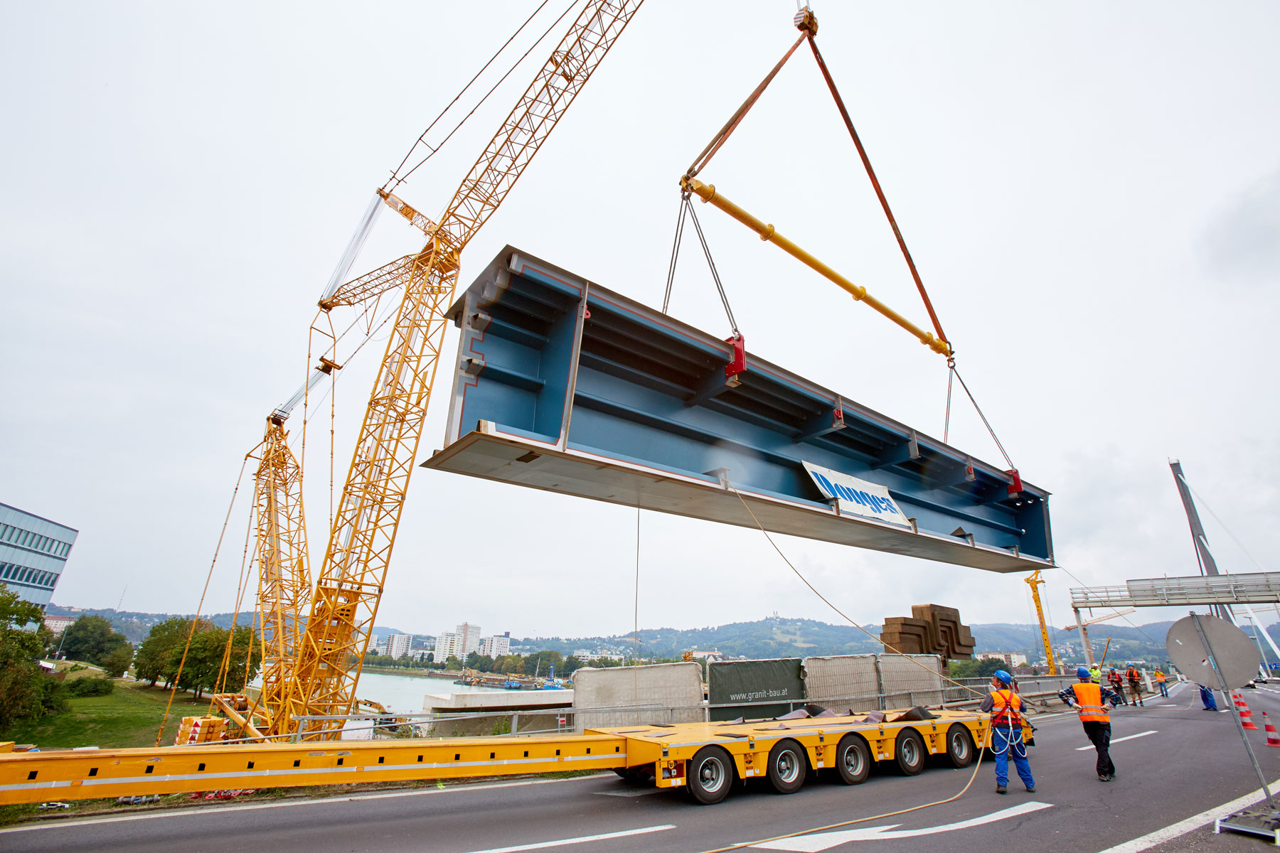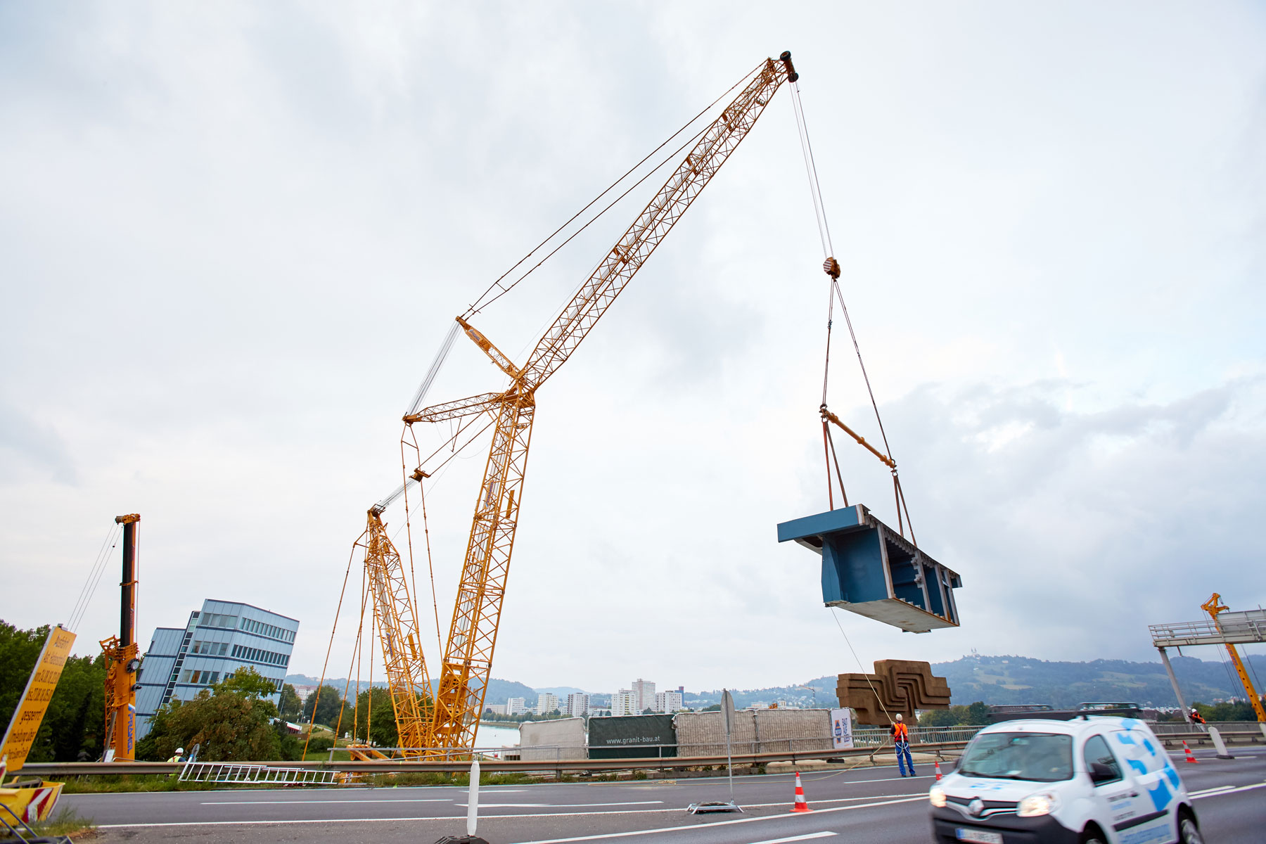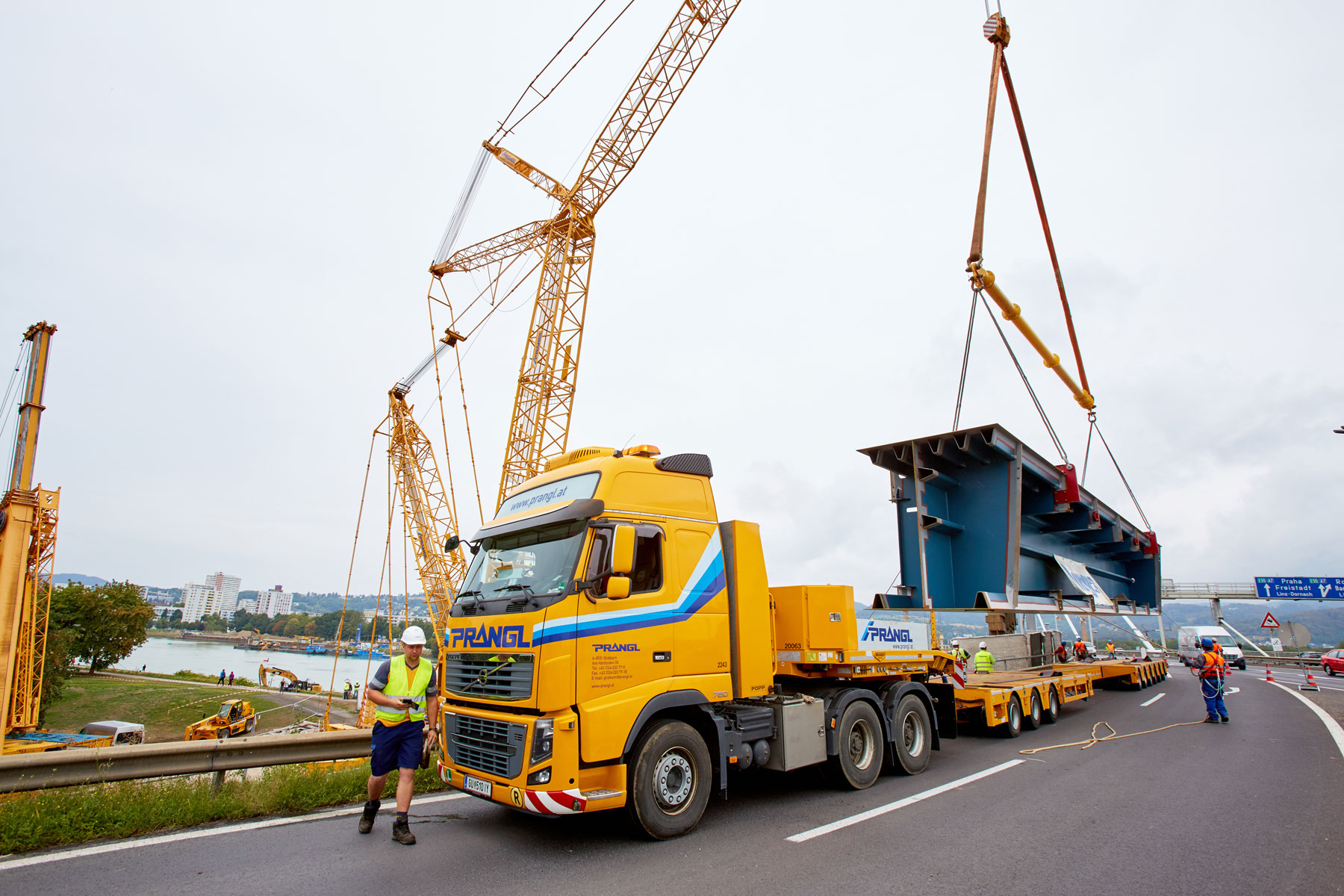 A zökkenőmentes lebonyolításhoz fontos a súrlódások minimalizálása. Mivel a Prangl kizárólagos megbízást kapott, a szállítás és a daruzás feladata egy kézben van. A legnehezebb építési elemeket egy 600 tonnás árbócos kialakítású, rácsos gémszerkezetű daru segítségével közvetlenül a tehergépkocsiról emelik be. Az erős teherbírásnak és a kiválasztott konfigurációnak köszönhetően a 600 tonnás géppel sok időt lehet megspórolni – olyan időt, amely a szükséges autópálya-lezárások miatt rendkívül költséges. A magasan képzett gépjárművezetők a 350 tonnás monstrumot a legnagyobb pontossággal mozgatják. Mégiscsak egy 40 méteres gémkinyúlást kell kezelni.