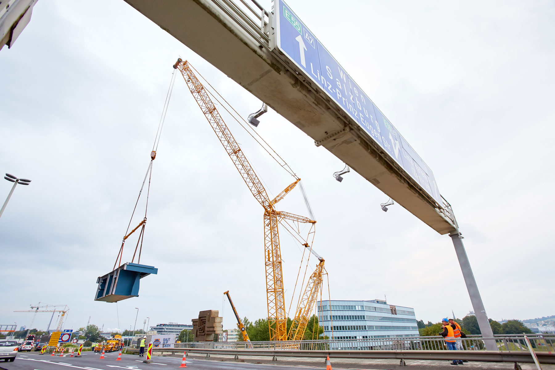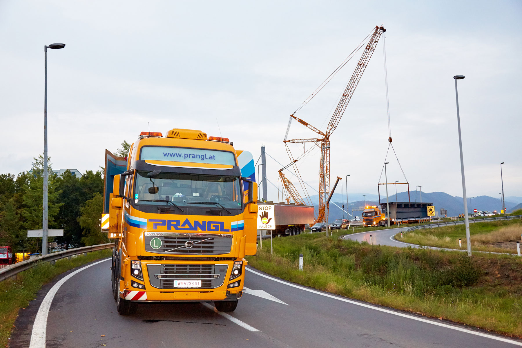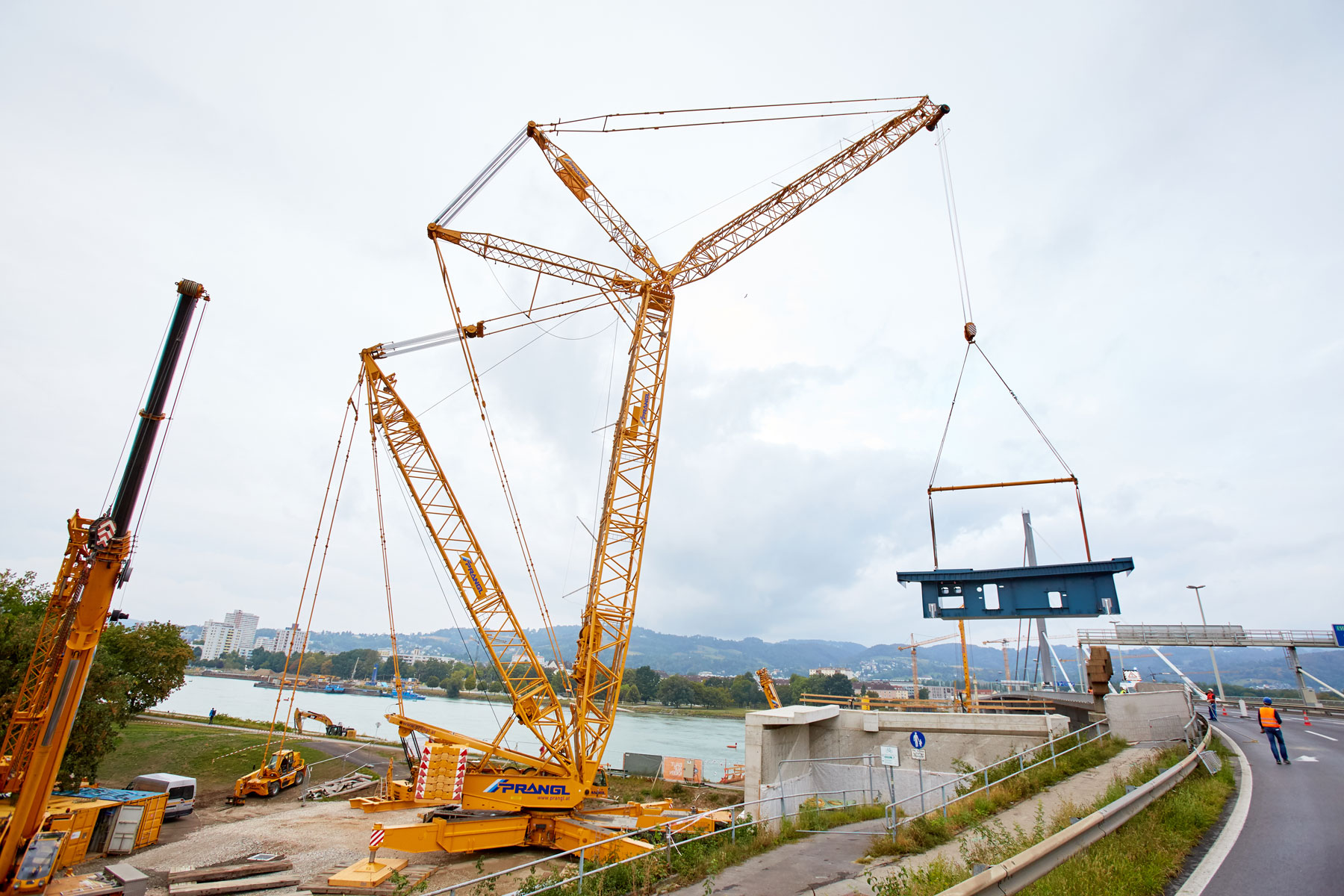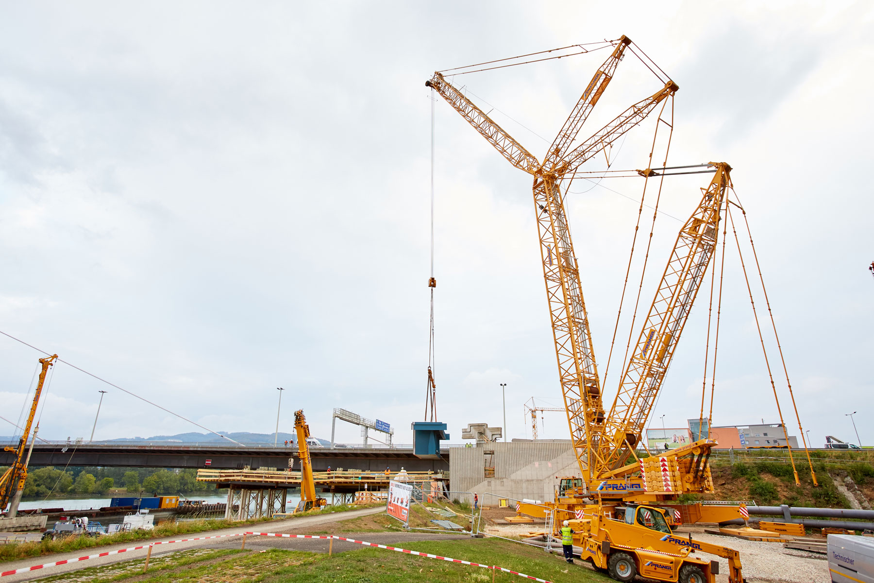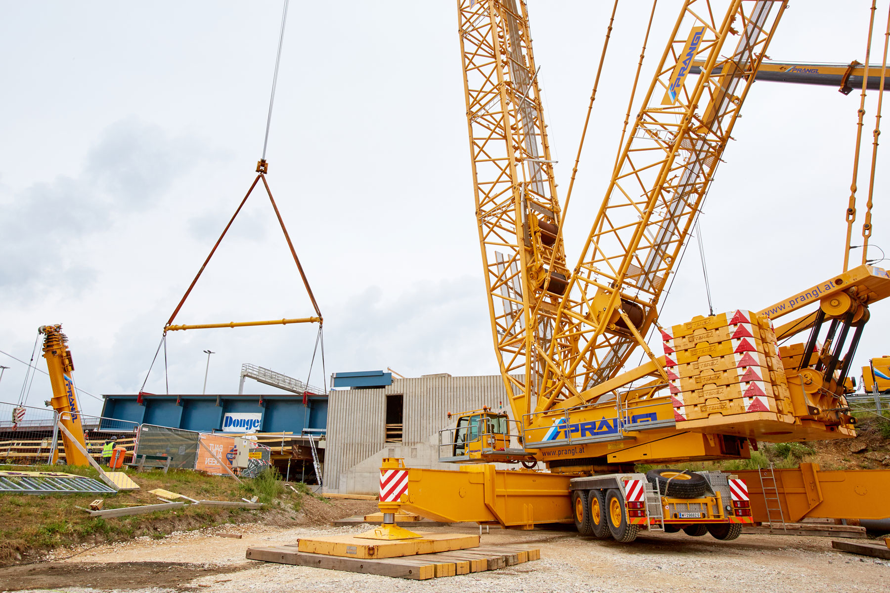 A zökkenőmentes lebonyolításhoz fontos a súrlódások minimalizálása. Mivel a Prangl kizárólagos megbízást kapott, a szállítás és a daruzás feladata egy kézben van. A legnehezebb építési elemeket egy 600 tonnás árbócos kialakítású, rácsos gémszerkezetű daru segítségével közvetlenül a tehergépkocsiról emelik be. Az erős teherbírásnak és a kiválasztott konfigurációnak köszönhetően a 600 tonnás géppel sok időt lehet megspórolni – olyan időt, amely a szükséges autópálya-lezárások miatt rendkívül költséges. A magasan képzett gépjárművezetők a 350 tonnás monstrumot a legnagyobb pontossággal mozgatják. Mégiscsak egy 40 méteres gémkinyúlást kell kezelni.