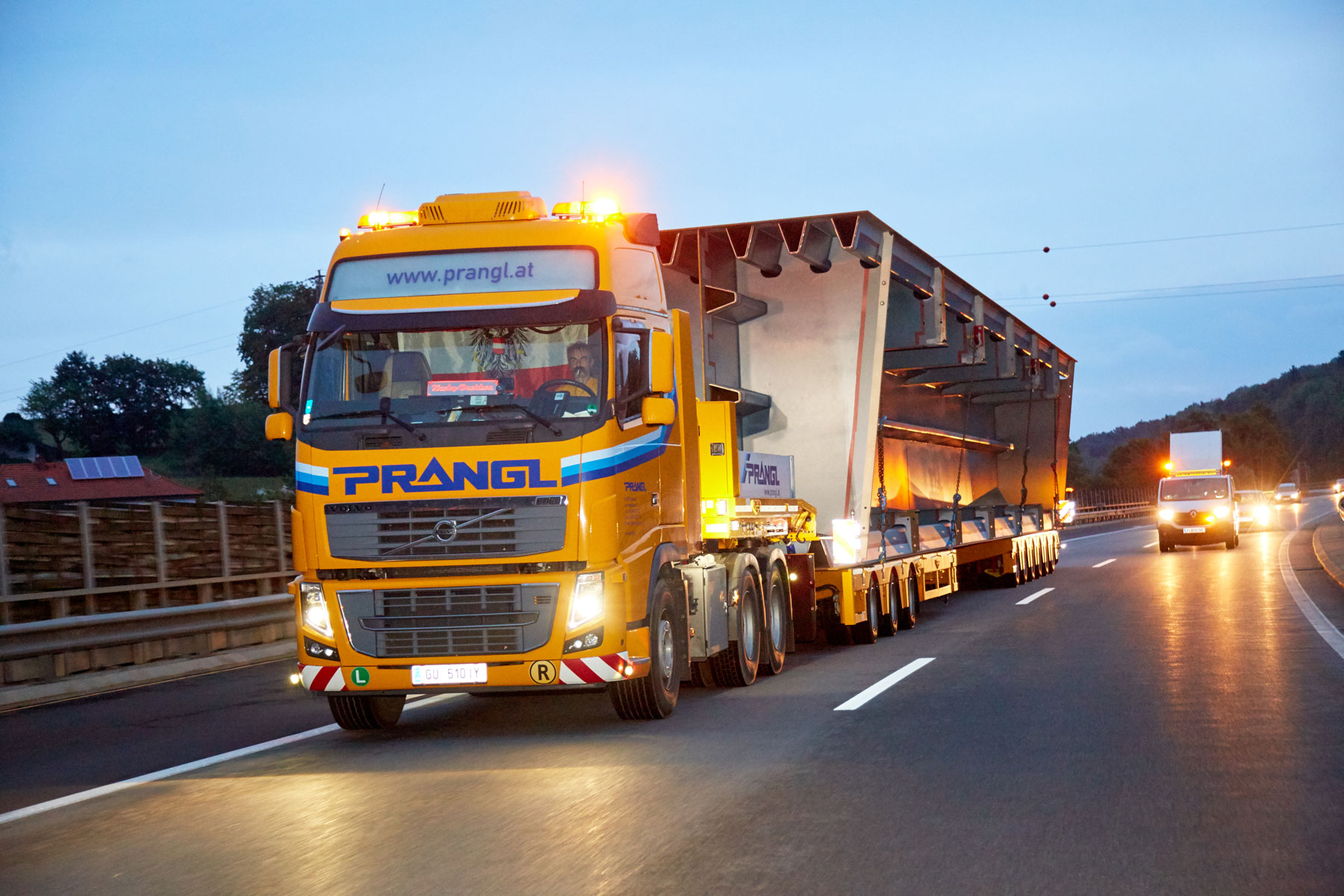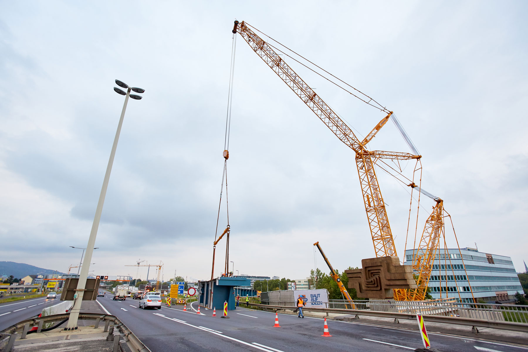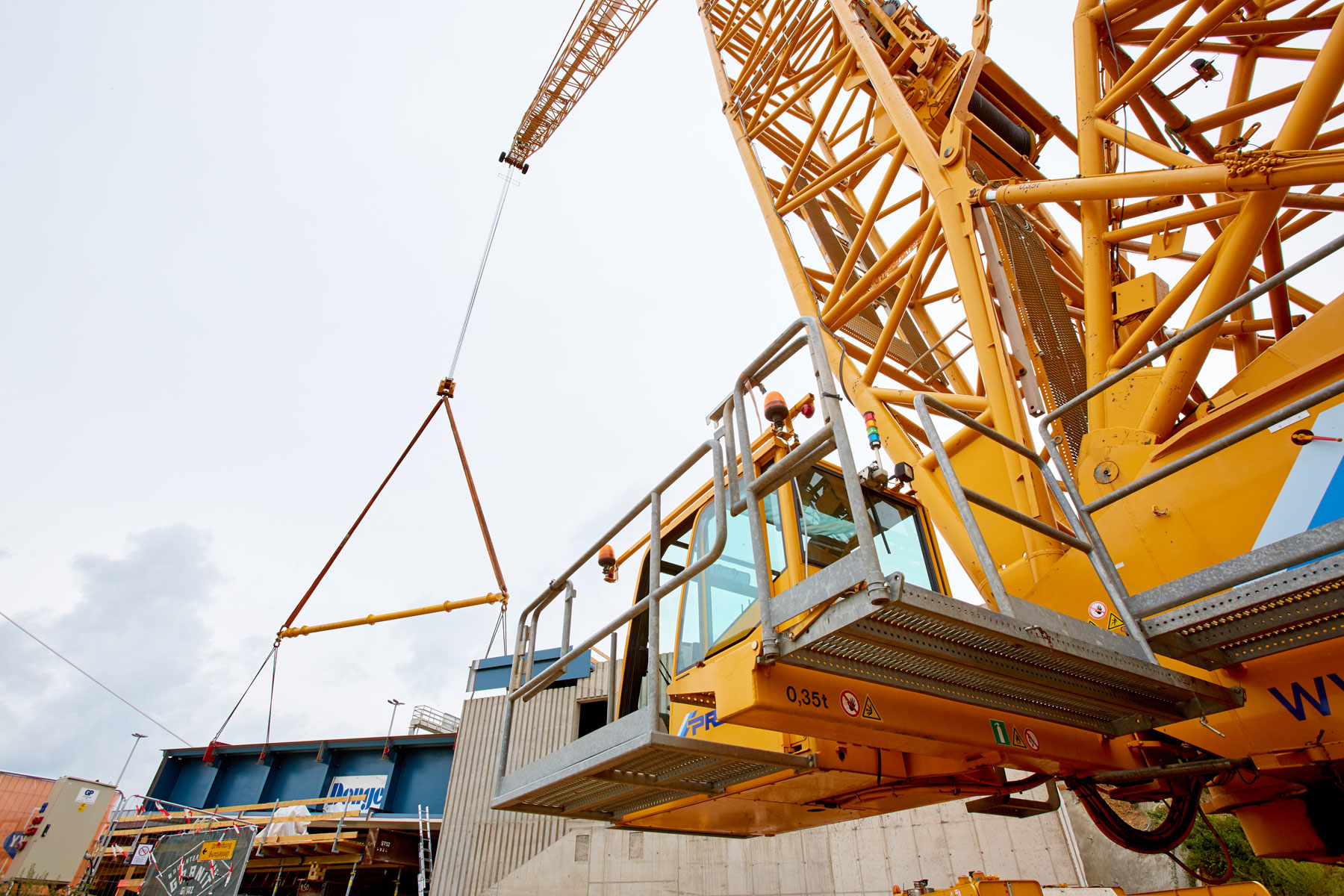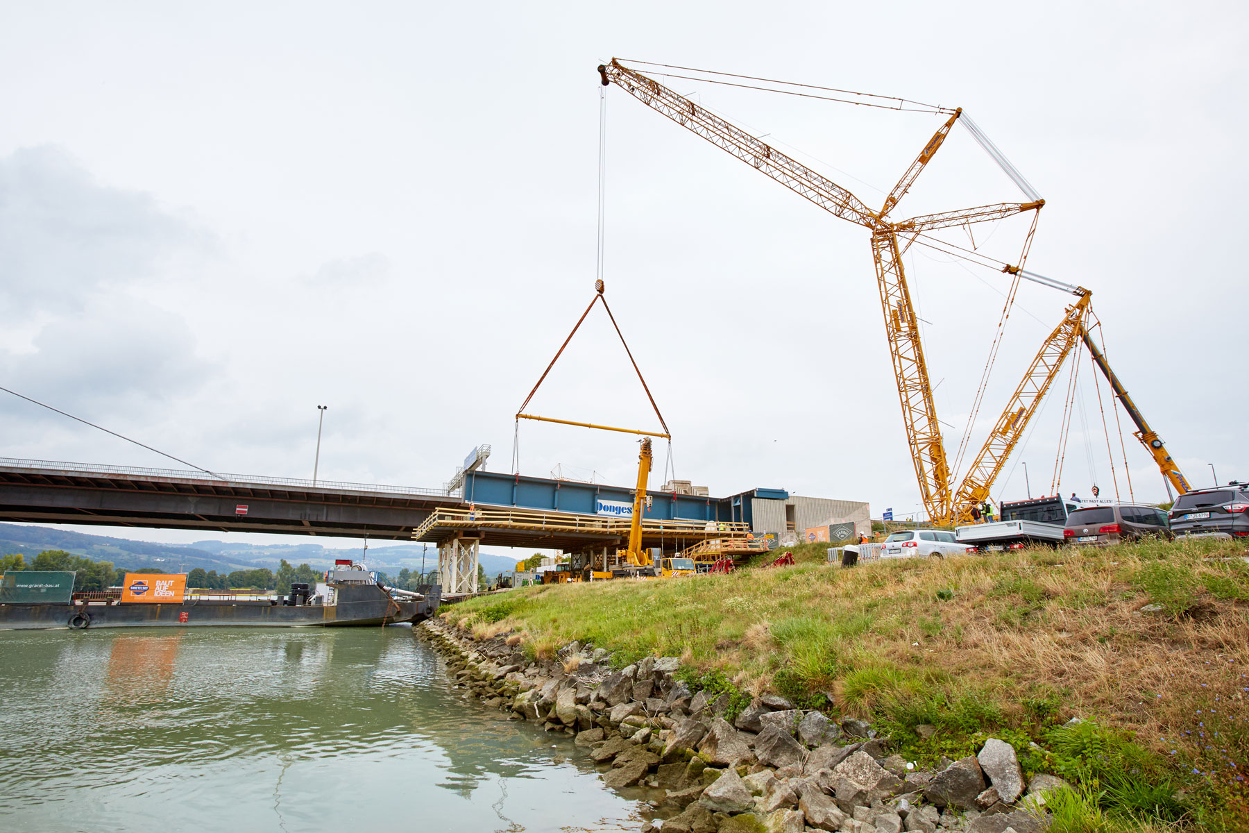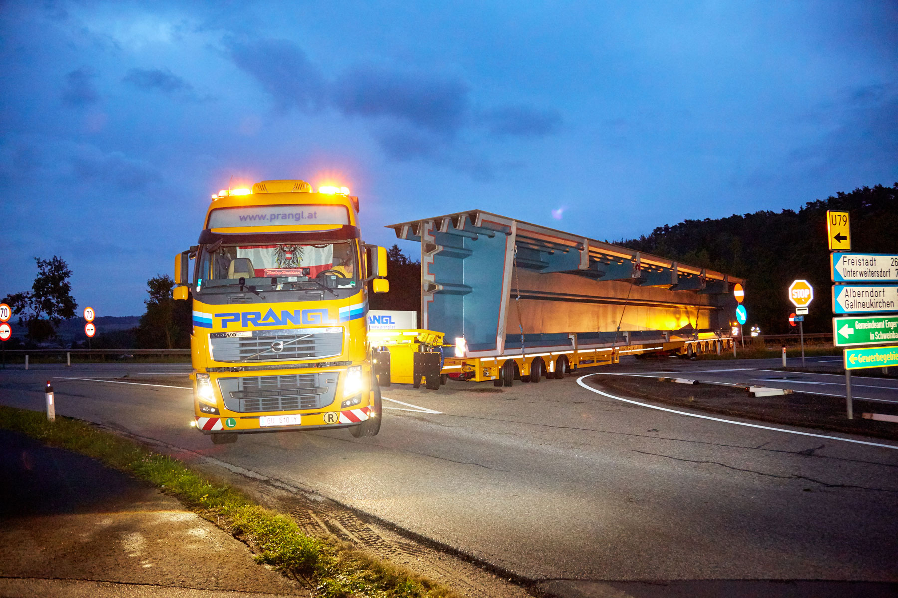 A zökkenőmentes lebonyolításhoz fontos a súrlódások minimalizálása. Mivel a Prangl kizárólagos megbízást kapott, a szállítás és a daruzás feladata egy kézben van. A legnehezebb építési elemeket egy 600 tonnás árbócos kialakítású, rácsos gémszerkezetű daru segítségével közvetlenül a tehergépkocsiról emelik be. Az erős teherbírásnak és a kiválasztott konfigurációnak köszönhetően a 600 tonnás géppel sok időt lehet megspórolni – olyan időt, amely a szükséges autópálya-lezárások miatt rendkívül költséges. A magasan képzett gépjárművezetők a 350 tonnás monstrumot a legnagyobb pontossággal mozgatják. Mégiscsak egy 40 méteres gémkinyúlást kell kezelni.