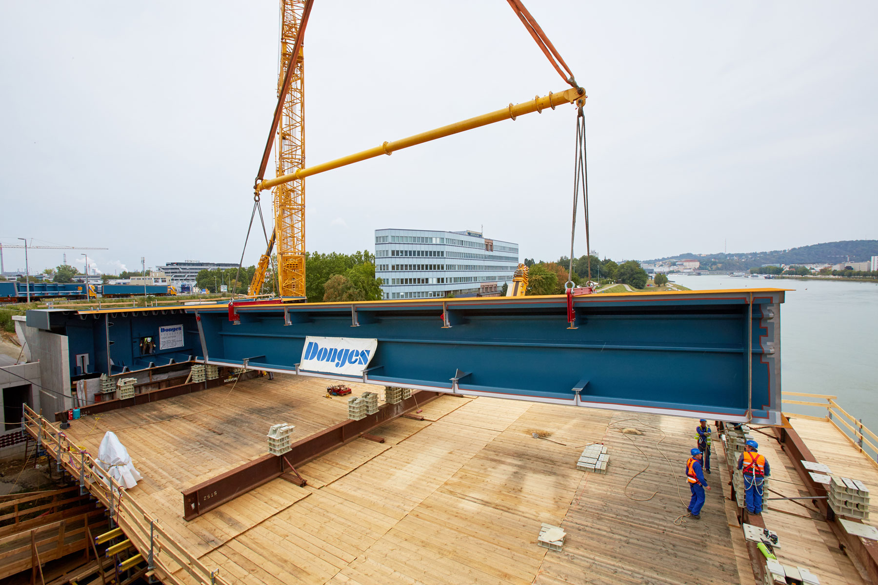 A Prangl összességében csaknem 20 géppel (mobildarukkal, szerelőkosarakkal és teleszkópos targoncákkal) lesz a helyszínen. Ki kell emelni továbbá az előzetes szerelés helyszínén lévő tandem emelőgépeket. Egy 500 tonnás és egy 350 tonnás teleszkópos daru akár a 100 tonnás építési elemet is kirakja és egy 2500 tonnás össztömegű, masszív tartószerkezetté építi össze. Egy speciális berendezéssel aztán ezeket a hídelemeket teherhajóra rakják, leúsztatják az adott építési területre, majd hidraulikus módon beemelik.